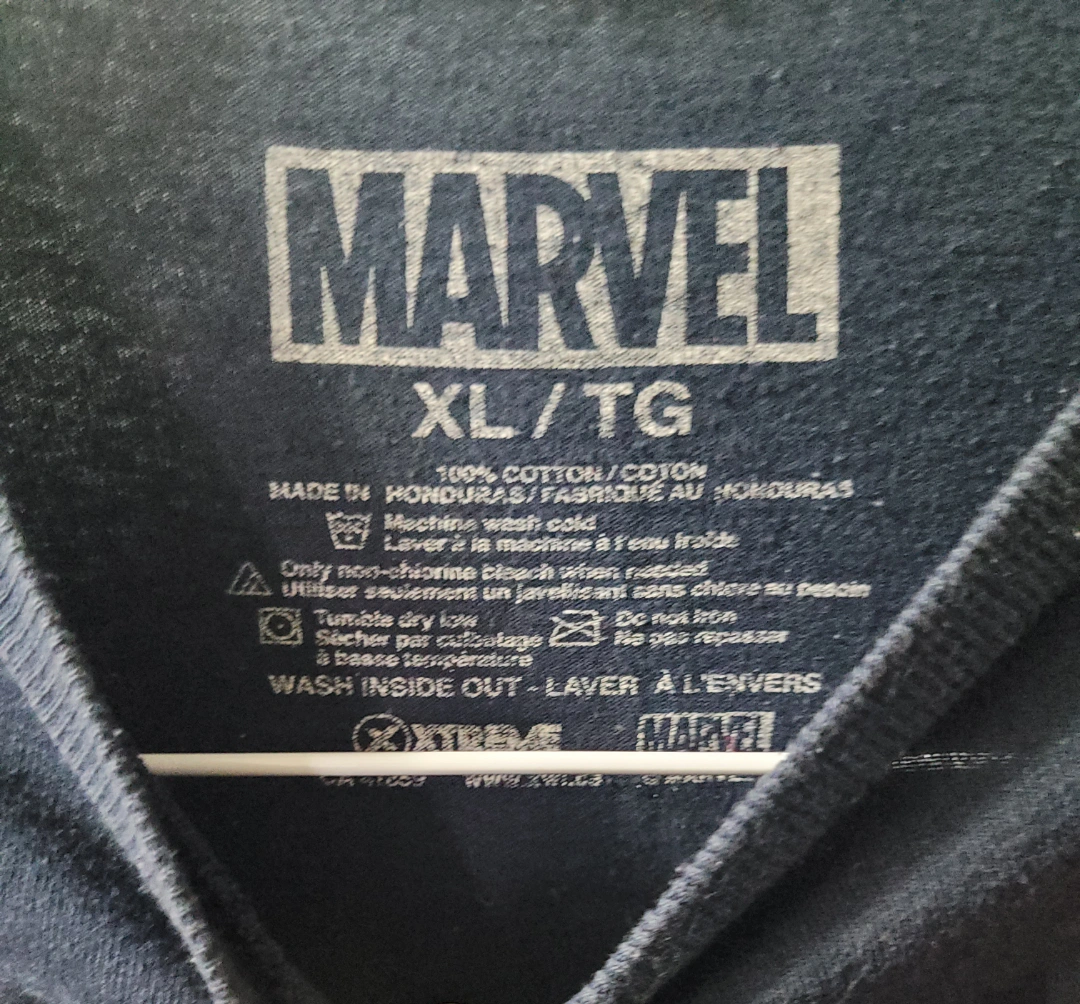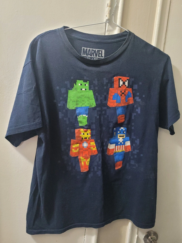Blue t-shirt with a pixelated image of Hulk, Spiderman, Iron Man and Captain America. Made in Honduras. Size XL/TG. 100% Cotton. Machine wash cold.