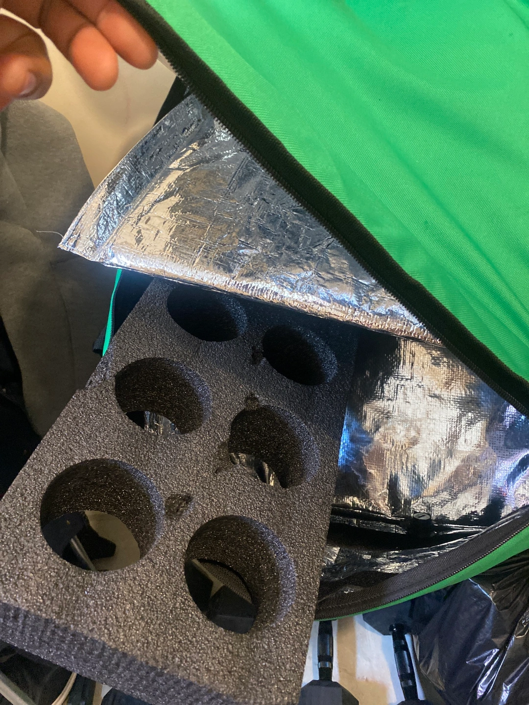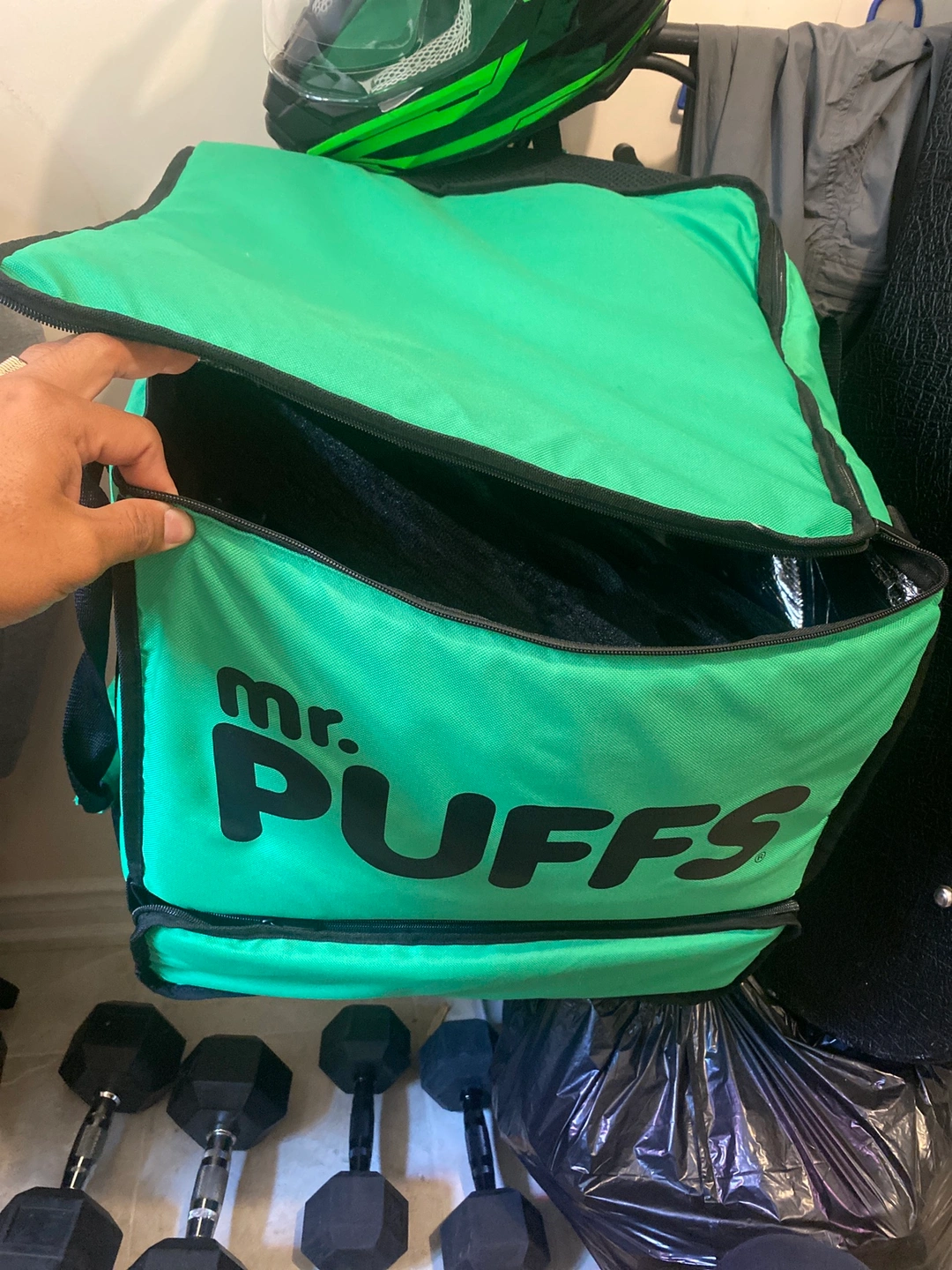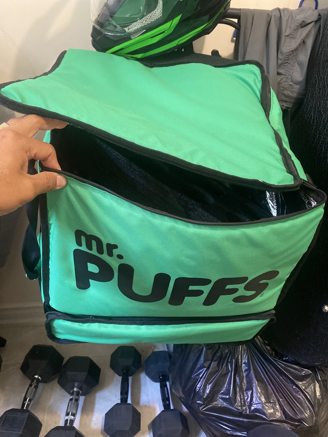 Green delivery bag with Mr. Puffs logo. Has insulated interior. The bag has a zipper closure.