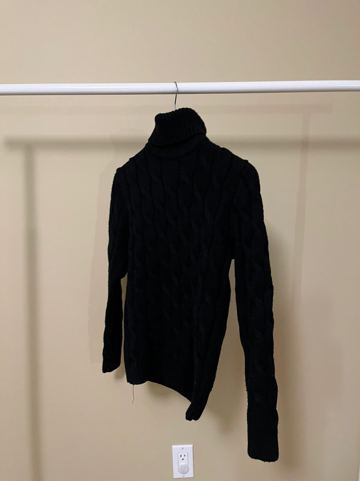 Cable knit sweater with a turtleneck. The sweater is a medium weight. It is a classic piece that can be dressed up or down. Pick up only.