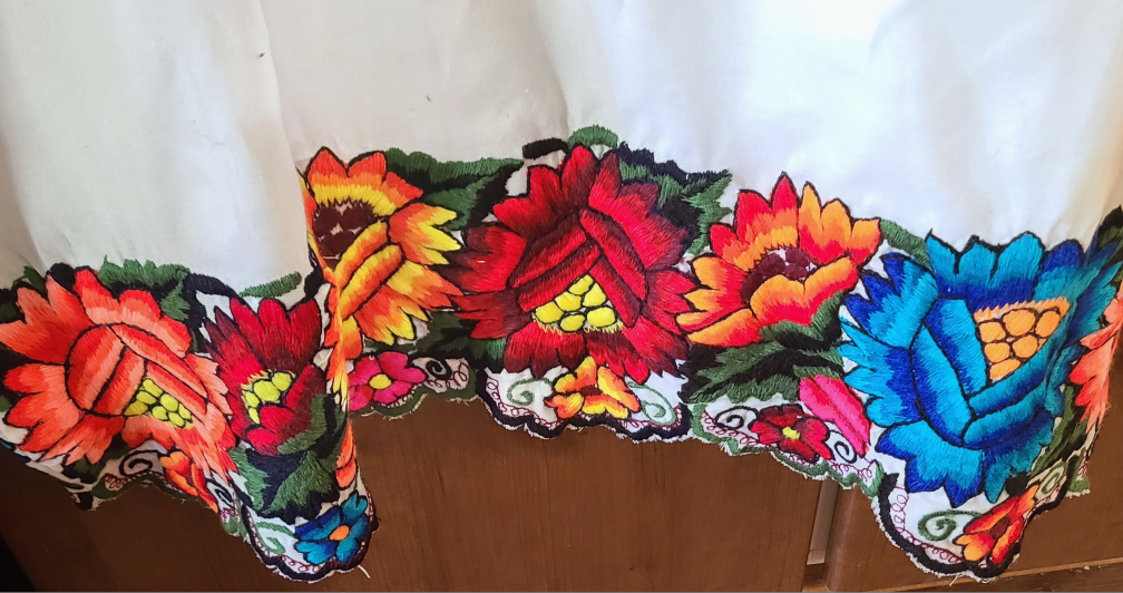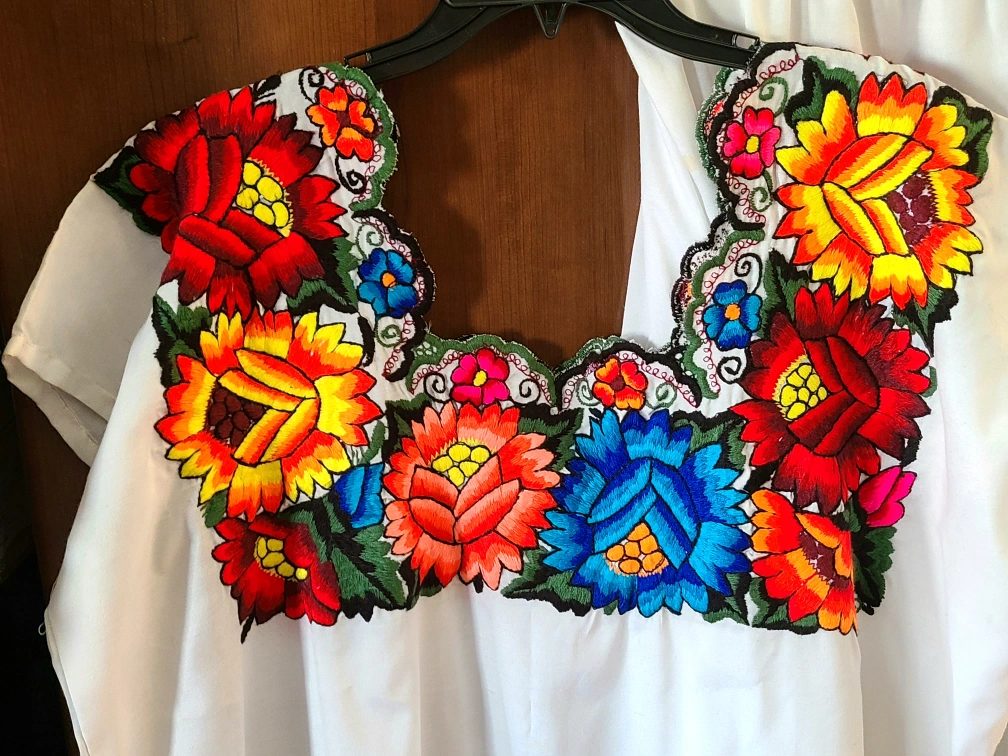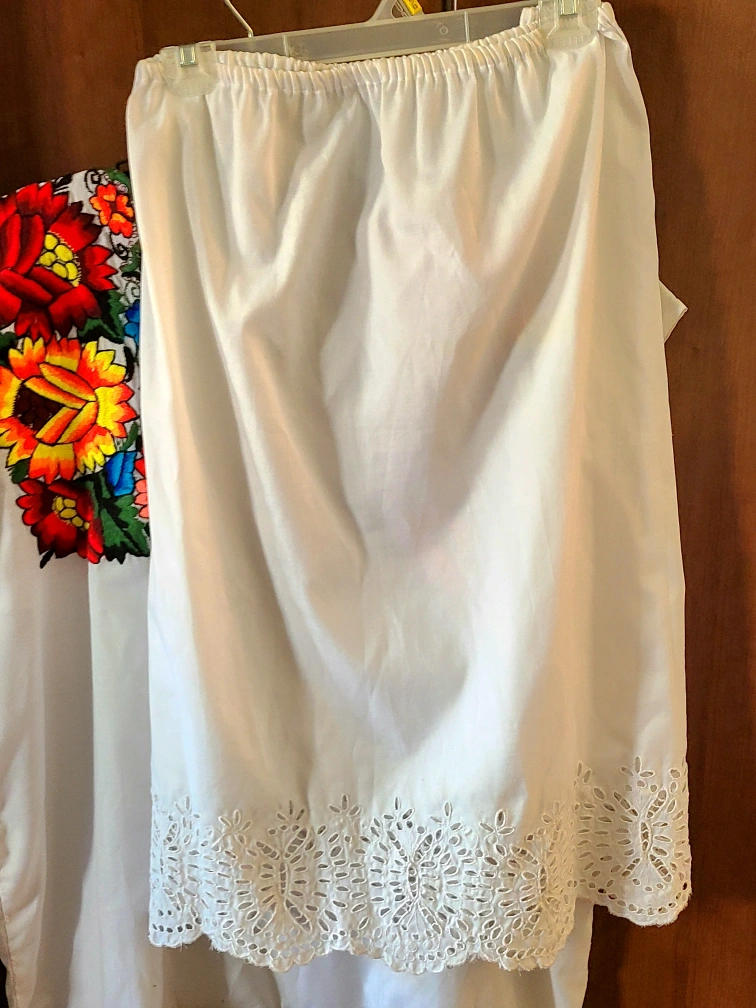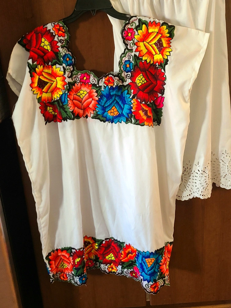 A beautiful Mexican embroidered white blouse and skirt set. The blouse has colourful flowers embroidered around the neck and the bottom of the blouse. The skirt has an embroidered lace border around the bottom of the skirt. The skirt is a pull-on style. Would be perfect for a special event!