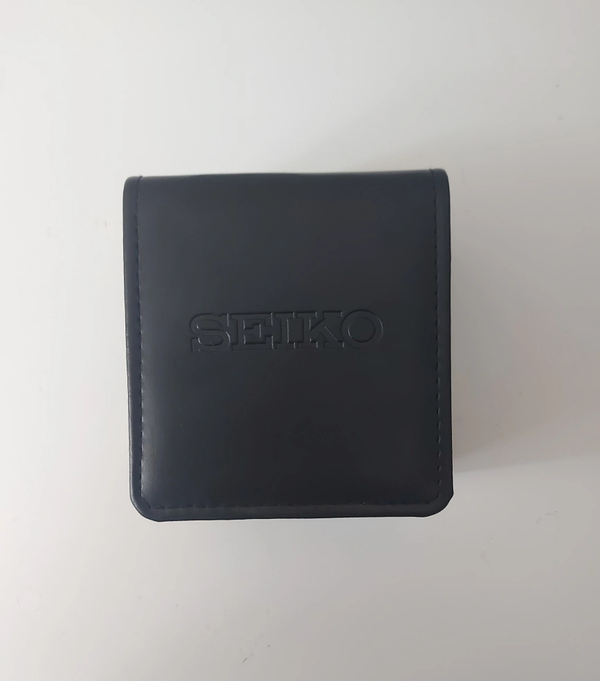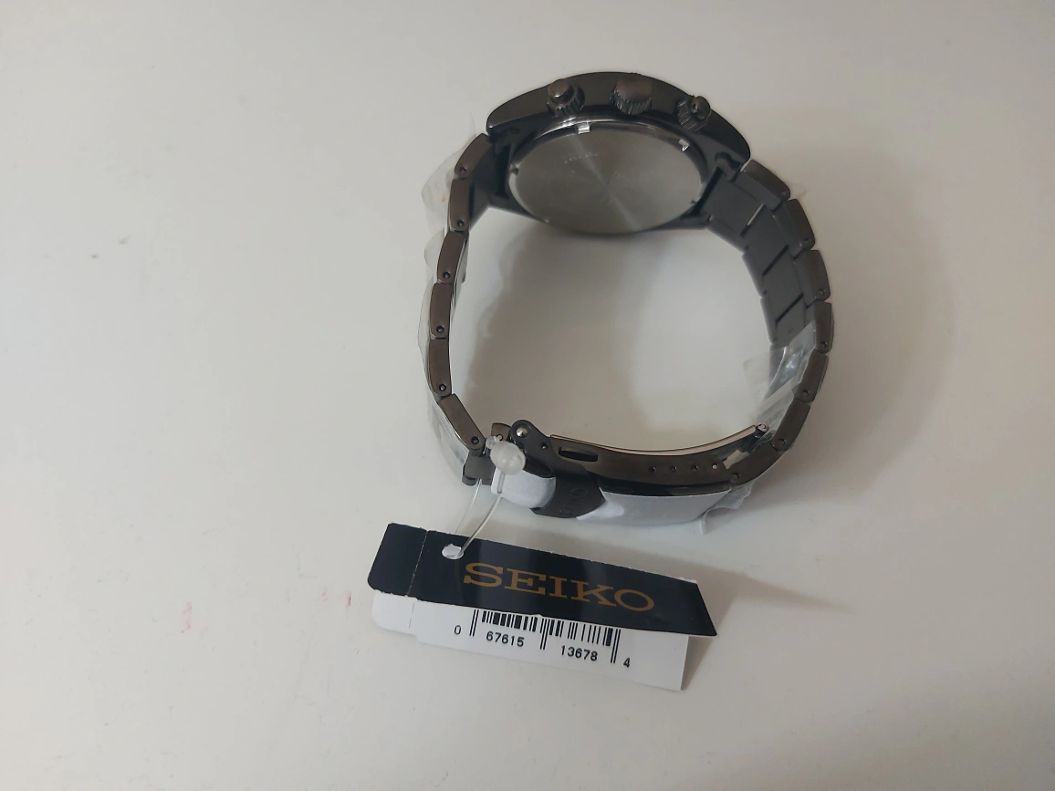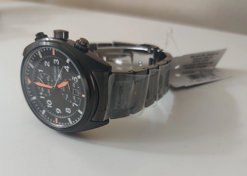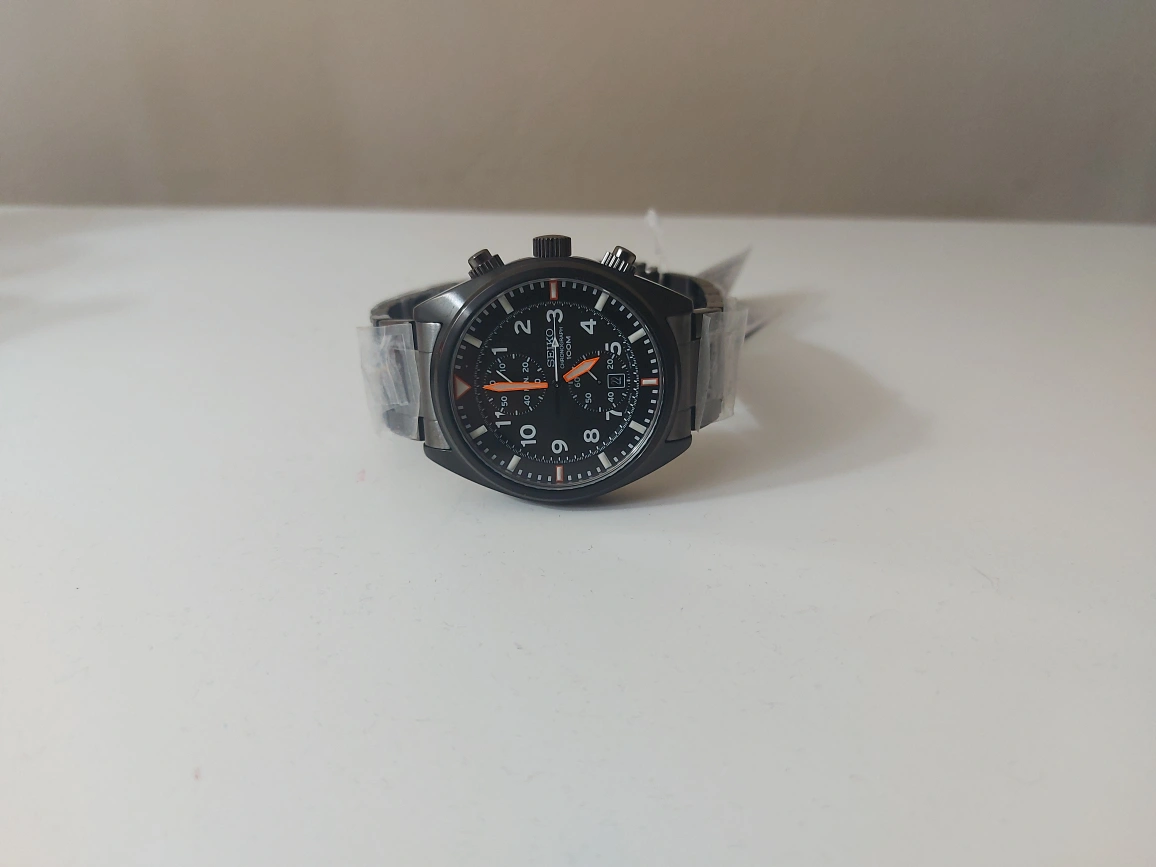 Black chronograph watch with a stainless steel band. This watch is powered by a quartz movement and features a date window at the 4 o'clock position.