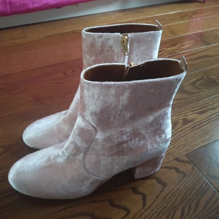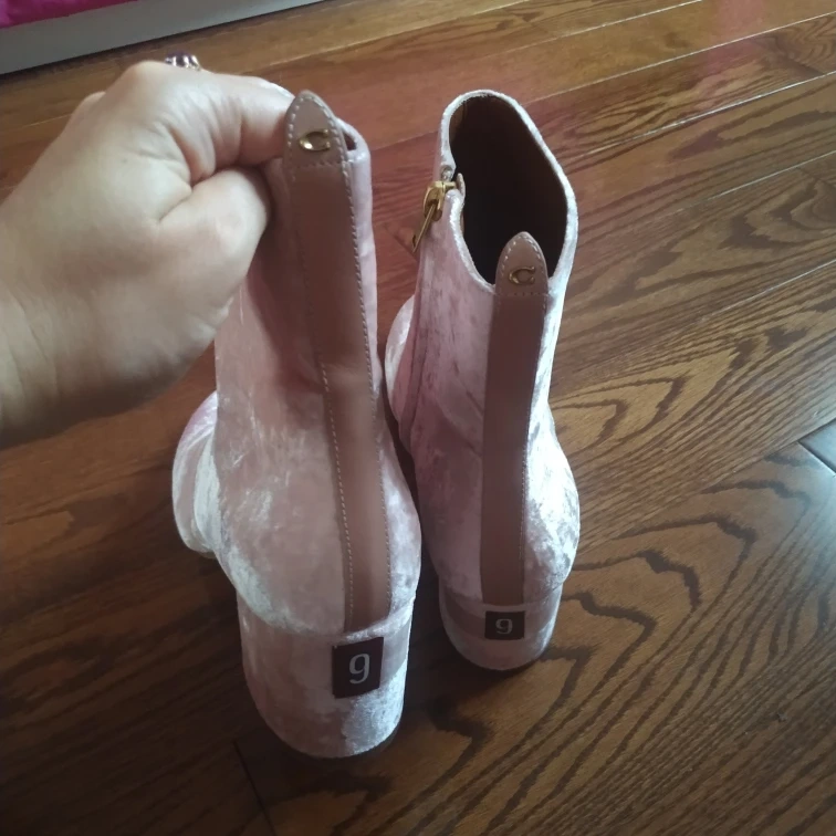 These are a pair of coach pink velvet ankle boots with a gold zipper. They are in a size 9. They have a block heel.