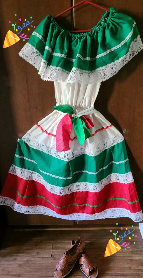 This is a traditional Mexican dress with green, white, and red colours. It has lace trim and comes with a belt. The dress is in a vintage style.