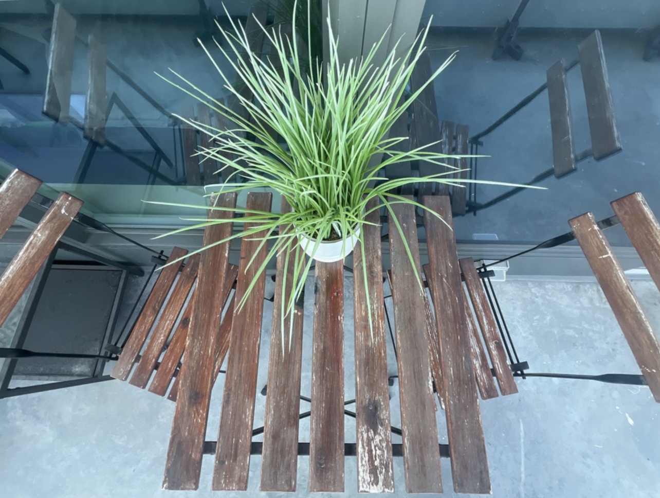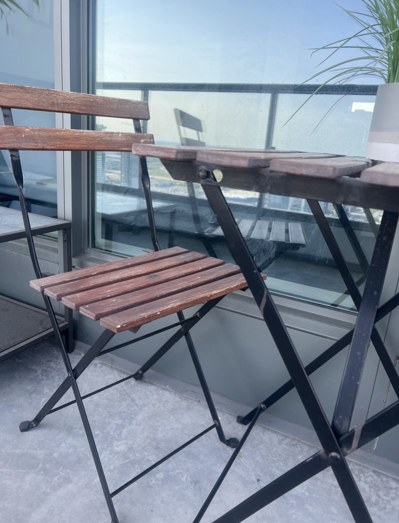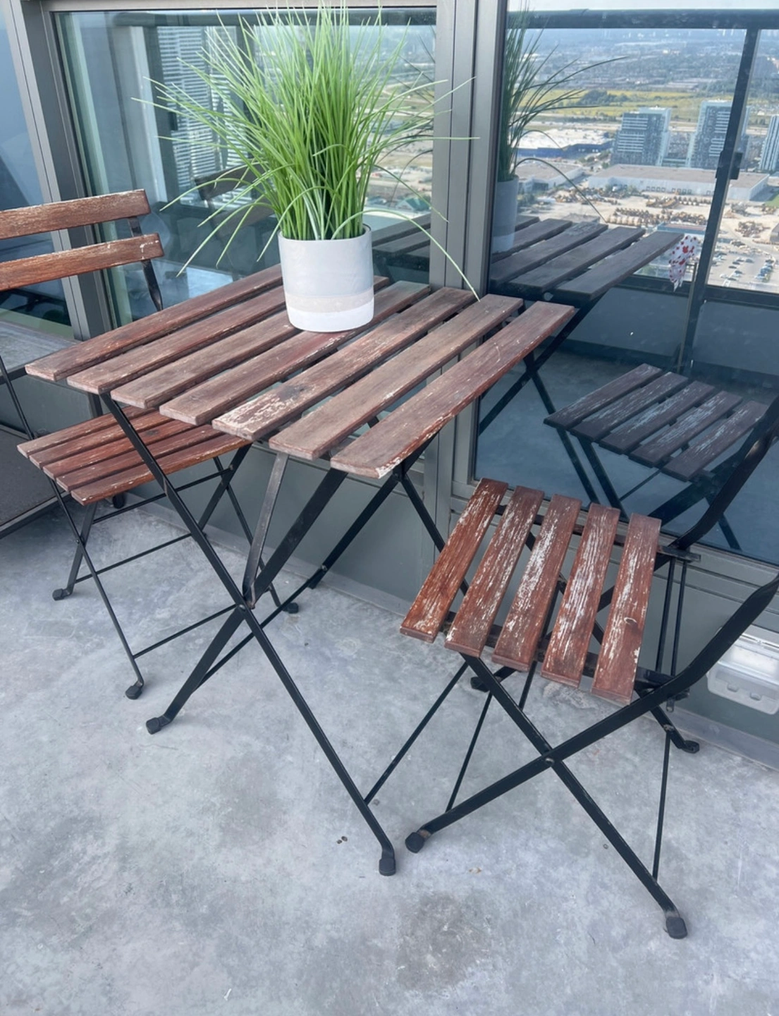 The table and chairs fold up for easy storage. They are made of wood and metal.