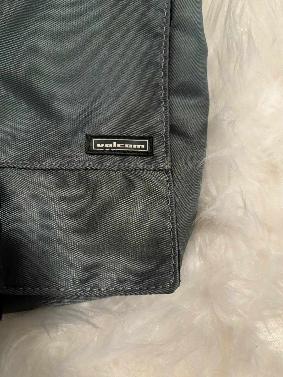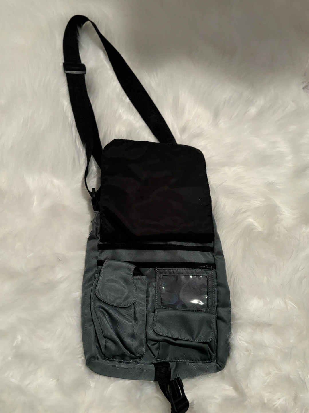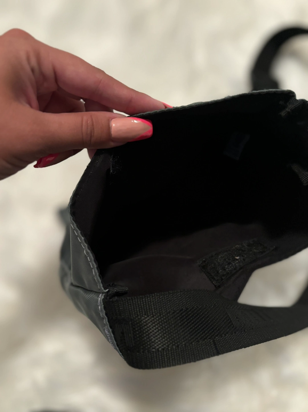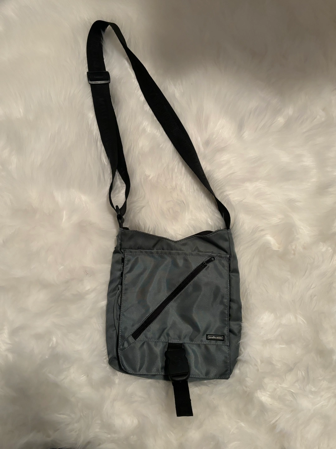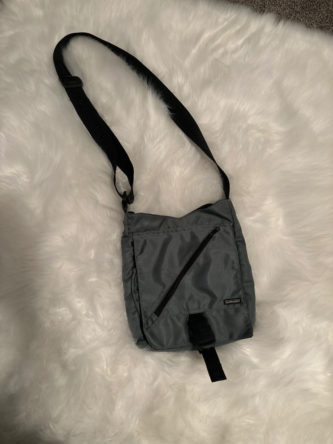 Small grey crossbody bag with black strap and a zippered pocket on the front. Pet & Smoke Free Home.