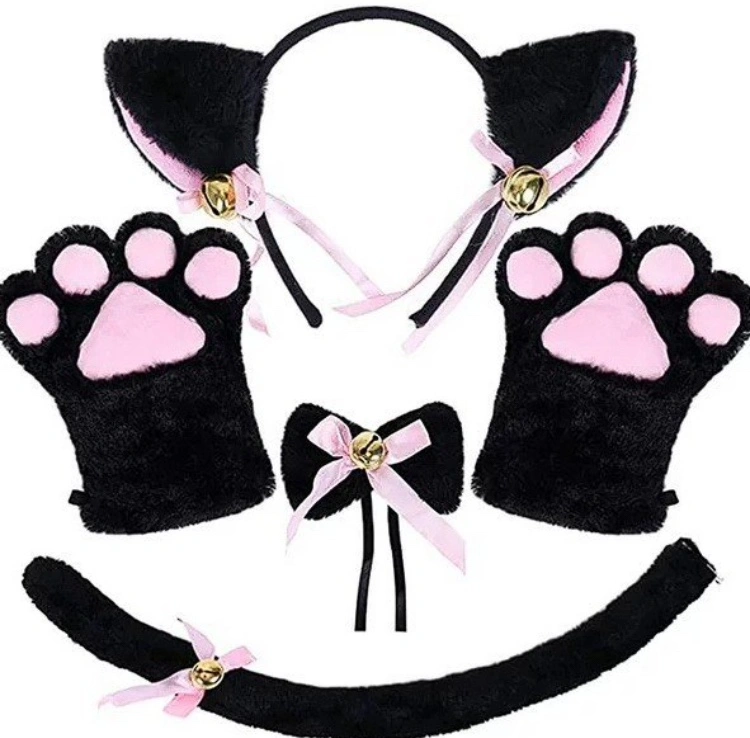 Black cat accessory set. Includes cat ears headband, tail, paws, and bow tie. Great for costume parties or photo shoots.