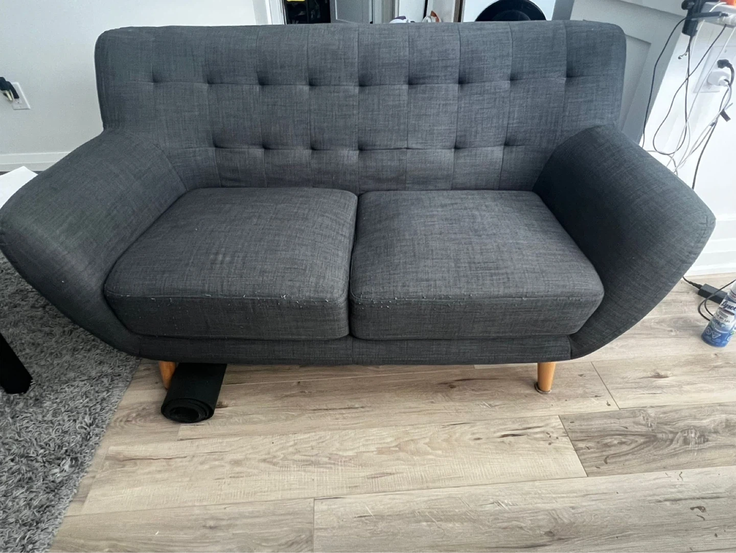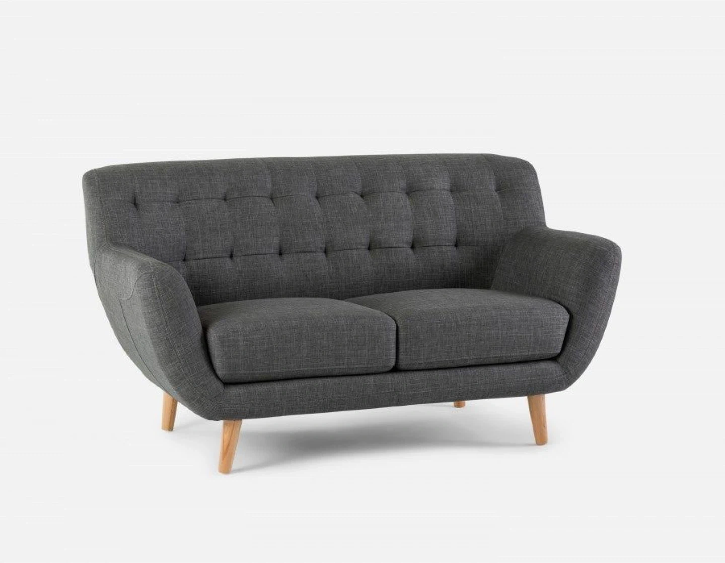 This is a two-seater sofa upholstered in a dark grey fabric. It features a tufted backrest and tapered wooden legs. Overall dimensions are 61" W x 33" D x 32" H. Seat depth is 22" and seat height is 18".