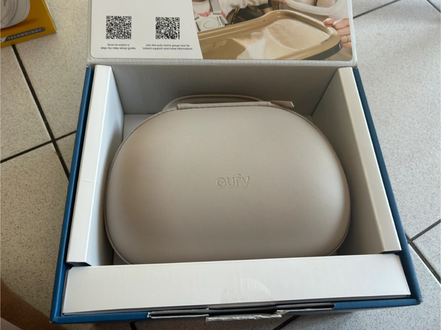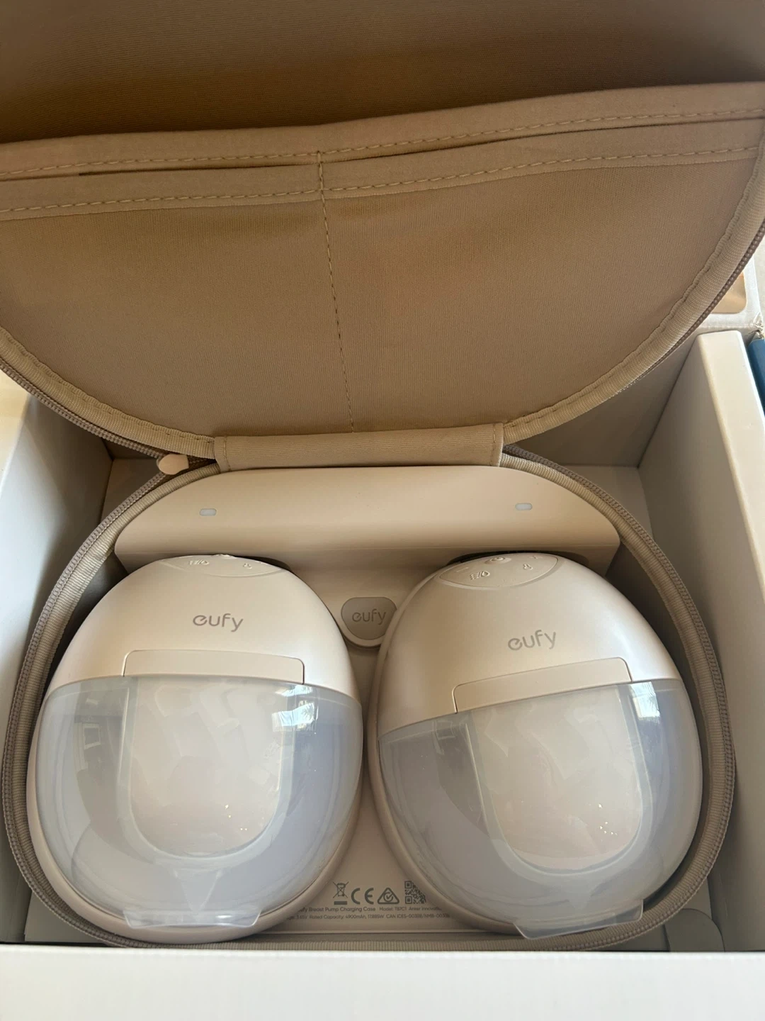 This is the Eufy Wearable Breast Pump S1 Pro. It's designed for discreet and comfortable pumping. It comes with the main pump units and a charging case.