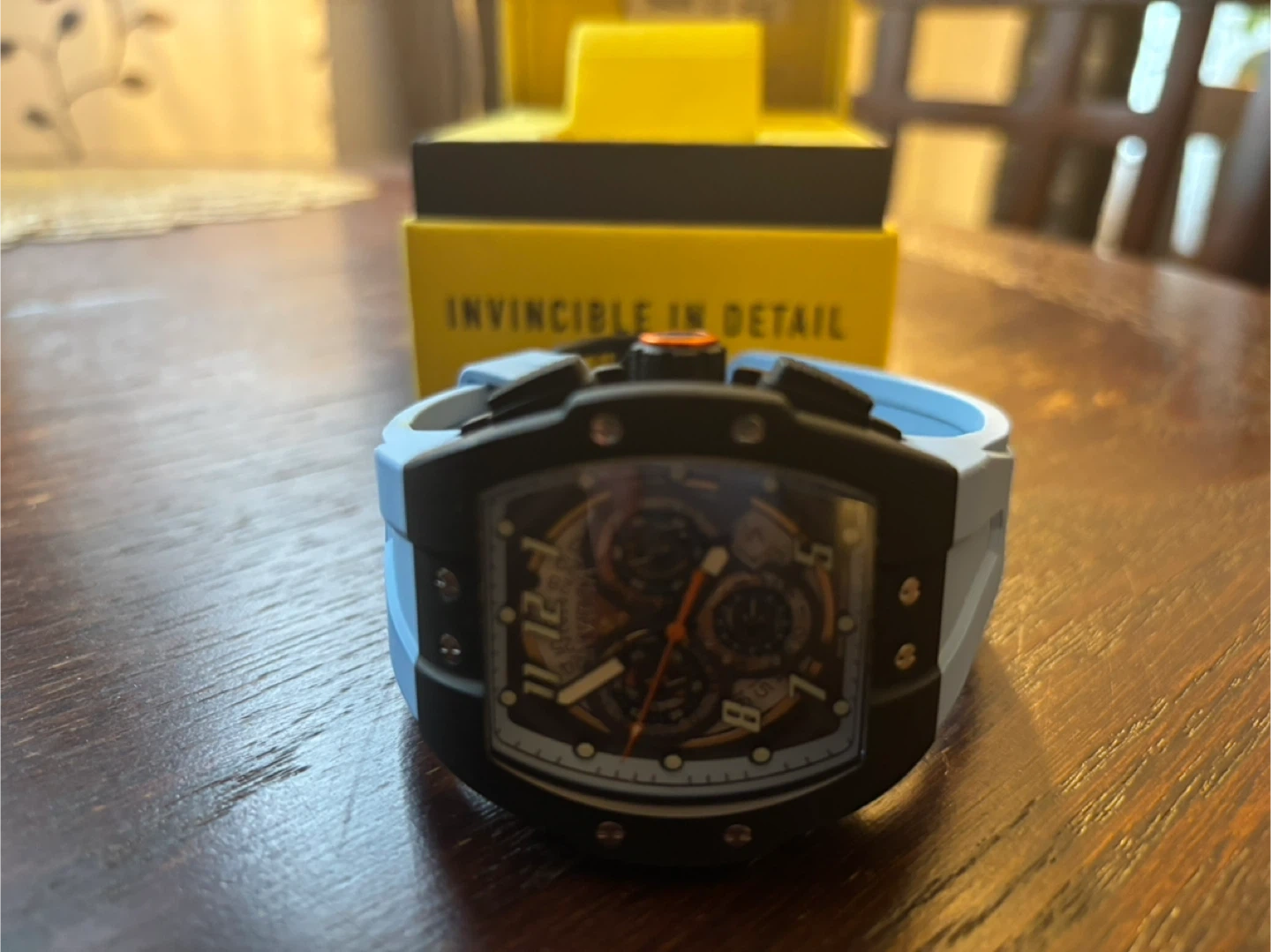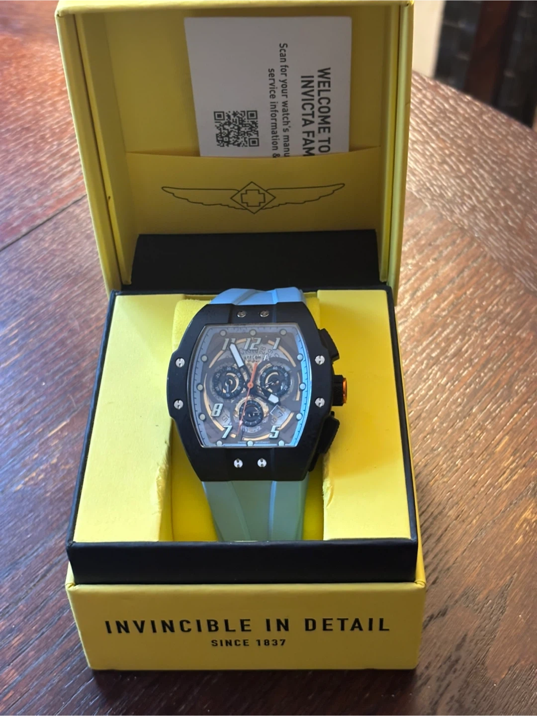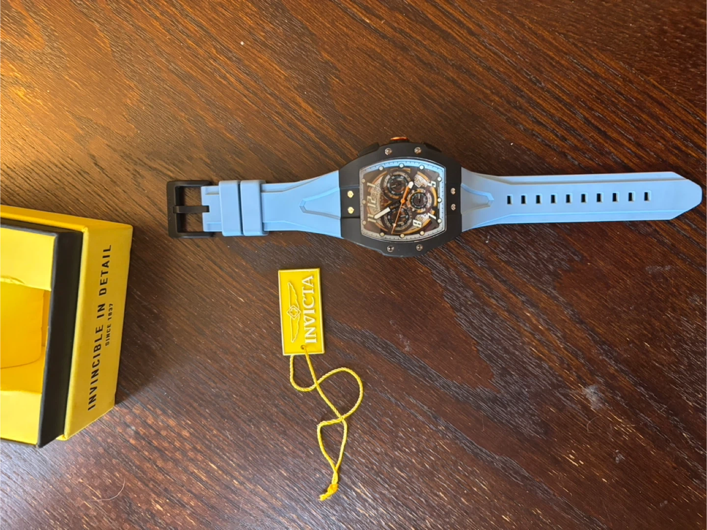 Invicta chronograph watch in original box. Yellow case with a light blue silicone strap. Includes welcome card and tag. Swiss movement.