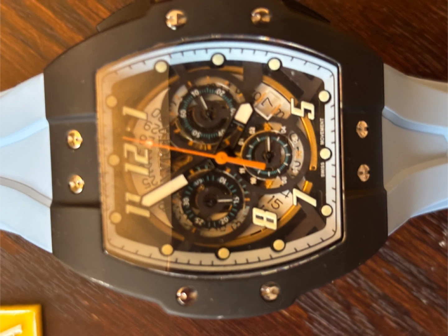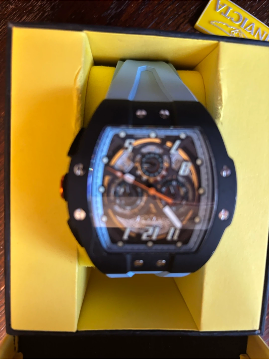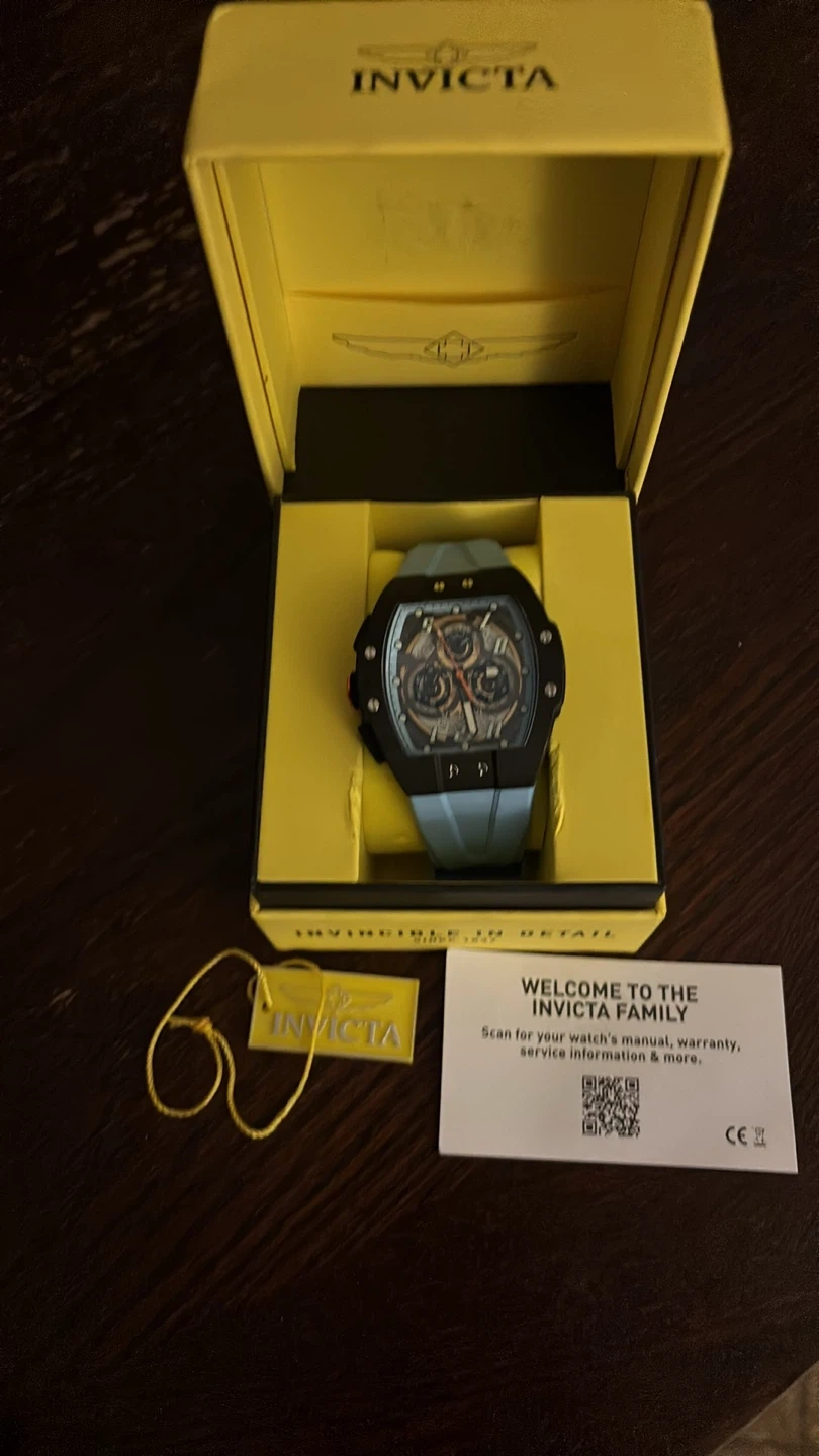 Invicta chronograph watch in original box. Yellow case with a light blue silicone strap. Includes welcome card and tag. Swiss movement.
