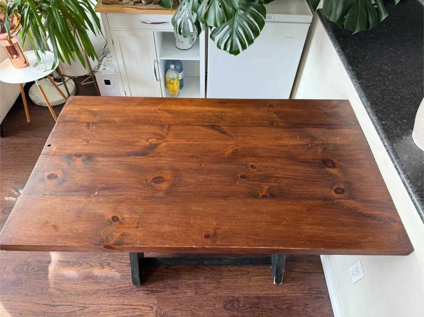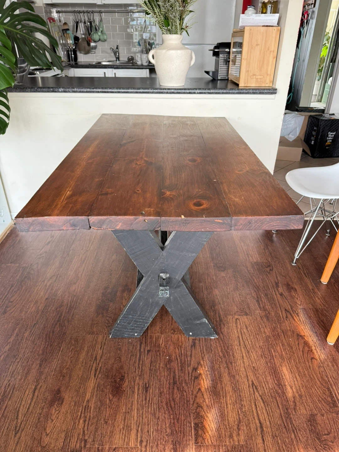 Solid wood dining table with a dark stain finish. It features a distinctive X-shaped base in a contrasting black colour. This table's sturdy construction makes it suitable for everyday use. It's a great size for smaller dining spaces or kitchens!