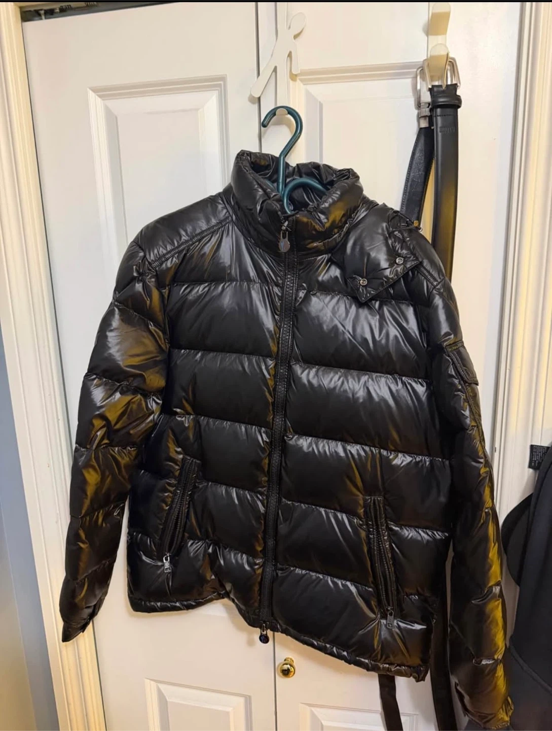 Shiny black puffer jacket by Moncler. Hooded style with zippered closure and pockets. Size 3.