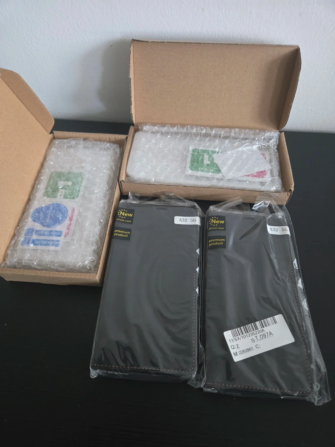 Two black premium phone cases are available. 4 cases in total. They're designed for the Samsung A32 5G model. Includes cleaning wipes.
