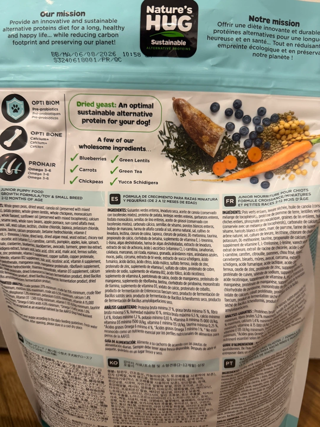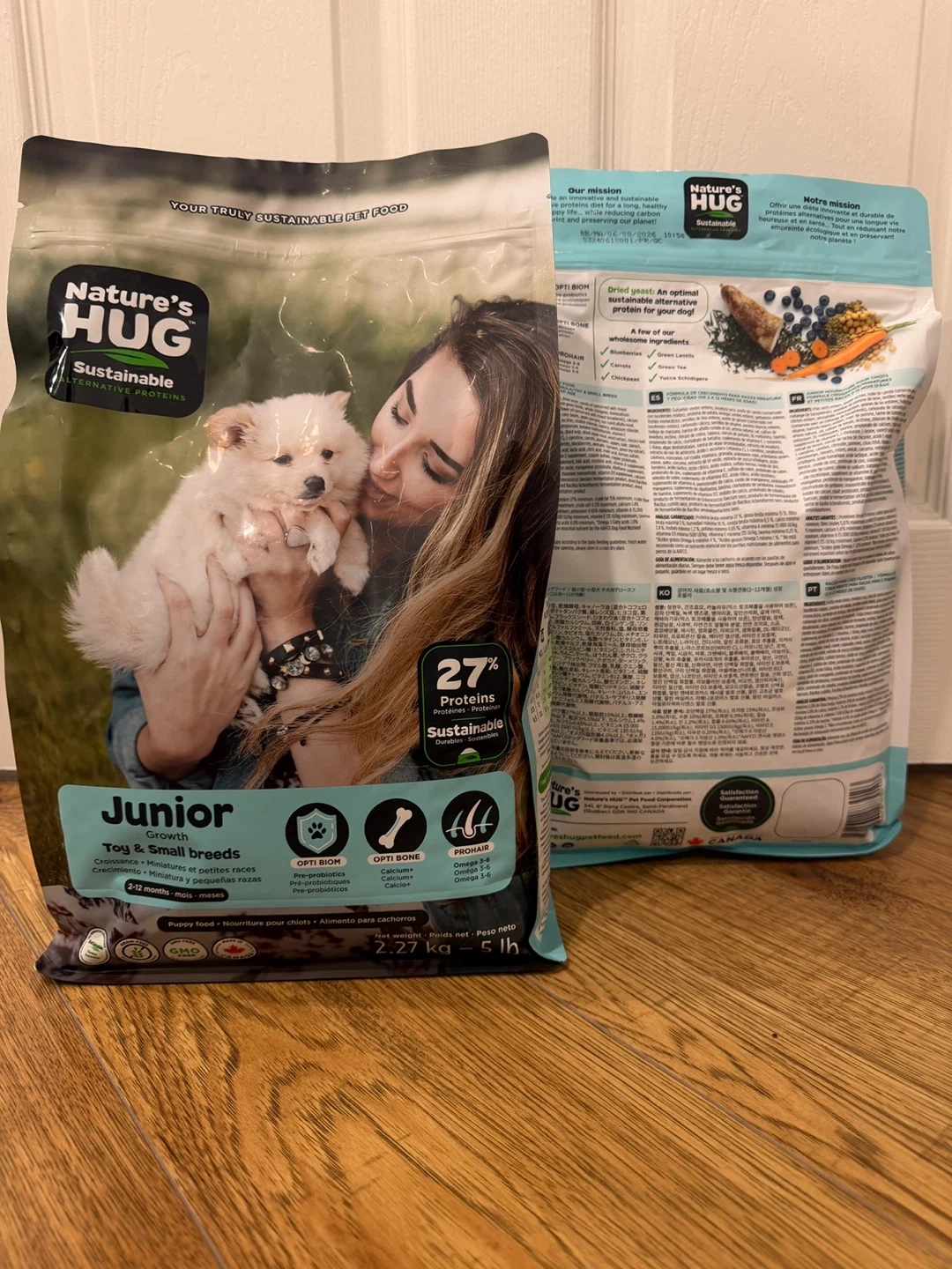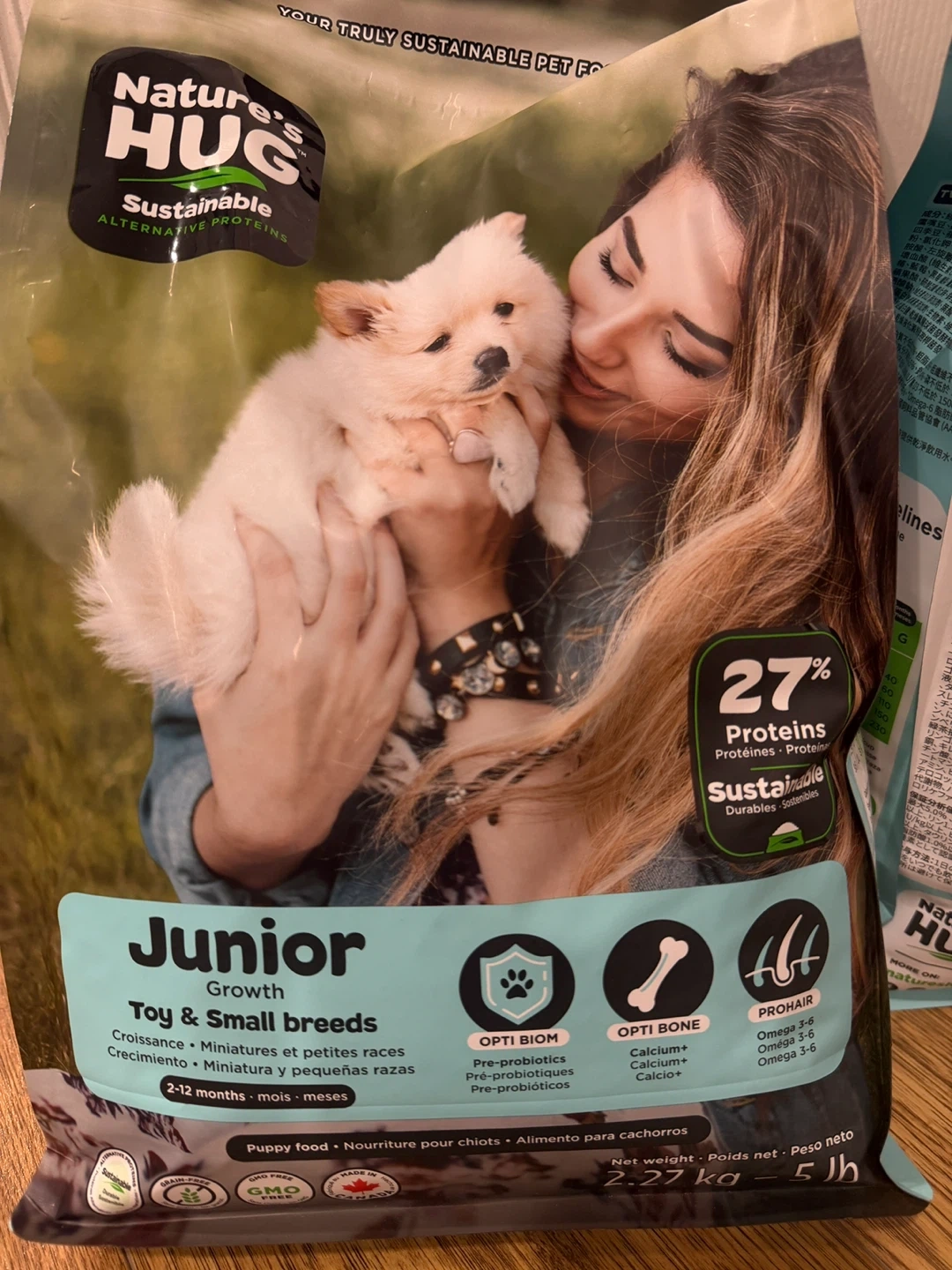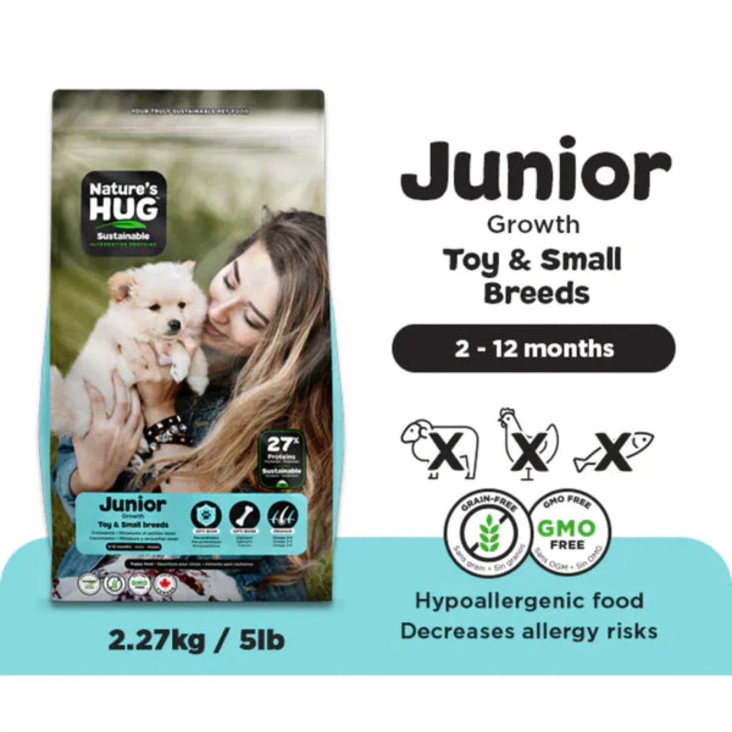 Nature's Hug Junior puppy food for toy and small breeds is formulated for growth. It contains 27% protein and supports bone and skin health. This grain-free, GMO-free formula is suitable for puppies aged 2-12 months.