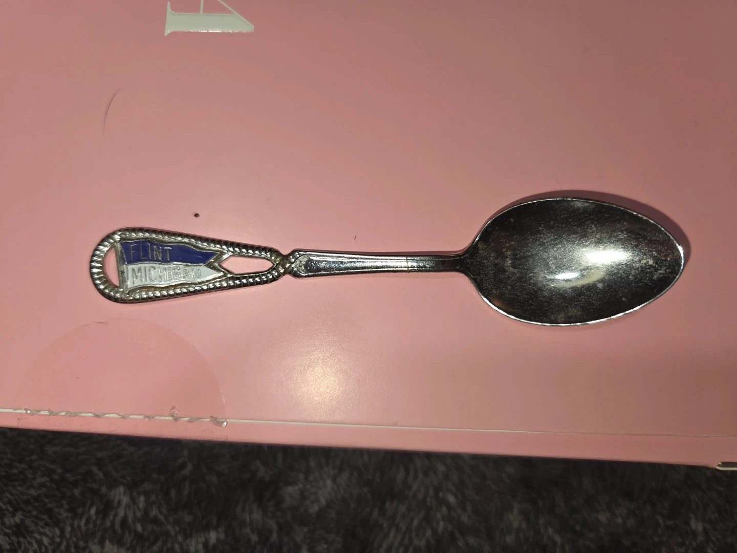 This is a souvenir spoon from Flint, Michigan. It's made of metal and has a decorative handle with enamel detailing. It's a great memento for collectors or for someone who loves Flint.