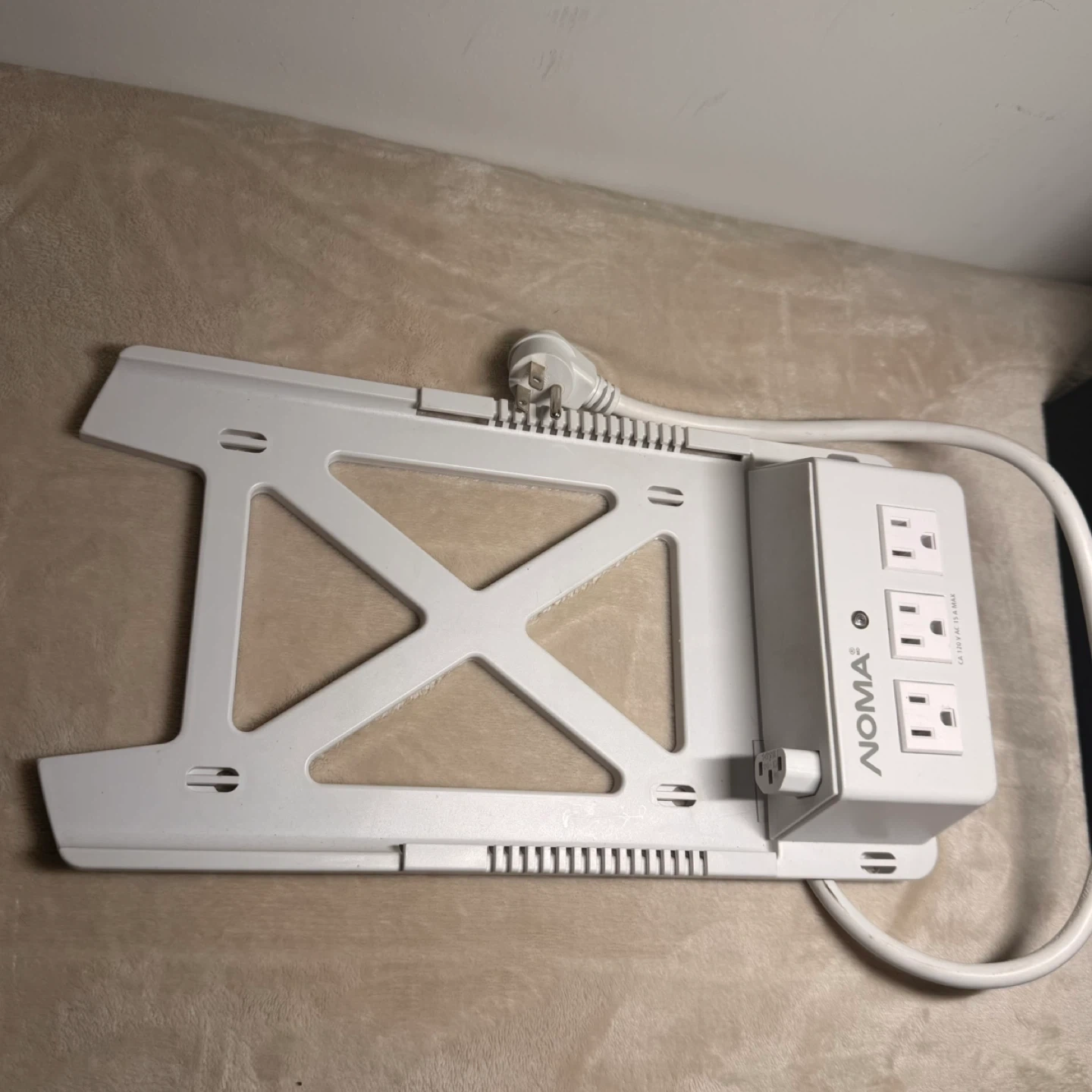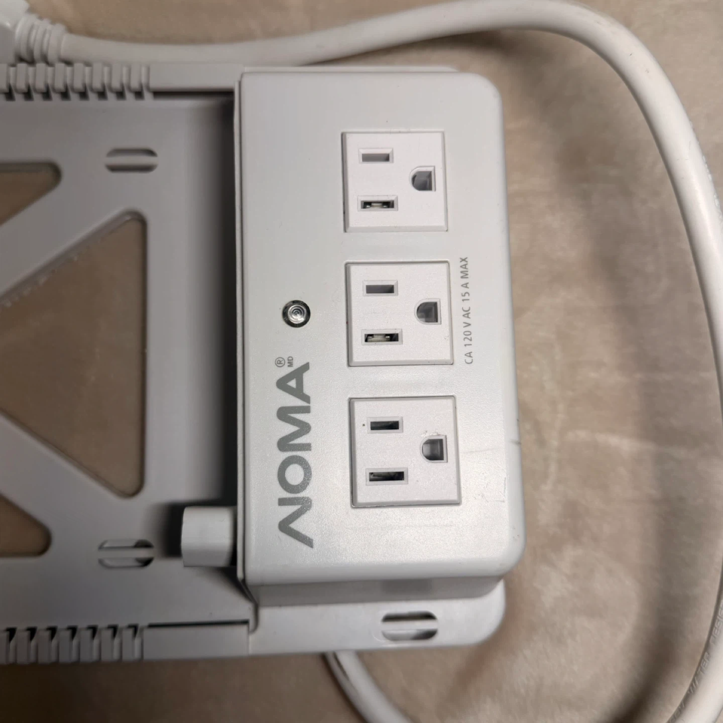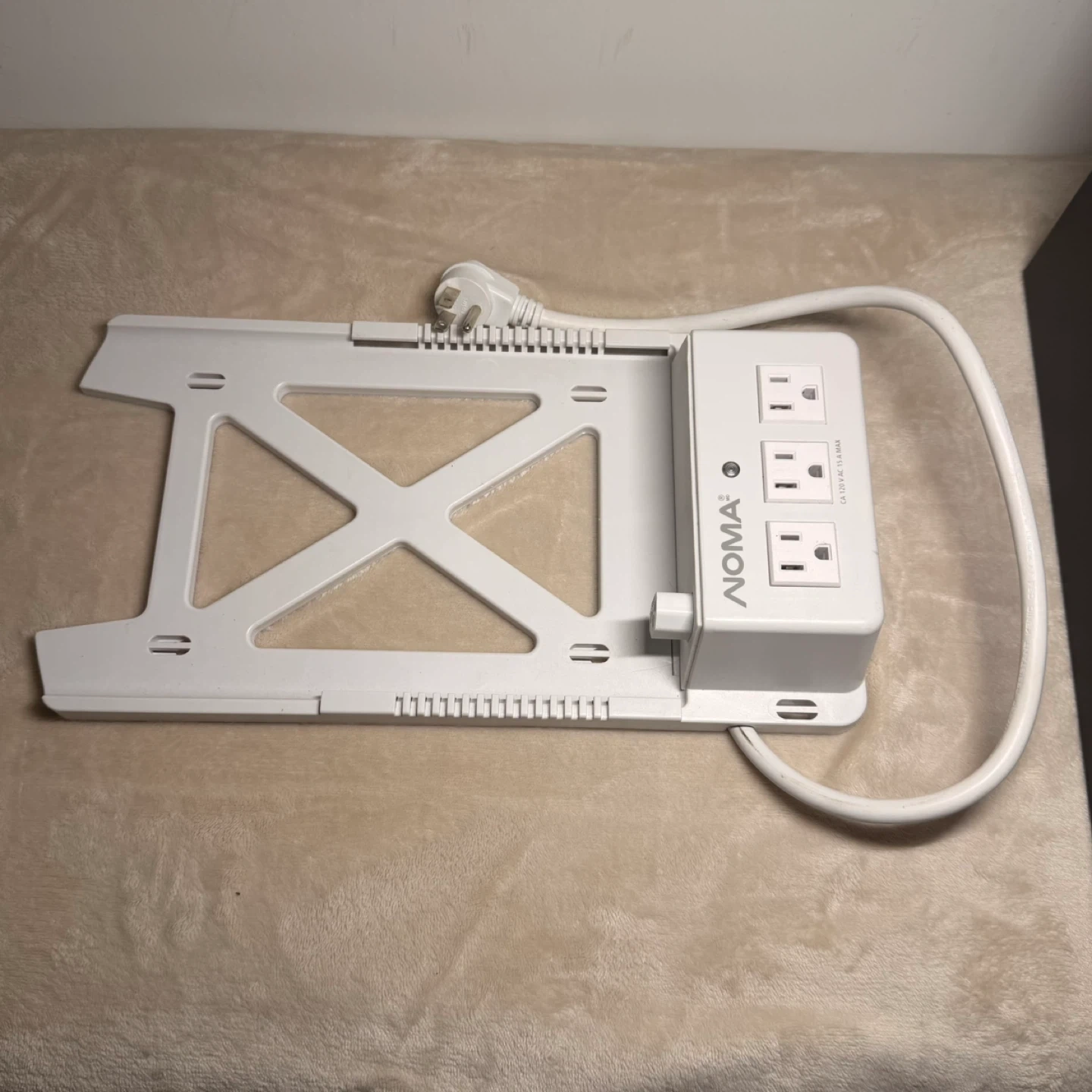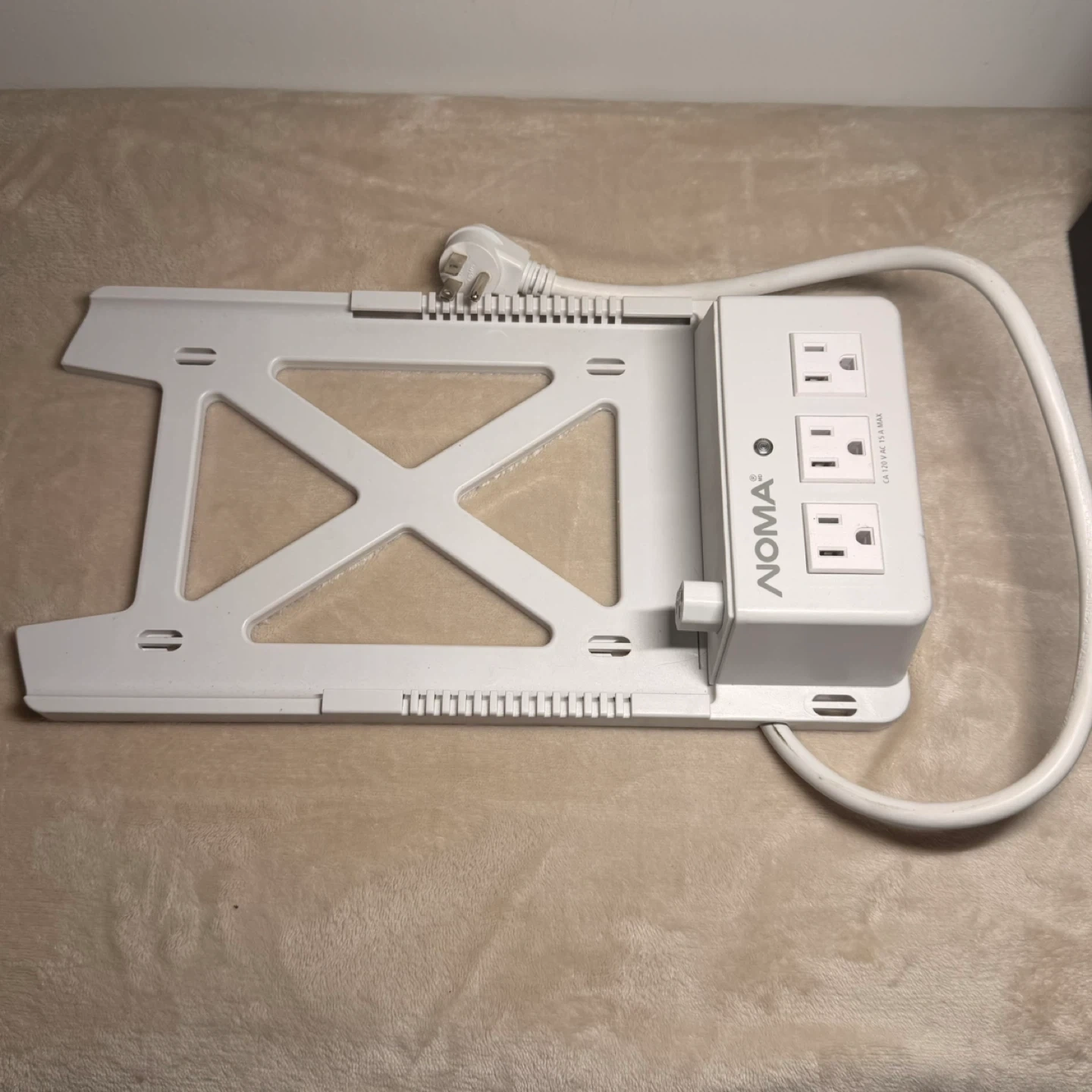 This Noma power bar has three outlets and a unique mounting bracket. It's designed for easy installation and organization. The unit is rated for 120 V AC, 15 A max. NOMA under cabinet power strip with mounting bracket.