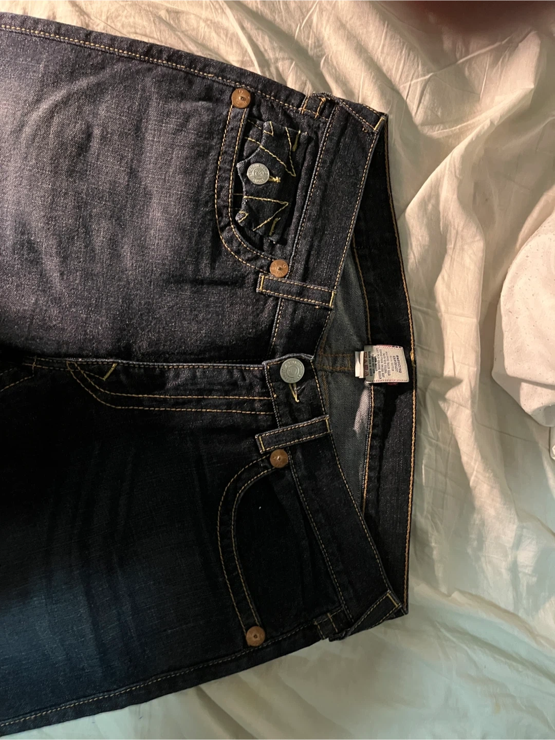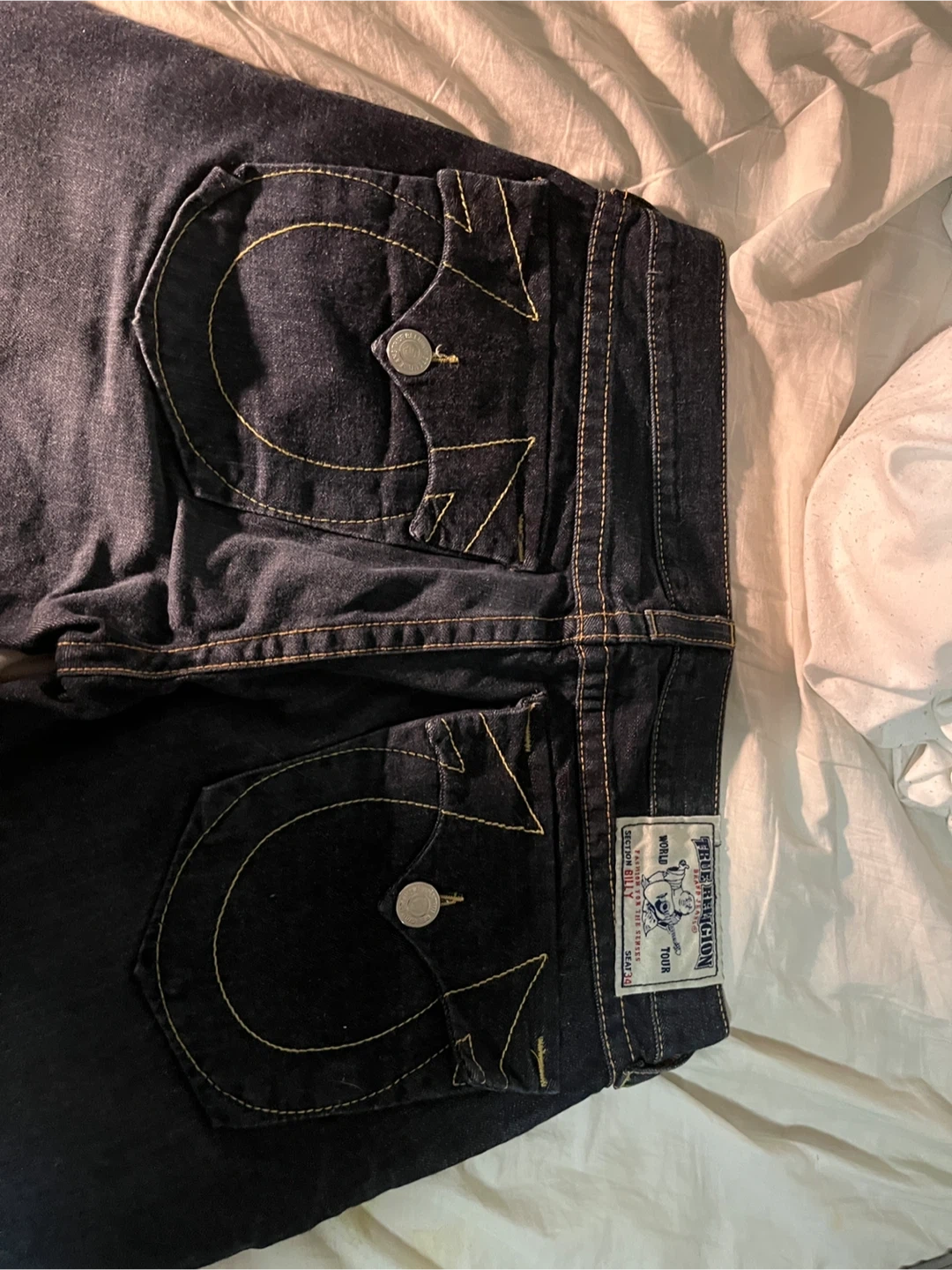 True Religion Billy jeans in a size 34. These are dark wash denim with yellow stitching detail. They feature the iconic Buddha logo on the back pocket.