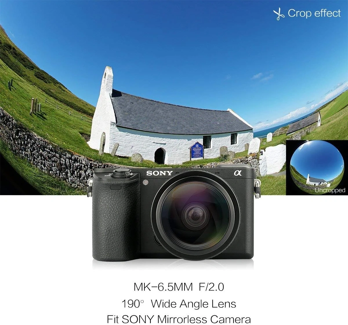 This is a 6.5mm fisheye lens with a 190° field of view, designed for Sony E-Mount mirrorless cameras. It features an f/2.0 aperture for excellent low-light performance. Manual focus and aperture control are available. It's an APS-C lens that creates a circular or full-frame fisheye effect depending on the camera body. Perfect for capturing unique perspectives and dramatic shots!