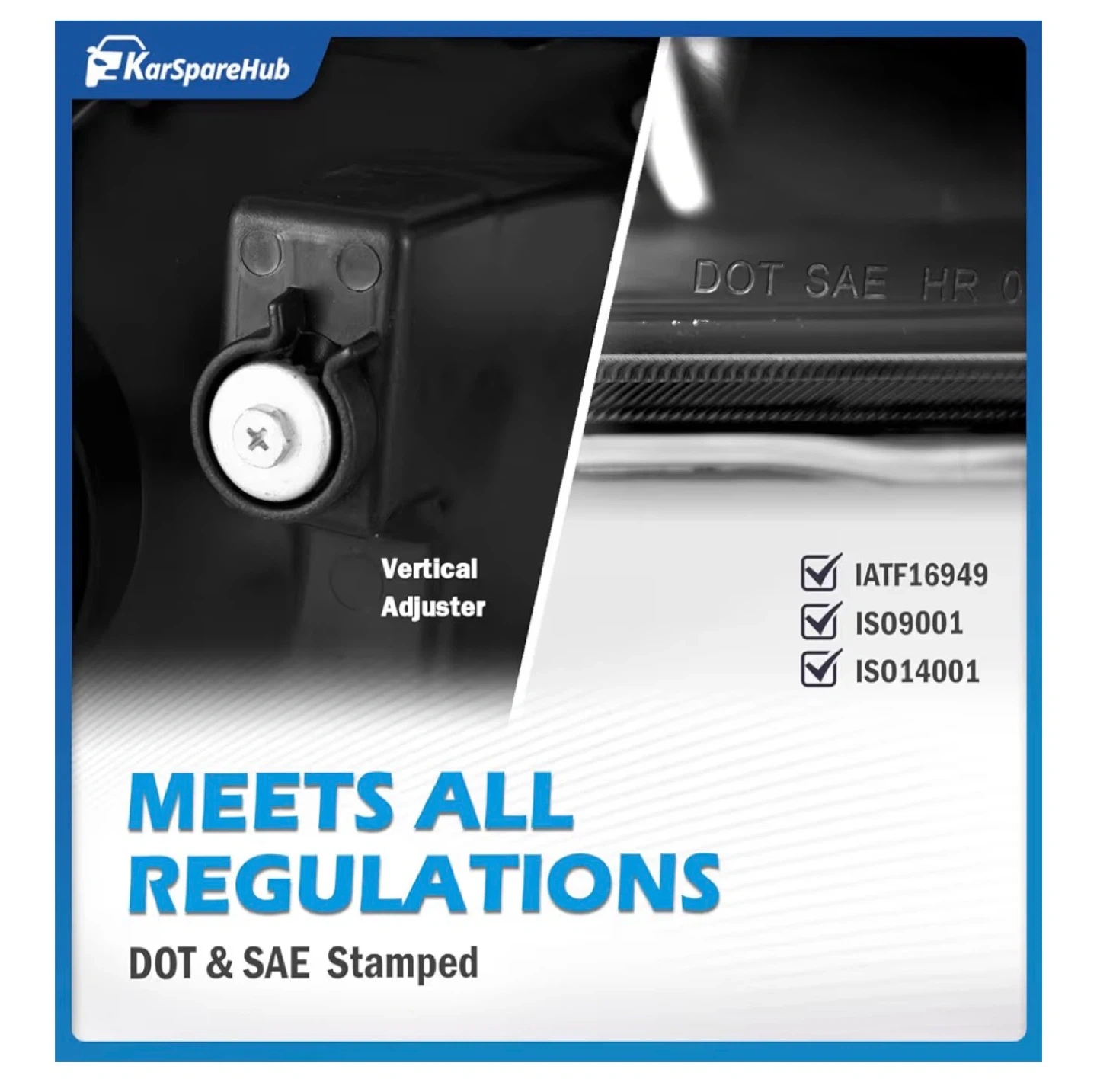 These headlights feature a matte black housing and come with H4 bulbs. They have a breathable film to eliminate fogging and a reflector bowl with nanoscale plating. The premium housing is made of polyacrylate + 20% fiber, and the assembly includes a vertical adjuster. They are DOT & SAE stamped and meet all regulations.