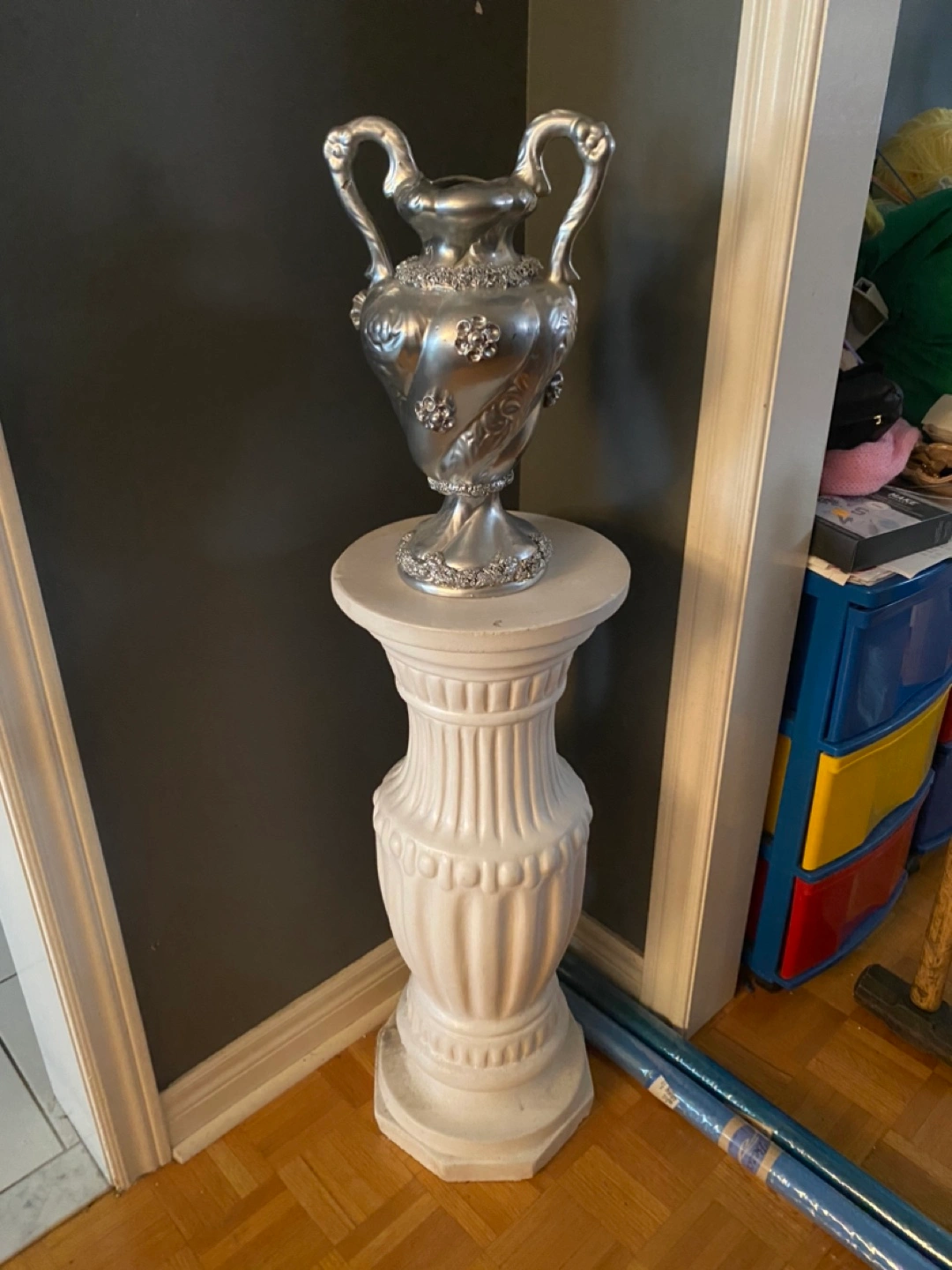 A lovely silver urn vase. Features decorative details. Sits on a white column pedestal base. Place fresh flowers inside and breathe easy.