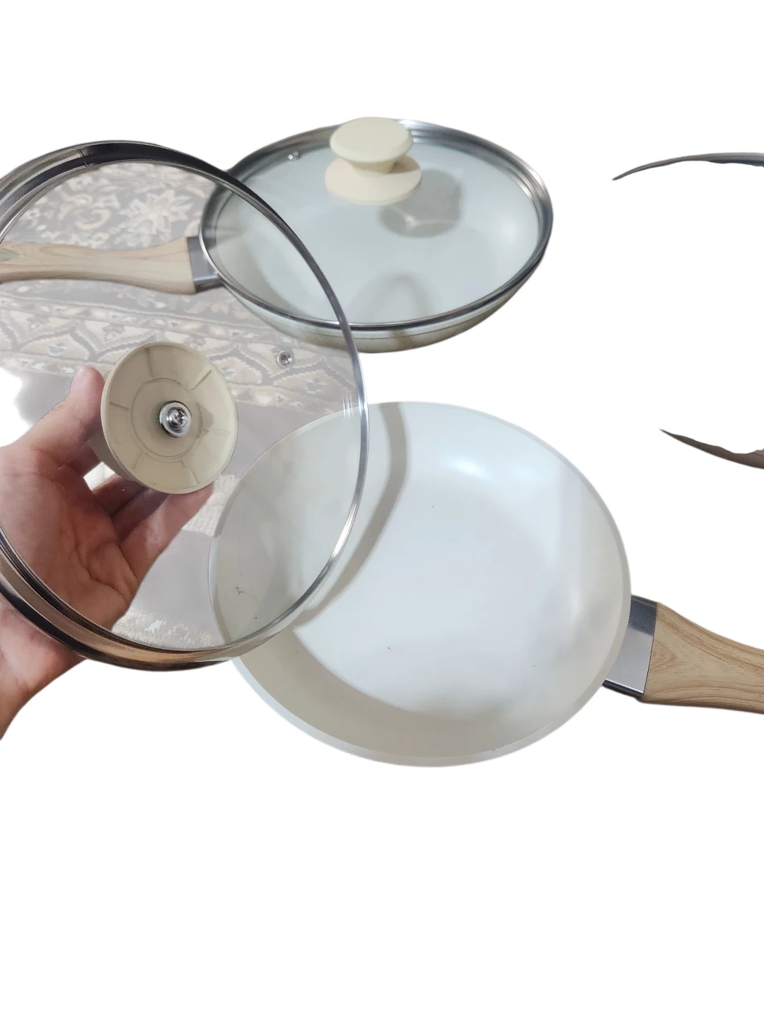 This set includes three non-stick frying pans, each with a clear glass lid. They have light-coloured wooden handles and are made of durable material. This set is great for everyday cooking needs!