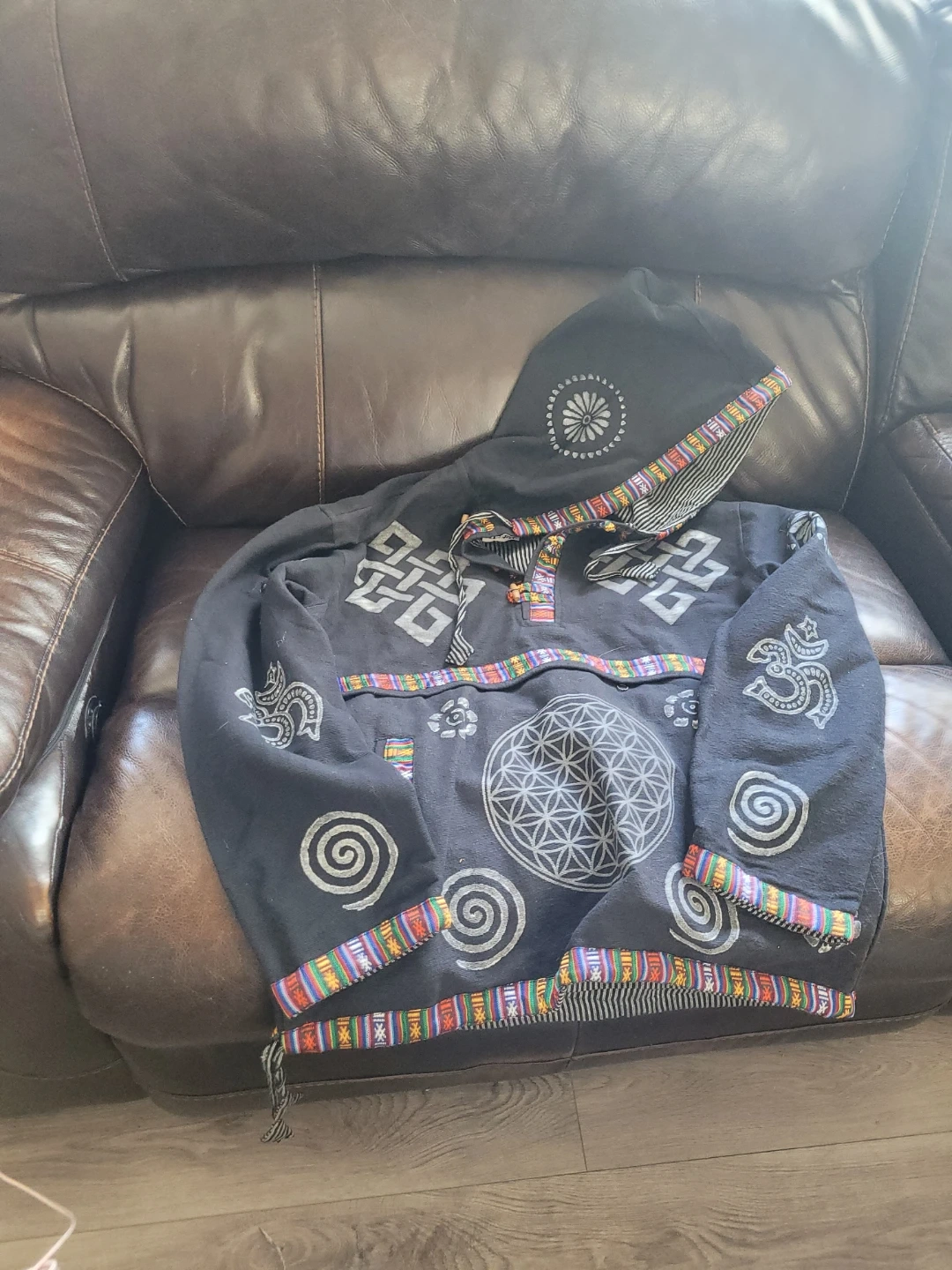 This black hoodie features a unique graphic print with a celestial design. It has colourful woven trim along the hood, hem, and cuffs. It's a comfortable pullover style with a front pouch.