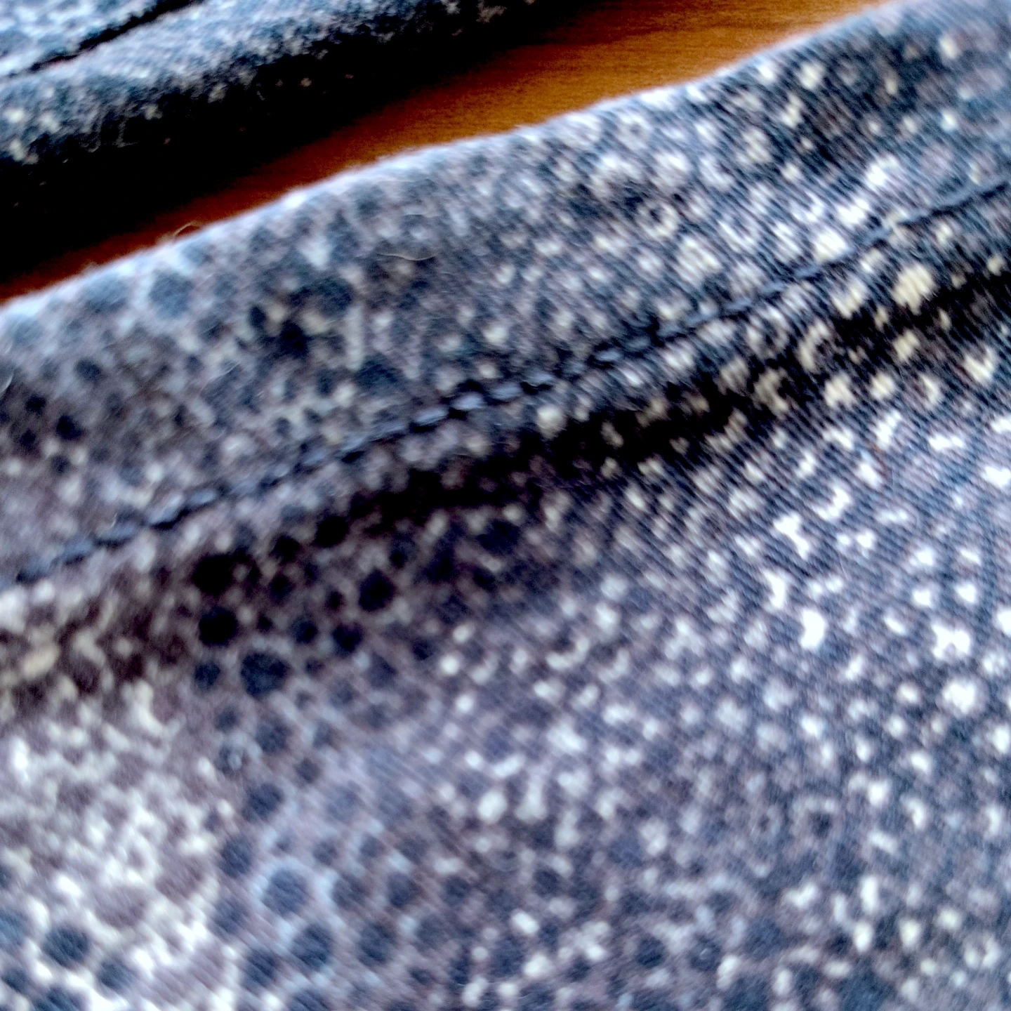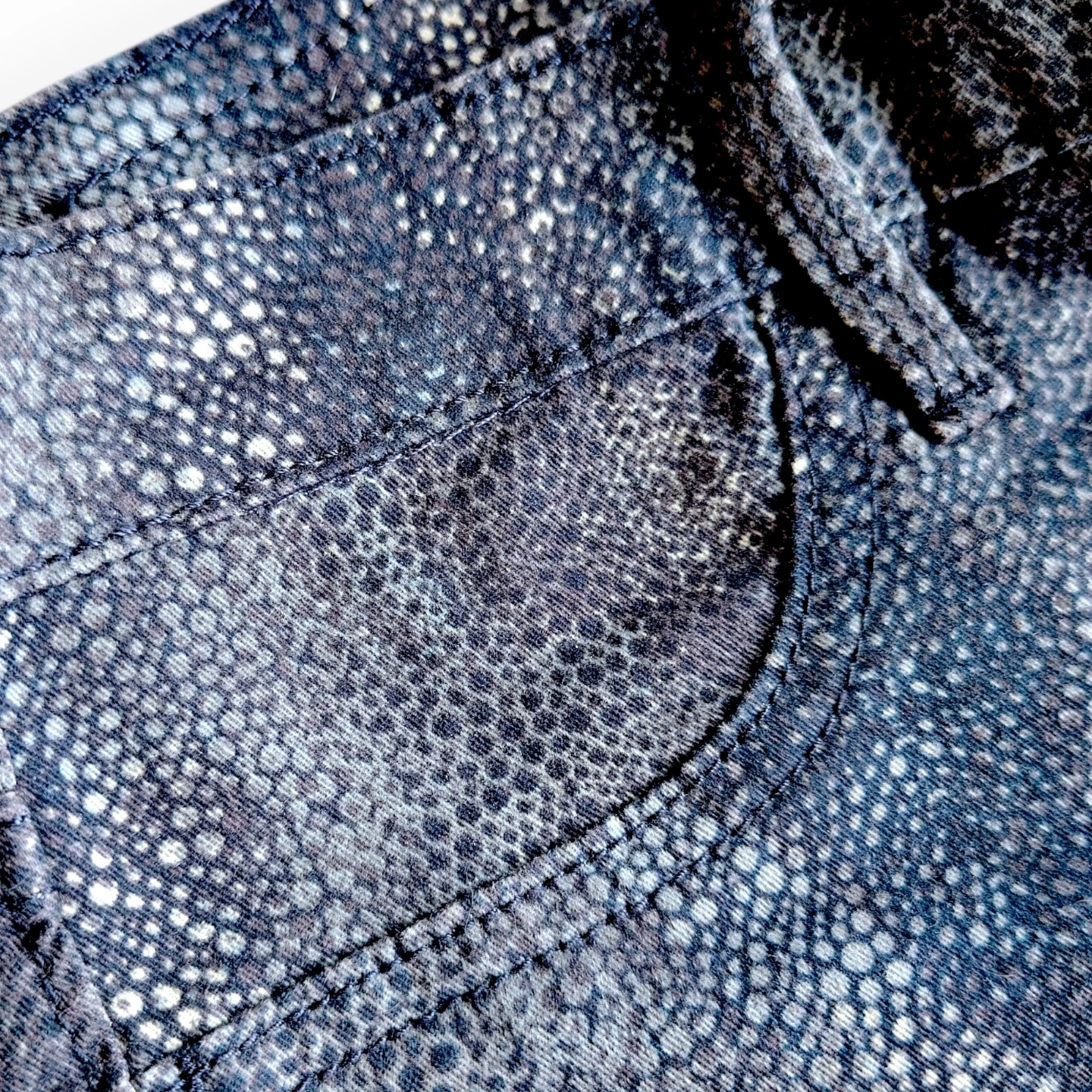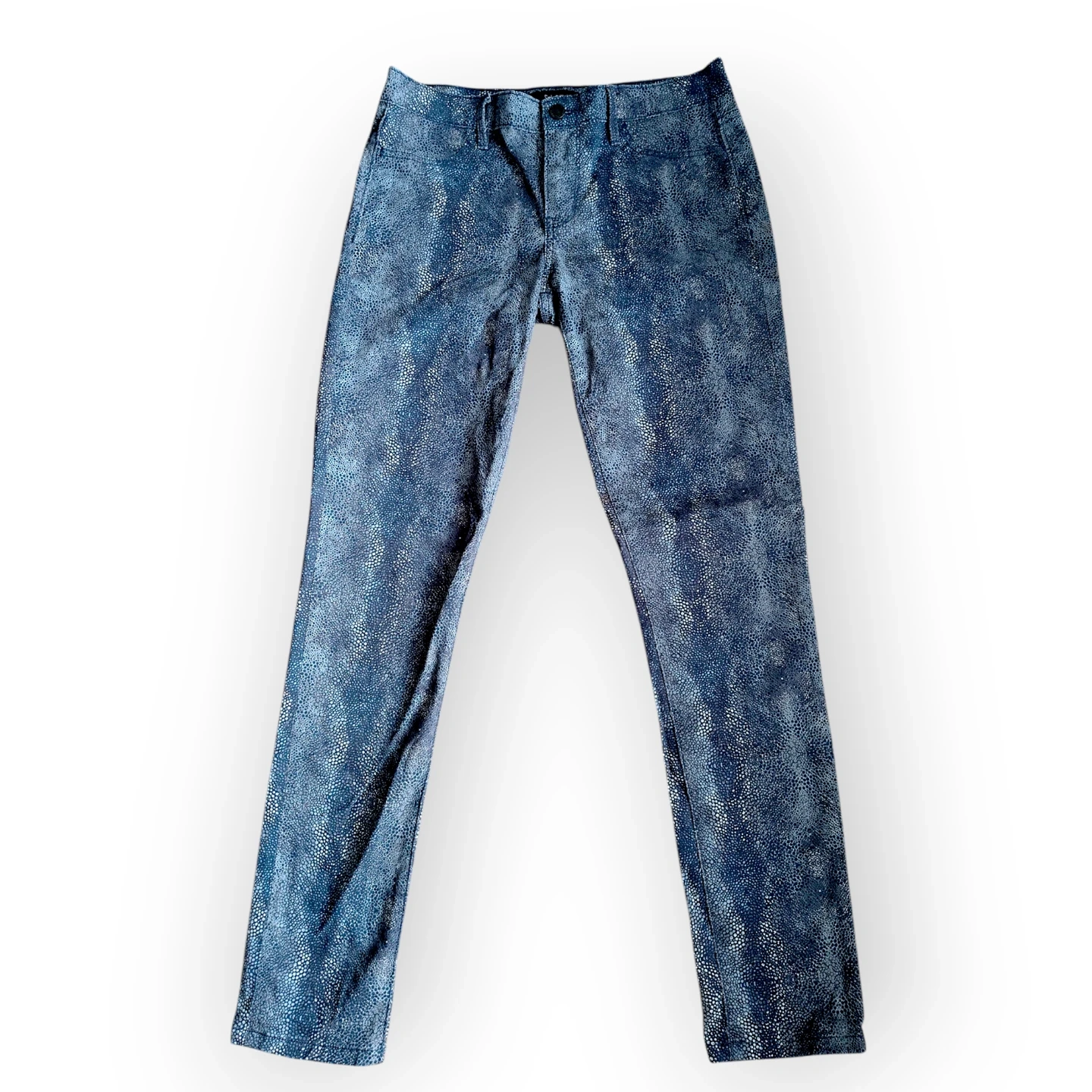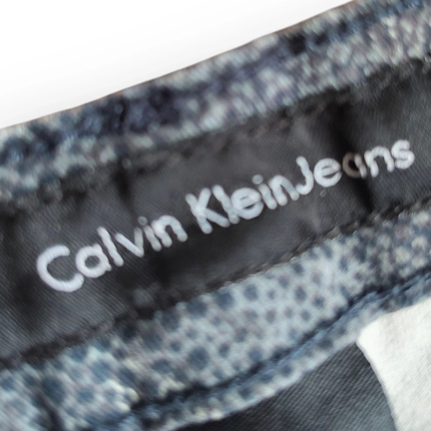 These Calvin Klein Jeans pants are a size 8. They feature a unique dark blue and white speckled pattern. Made in Vietnam.
