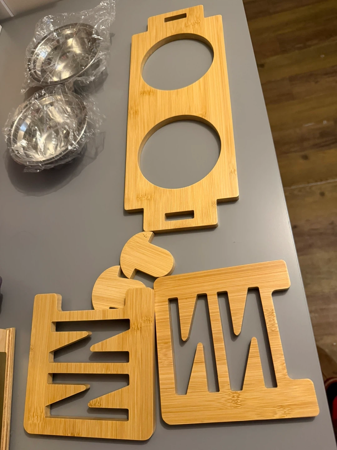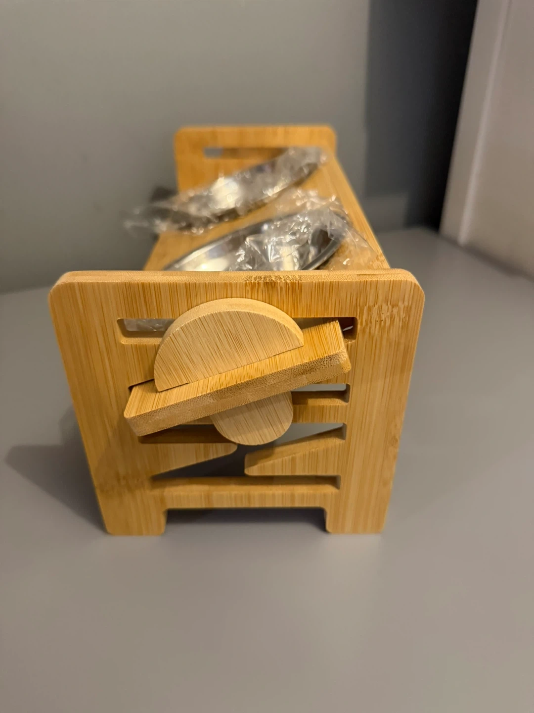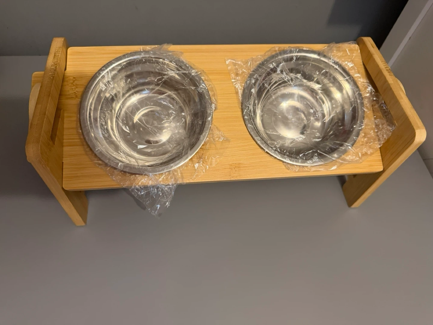 Brand new in box. This is a bamboo pet feeder set that includes two stainless steel bowls. The feeder's frame is made of bamboo, offering a natural look for your home. The bowls are removable for easy cleaning. It's a great option for feeding your pets.
