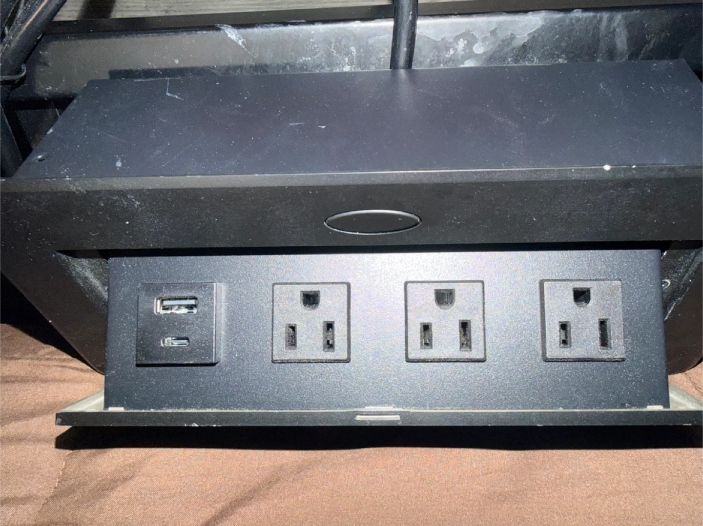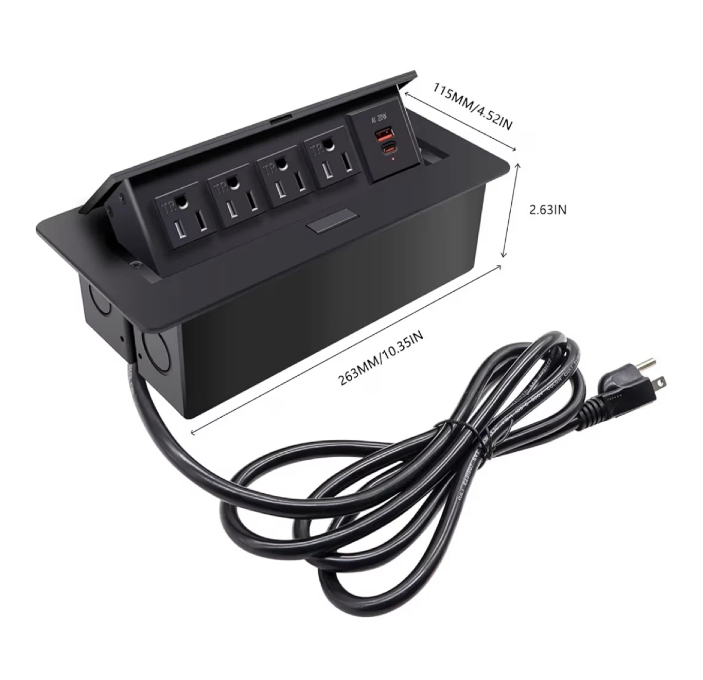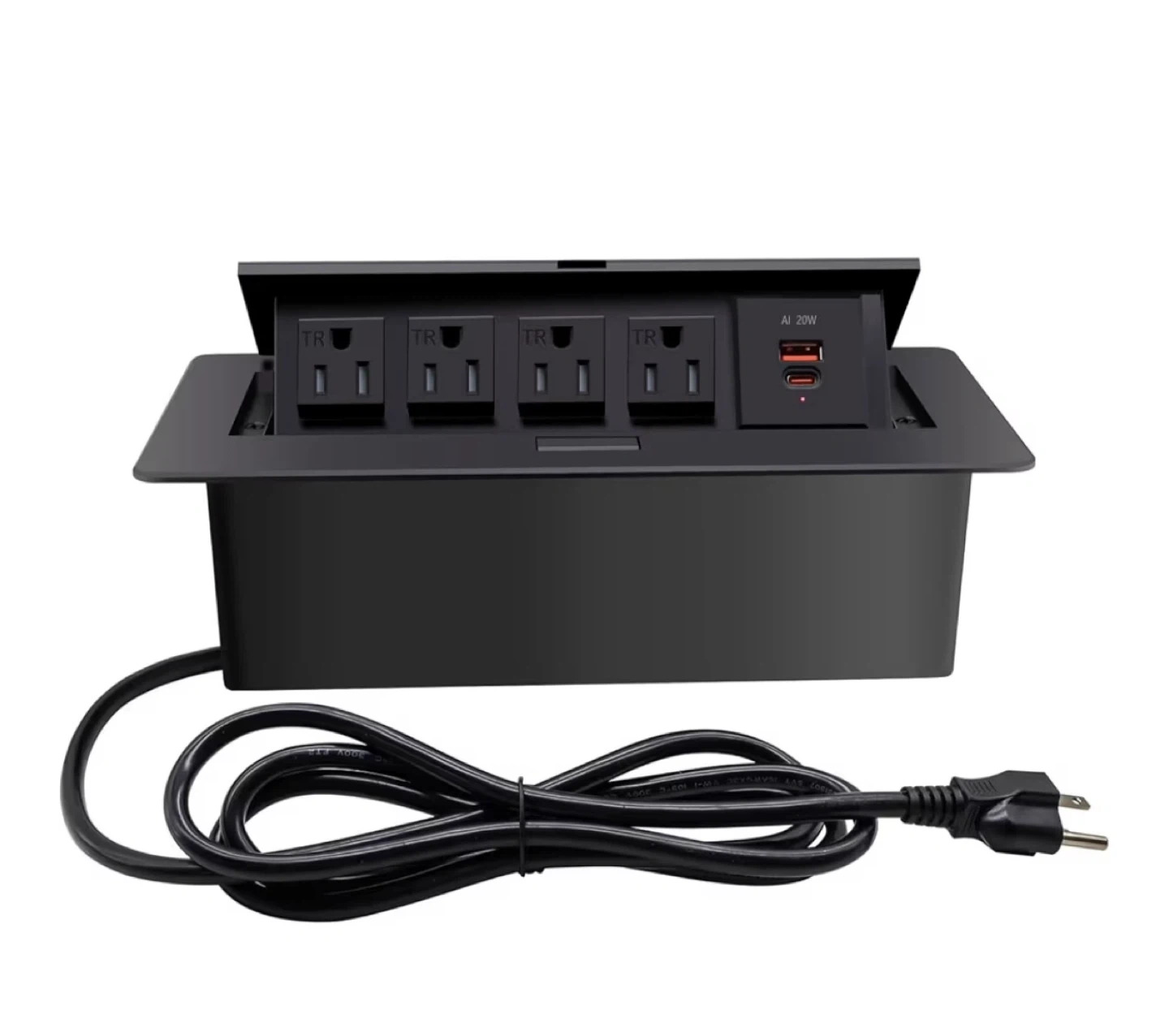 This is a TIANDIGP pop-up power strip with 4 AC outlets and 1 USB & 1 C port. It's ideal for countertops in home offices or conference rooms. The power cord is 6.5 feet long and it supports a max power of 1875W.