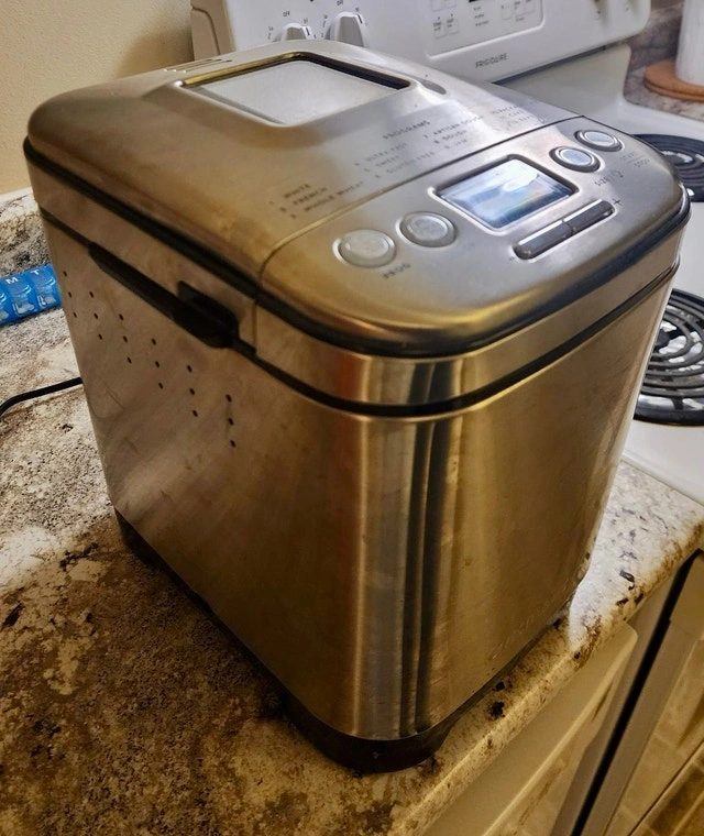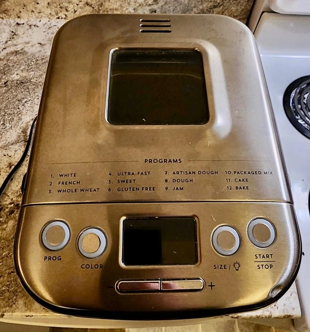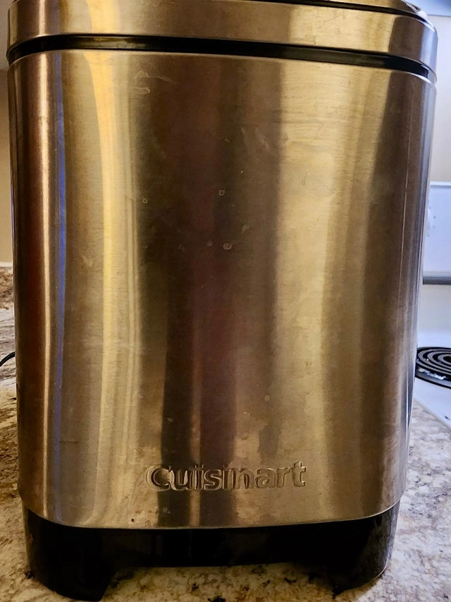 Selling my used Cuisinart Compact Automatic Bread Maker with 12 pre-programmed menu options, perfect for baking various types of bread. This stainless steel bread maker is great for anyone who enjoys fresh, homemade bread with minimal effort. Due to being used, it has some cosmetic imperfections. Features include: 12 pre-programmed menu options, 3 crust settings (light, medium, or dark), 13-hour delay start, and a viewing window to monitor the baking process. The bread pan and kneading paddle are removable for easy cleaning. Comes with recipe booklet!