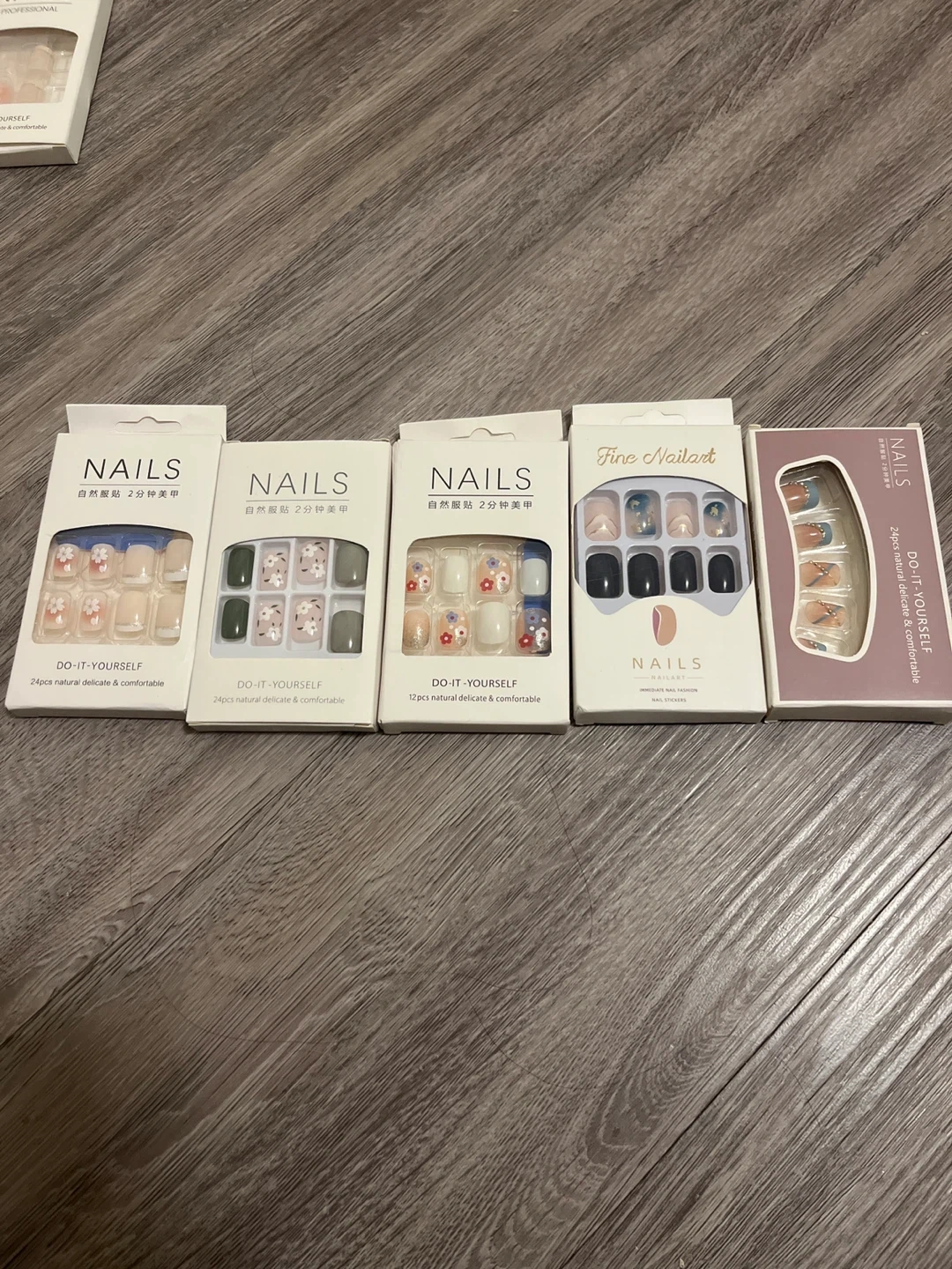 A collection of five different press-on nail kits for easy at-home manicures. These kits include various styles and designs, with options for 12 or 24 pieces per kit. They're designed for a natural, delicate, and comfortable fit. $3/box, $12 for 5 boxes