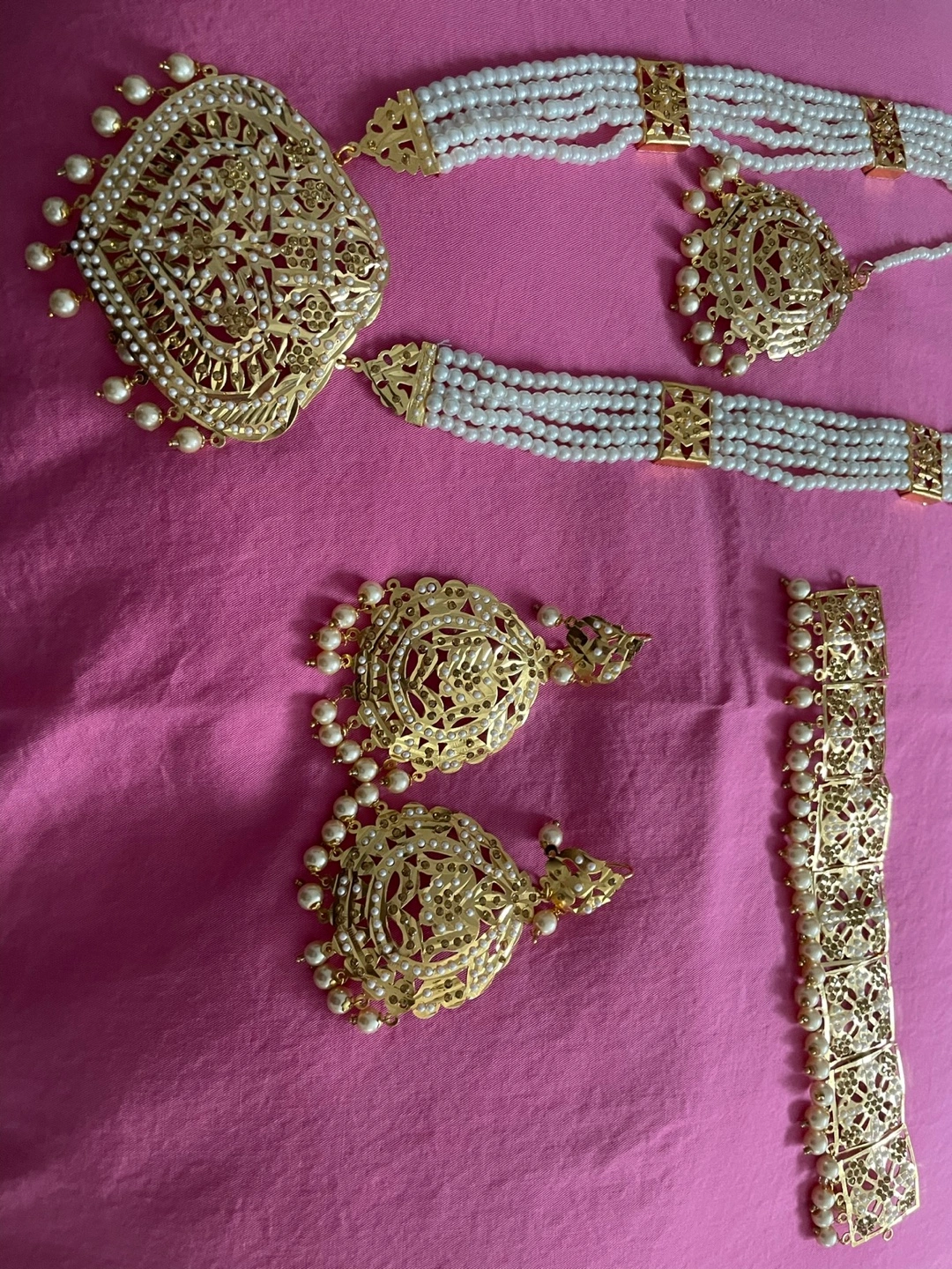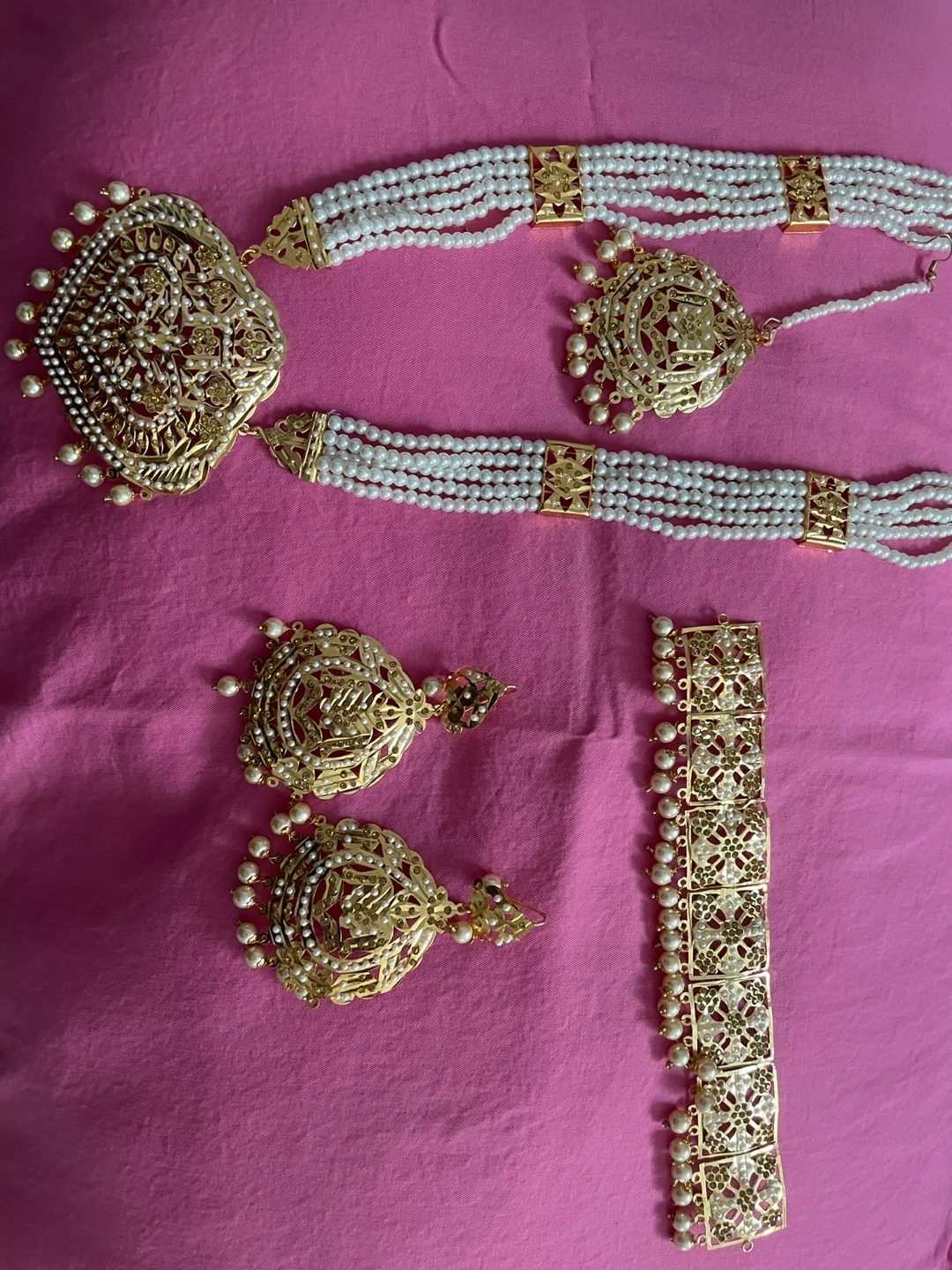 Beautiful bridal jewellery set. Includes necklace, earrings, choker, and maang tikka. Gold-toned metal with white pearls. Intricate detailing. Perfect for weddings or special occasions.