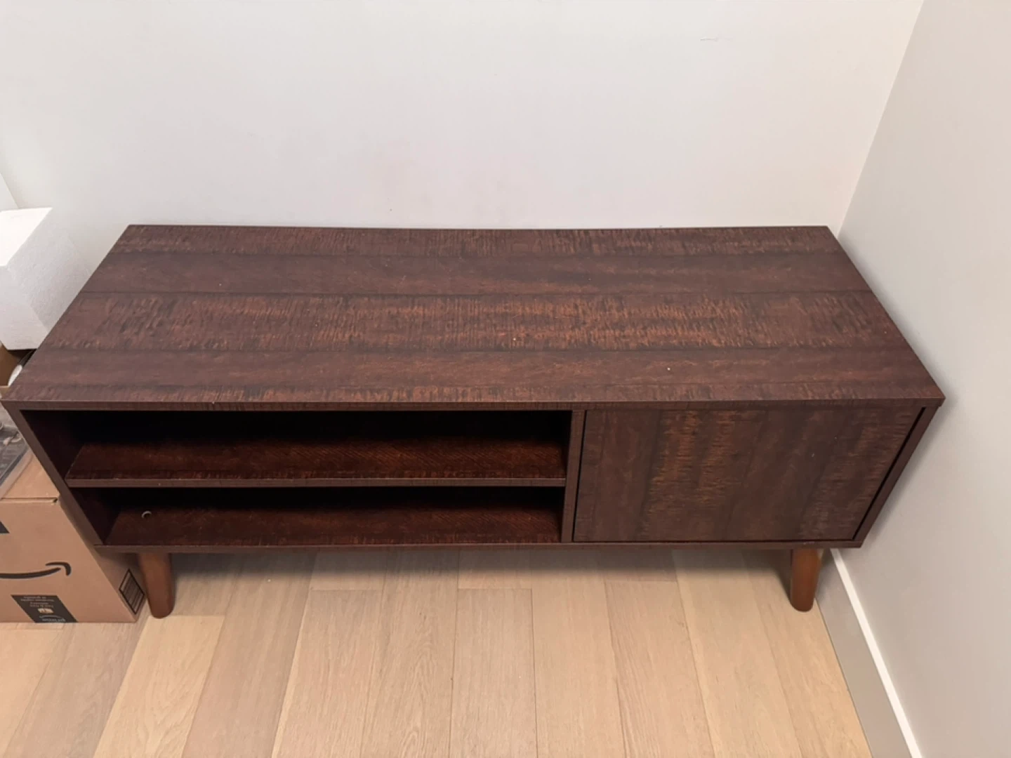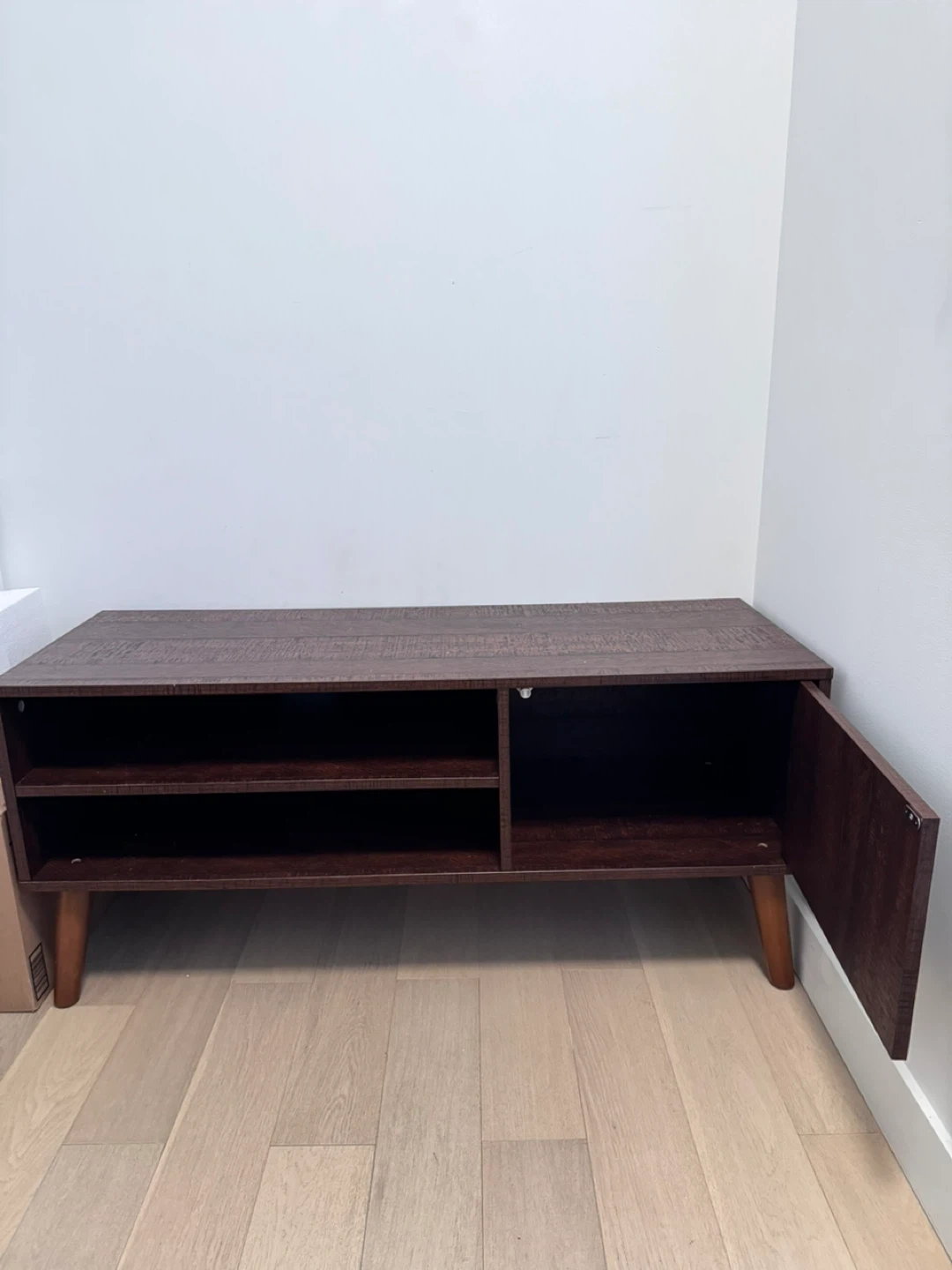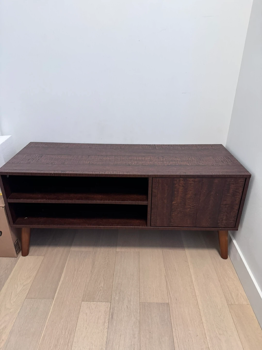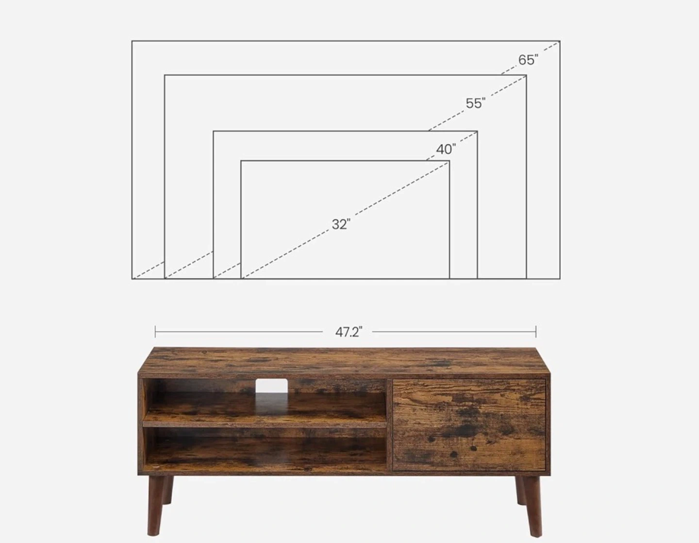 This TV stand features a rustic brown finish with one cabinet and open shelving. It's 47.2" wide and 19.3" tall. The cabinet is 17.5" wide.