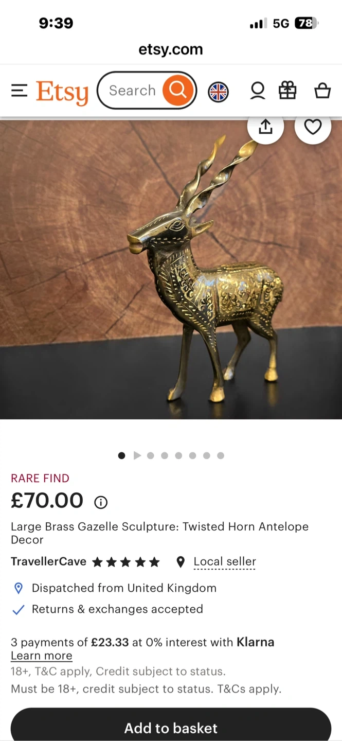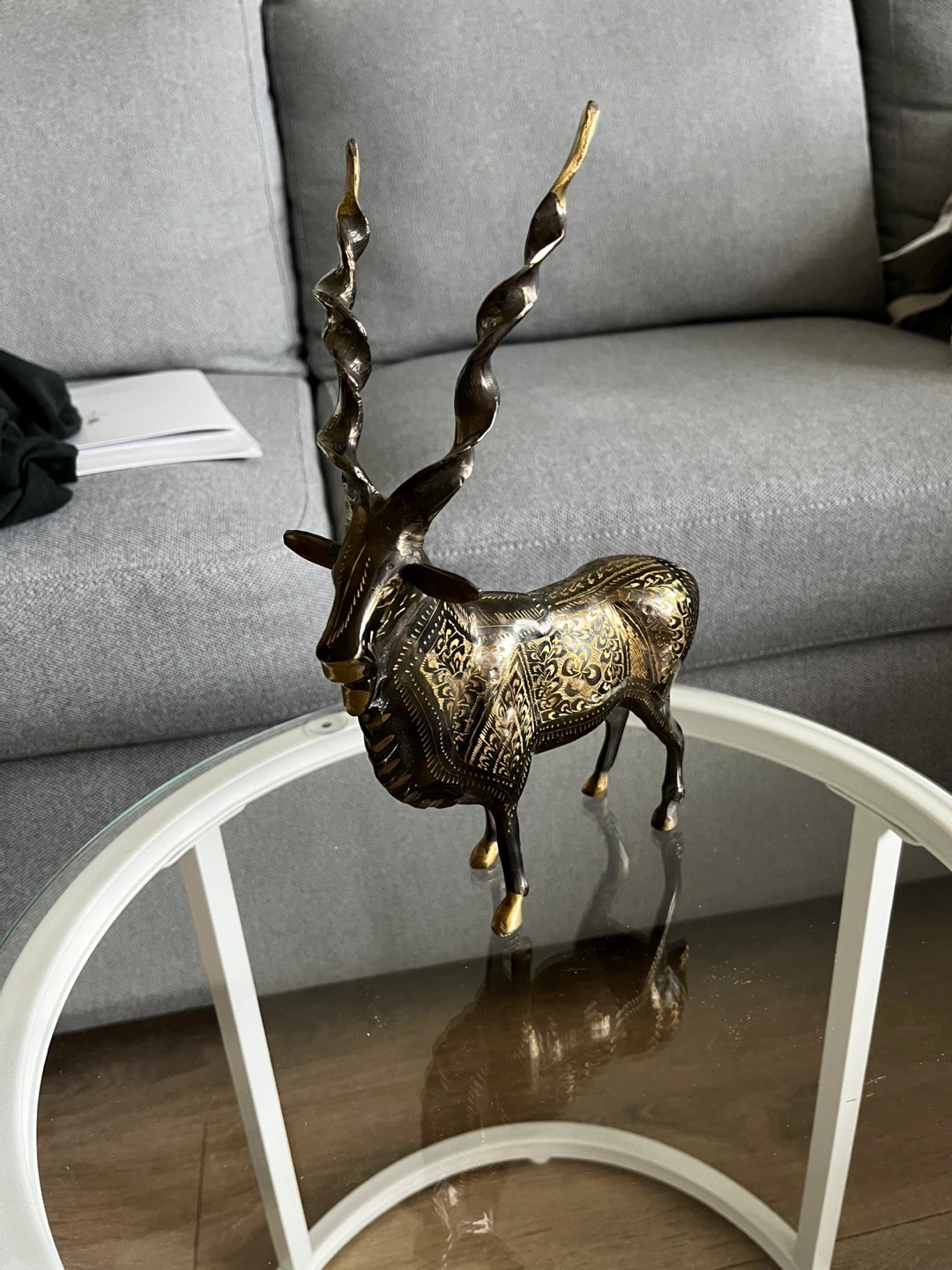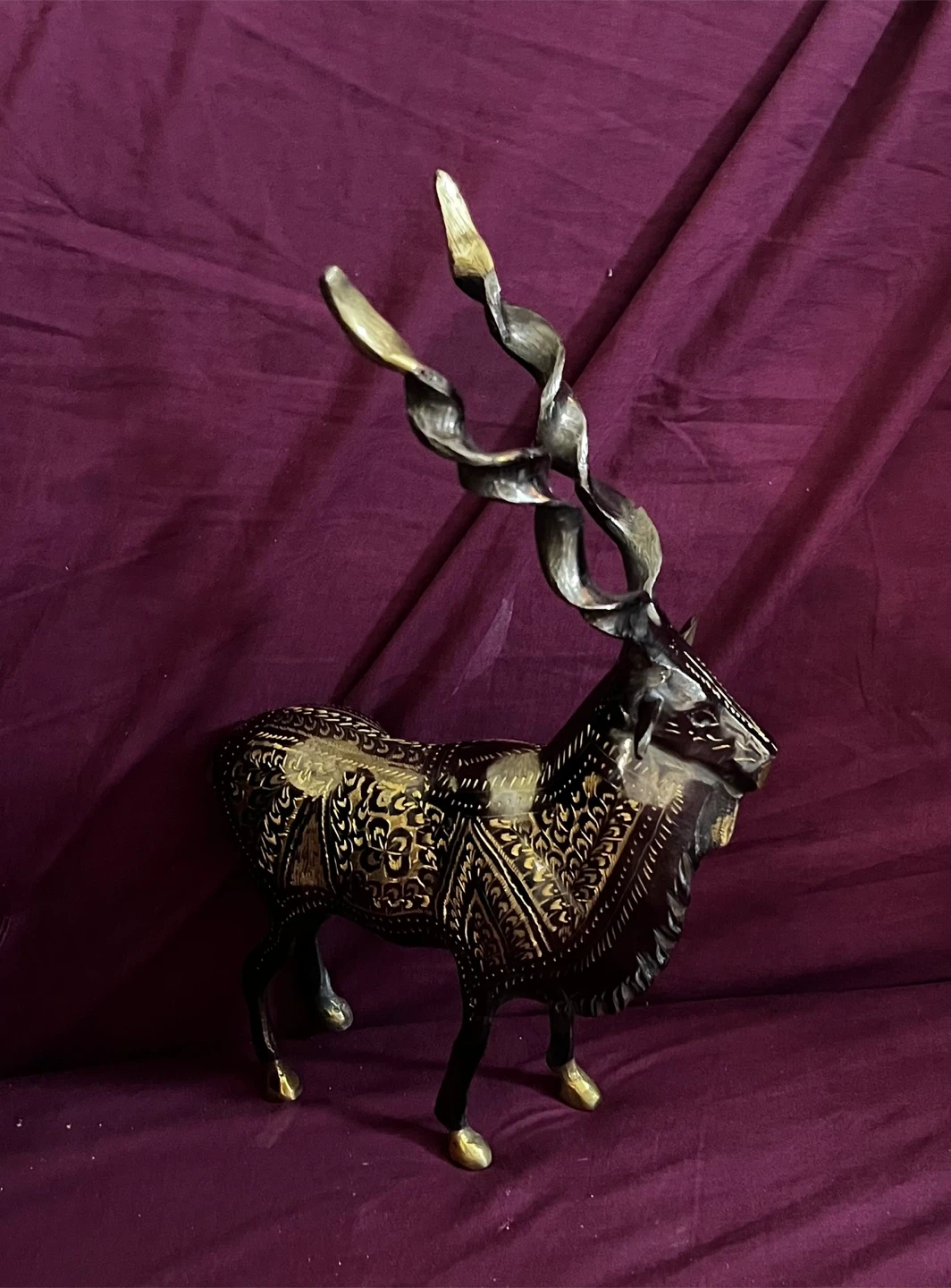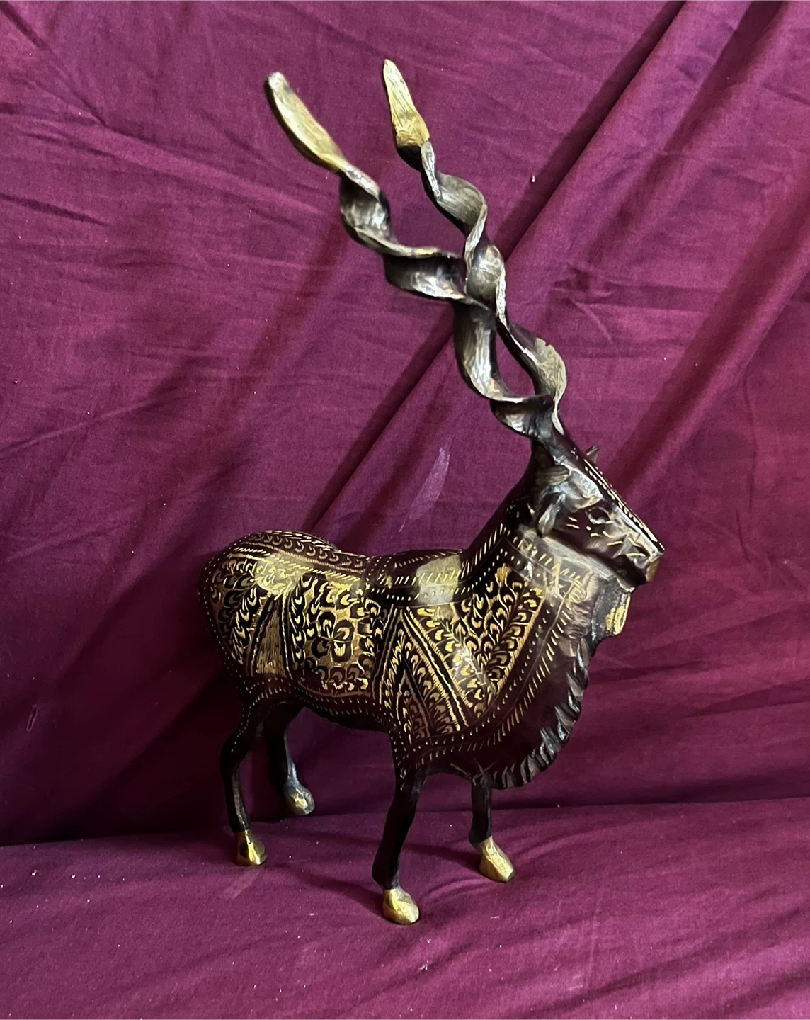 Handcrafted Brass Markhor Figurine - Standing Goat Statue with Long Spiral Horns - Vintage Wildlife Home A decorative statue of an antelope, crafted from brass. It features intricate etched detailing on its body and elaborately twisted horns. This piece would make a striking addition to home decor.