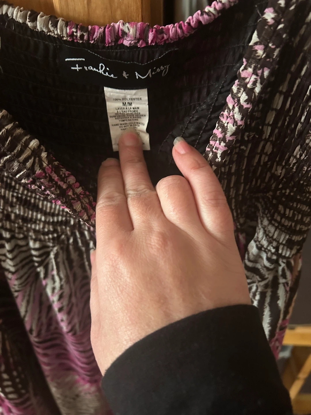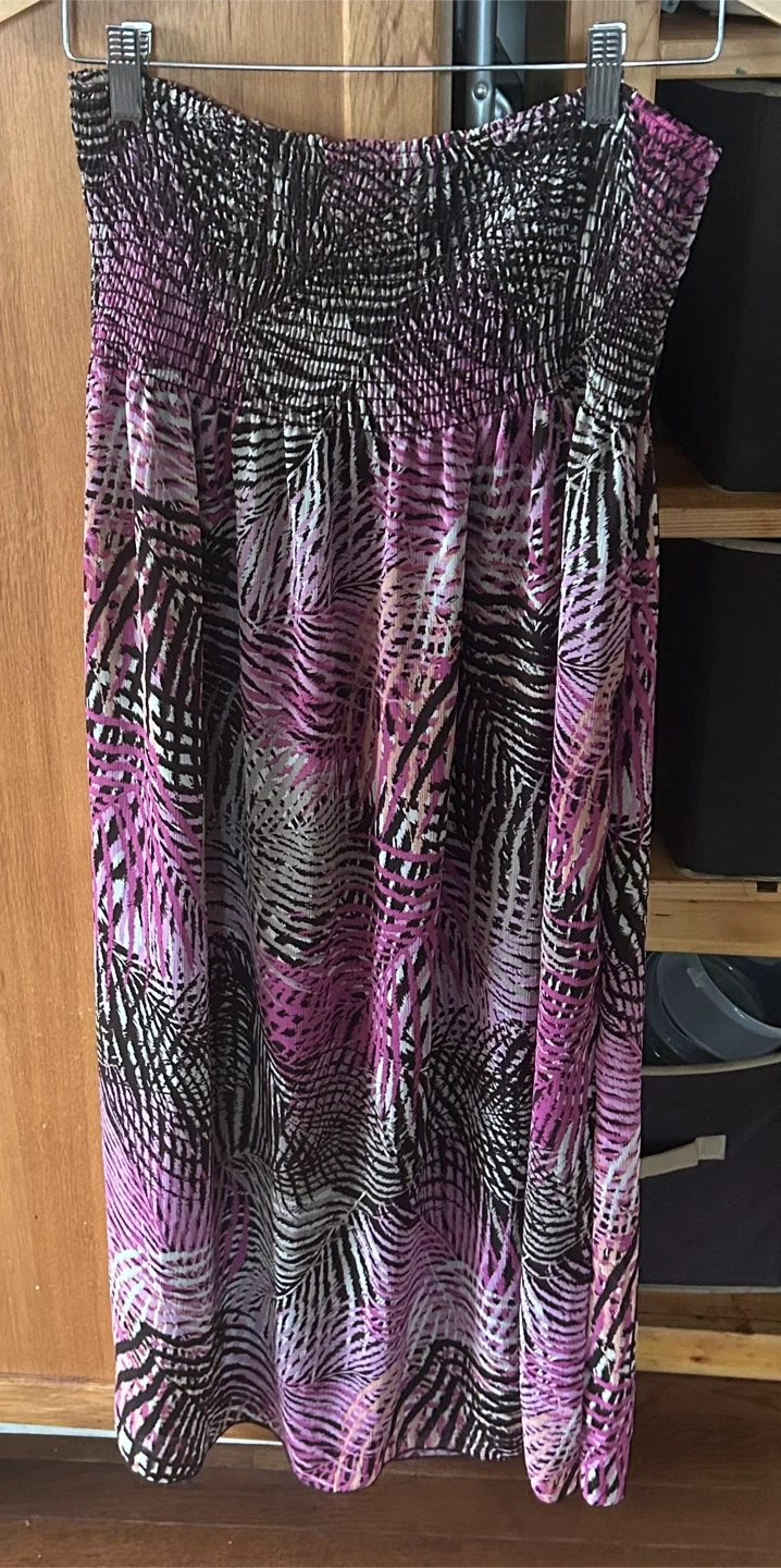 Selling a cute Frankie & Meesy strapless dress in size M. It's made of 100% polyester and has a fun, vibrant pattern. Perfect for summer!