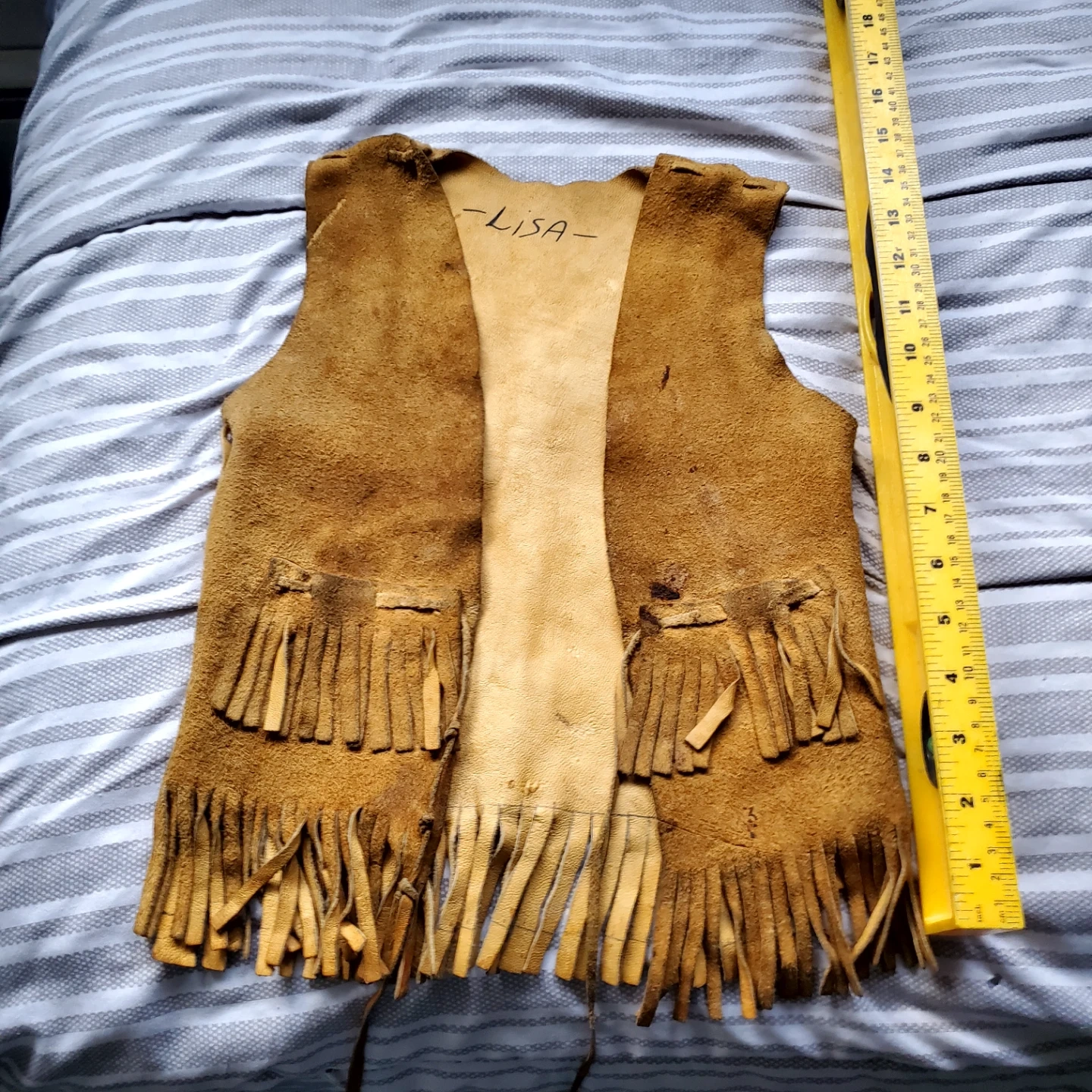 Tan suede leather vest with a hand-painted rose design on the front. It features fringe detailing along the bottom and sides, and ties on the sides for closure. The interior collar has the name "Lisa" written on it. Measurements are approximately 16 inches from shoulder to hem. This is Silmilkameen Indian apparel worn by my sister. Needs to Dance again. I have two...Mine and my Sister's...both are 55 yrs old. Hand made by my Auntie.