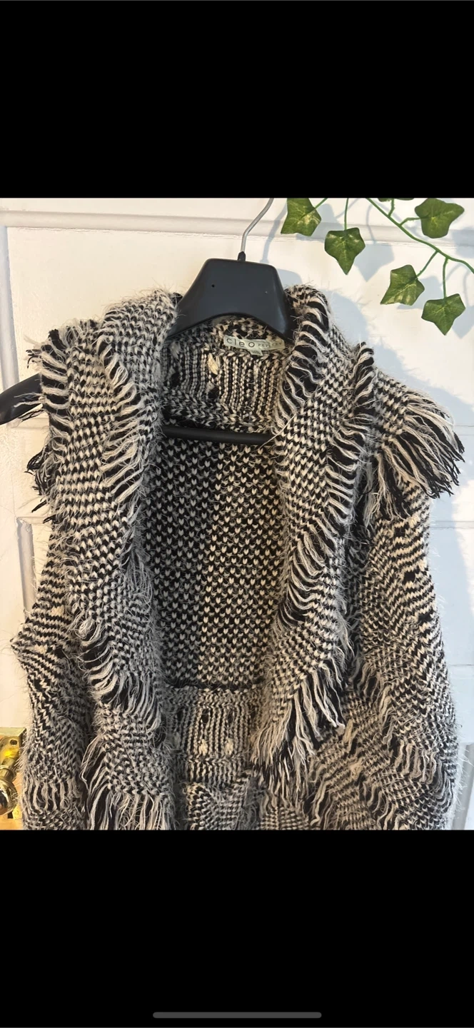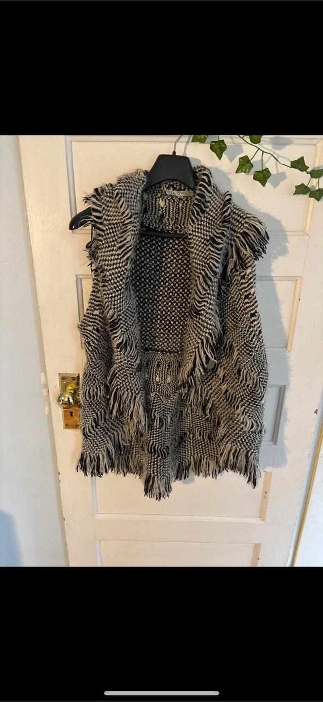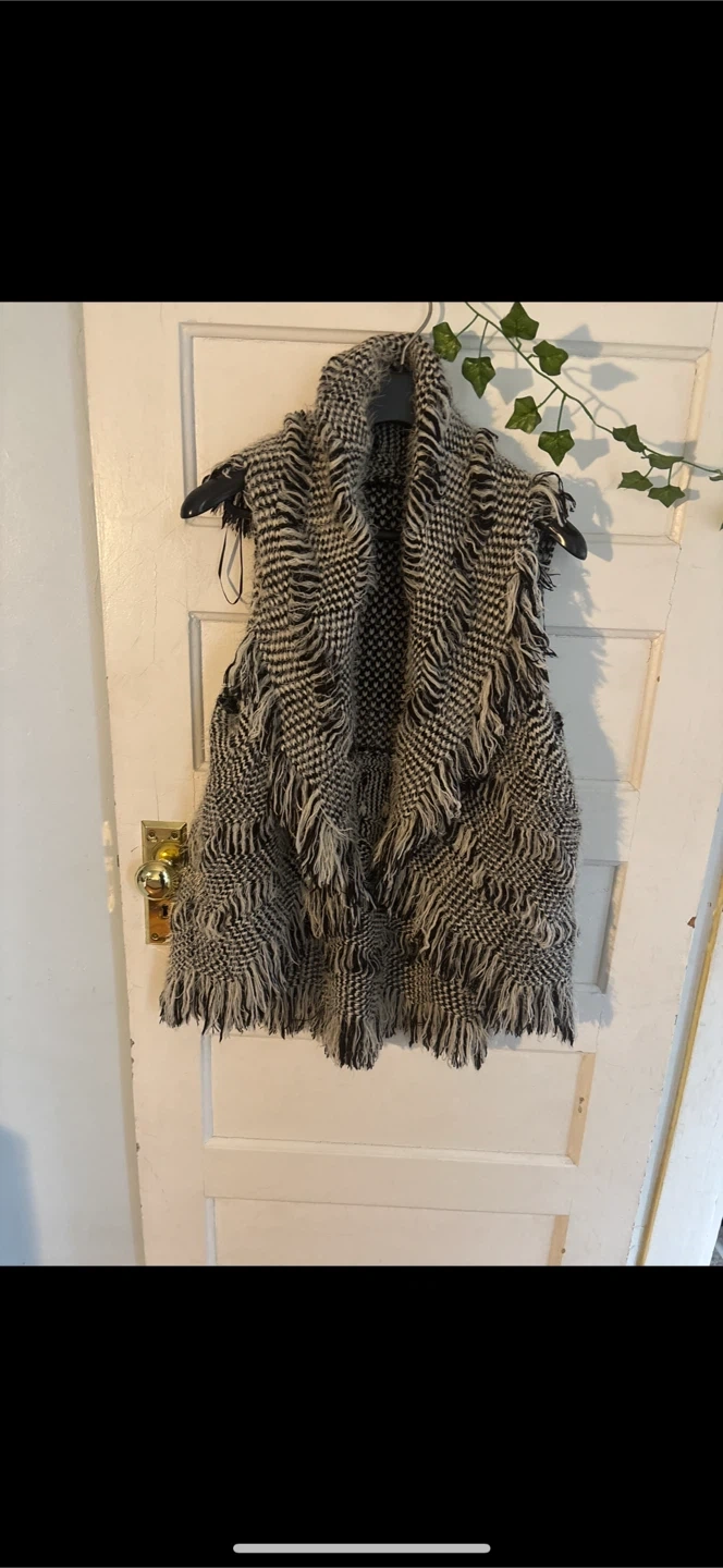 Stylish black and white knit vest with a fringed design. It's sleeveless and perfect for layering. This piece adds texture and a unique flair to any outfit!