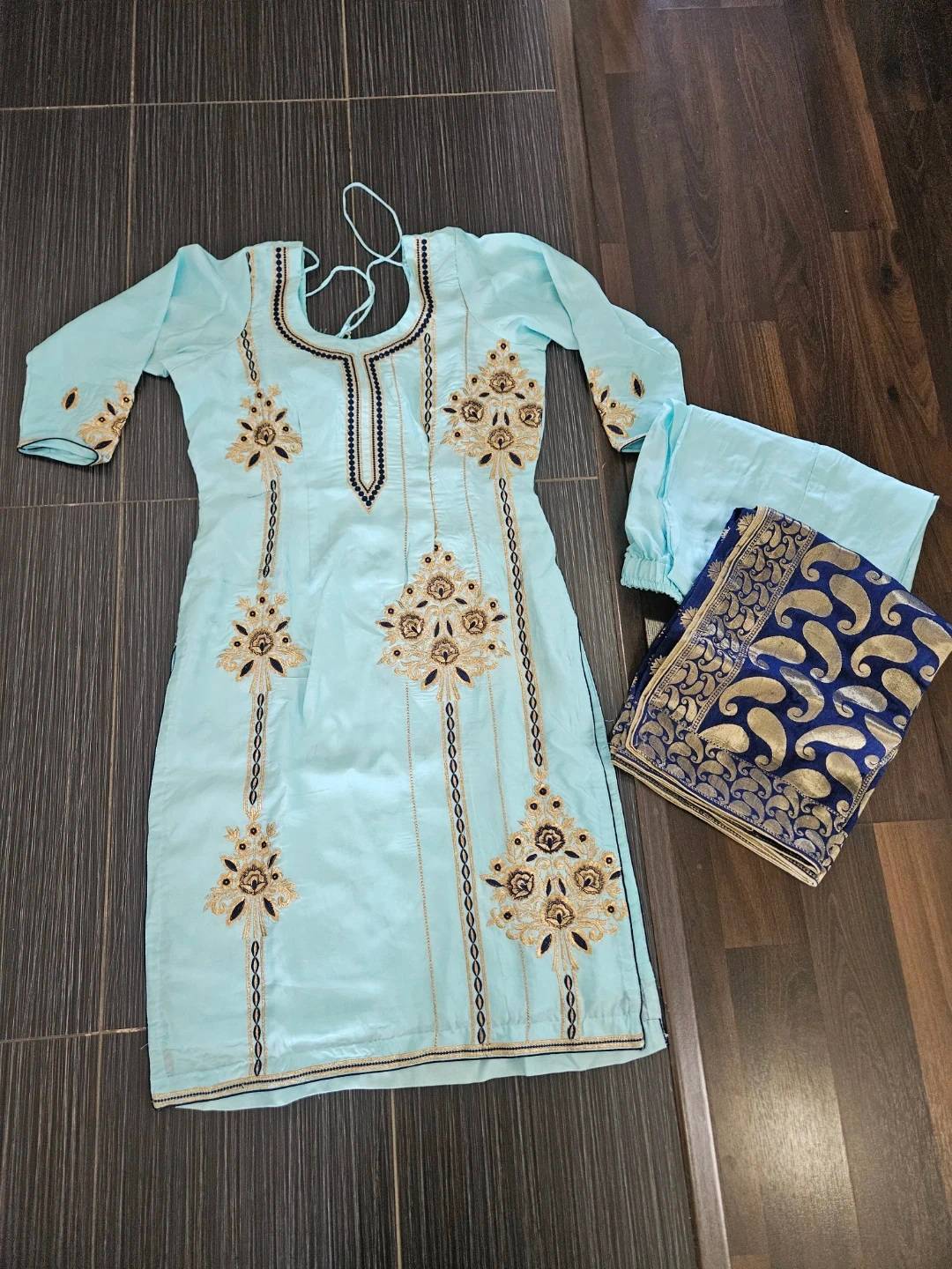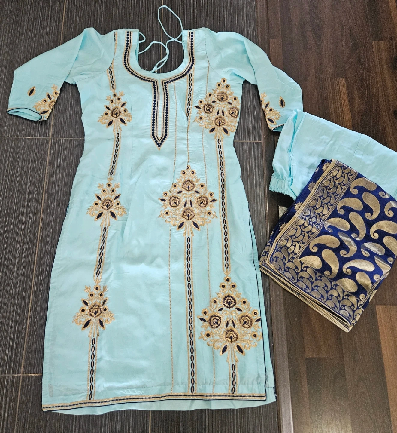 Beautiful light blue Punjabi suit with intricate gold and navy embroidery. Includes the kurta, pants, and a coordinating dupatta with paisley patterns. Perfect for a special occasion!