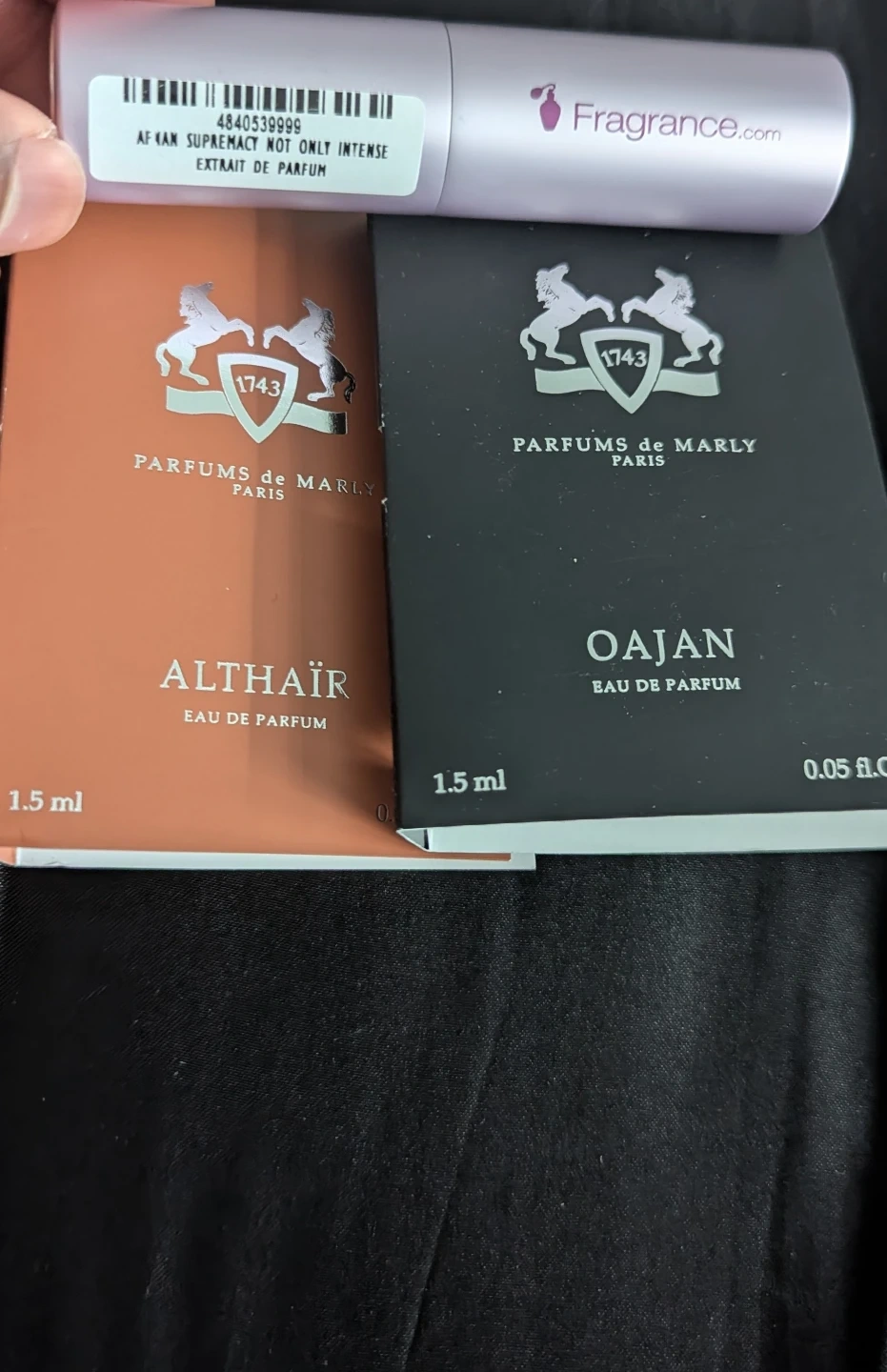 Two Parfums de Marly perfume samples and afnan not only intense travel spray: Althair Eau de Parfum and Oajan Eau de Parfum. Each is a 1.5 ml spray. Great for trying out these scents!