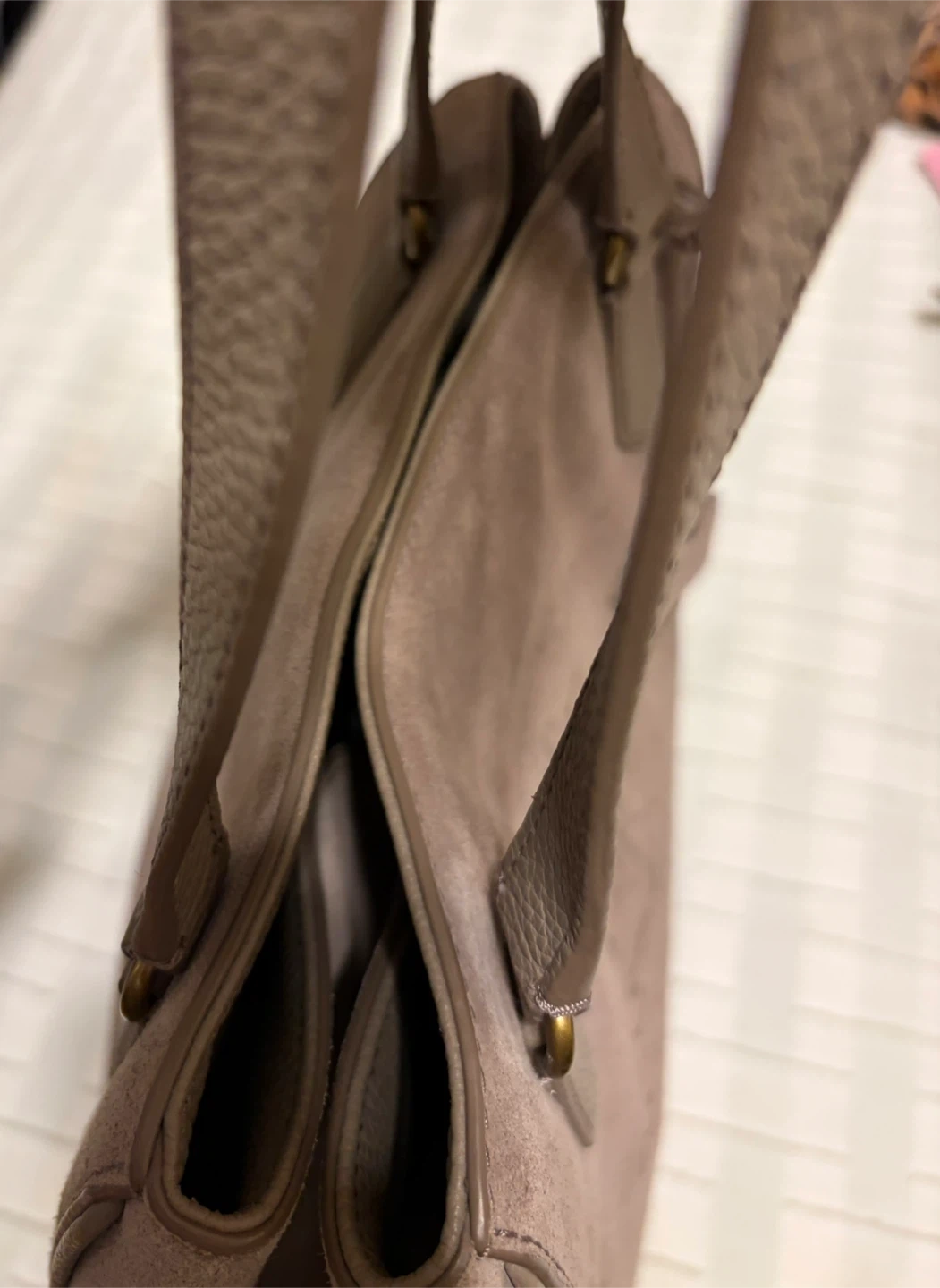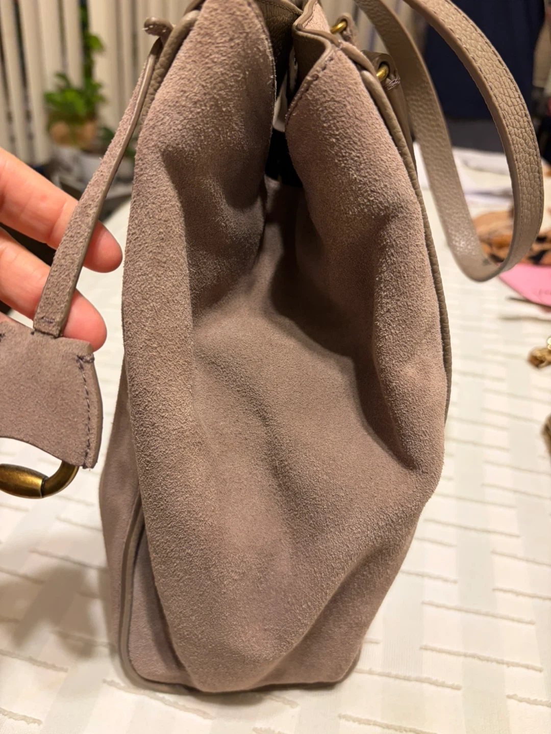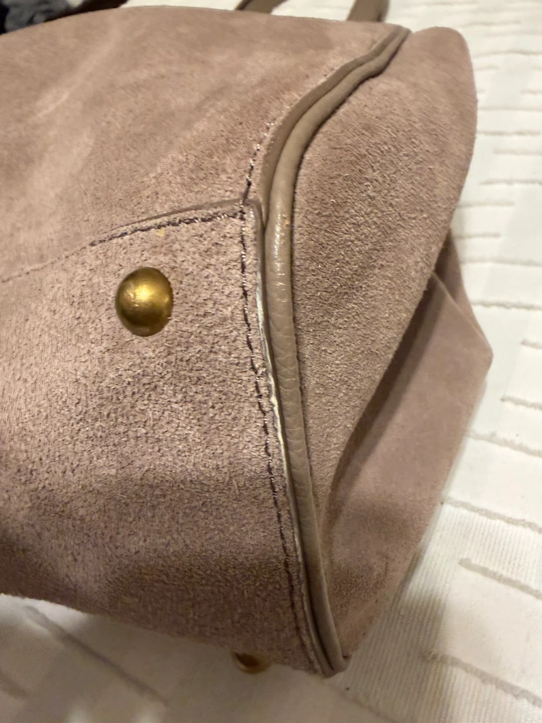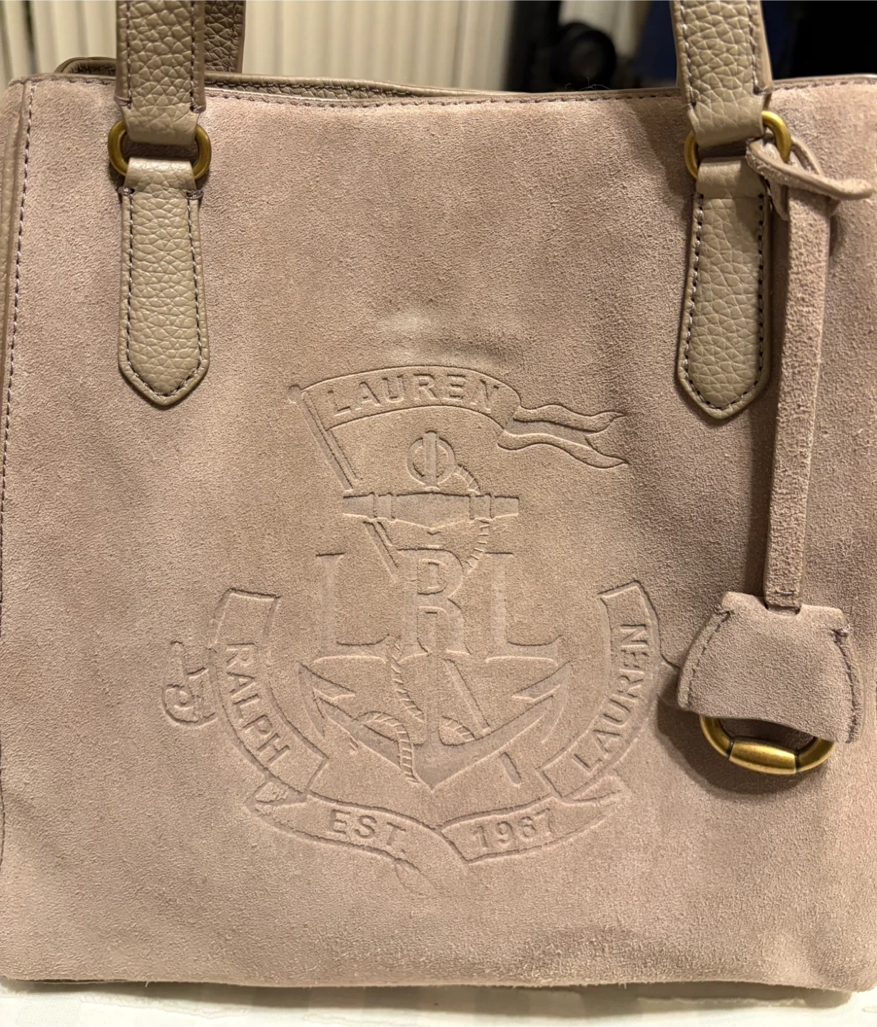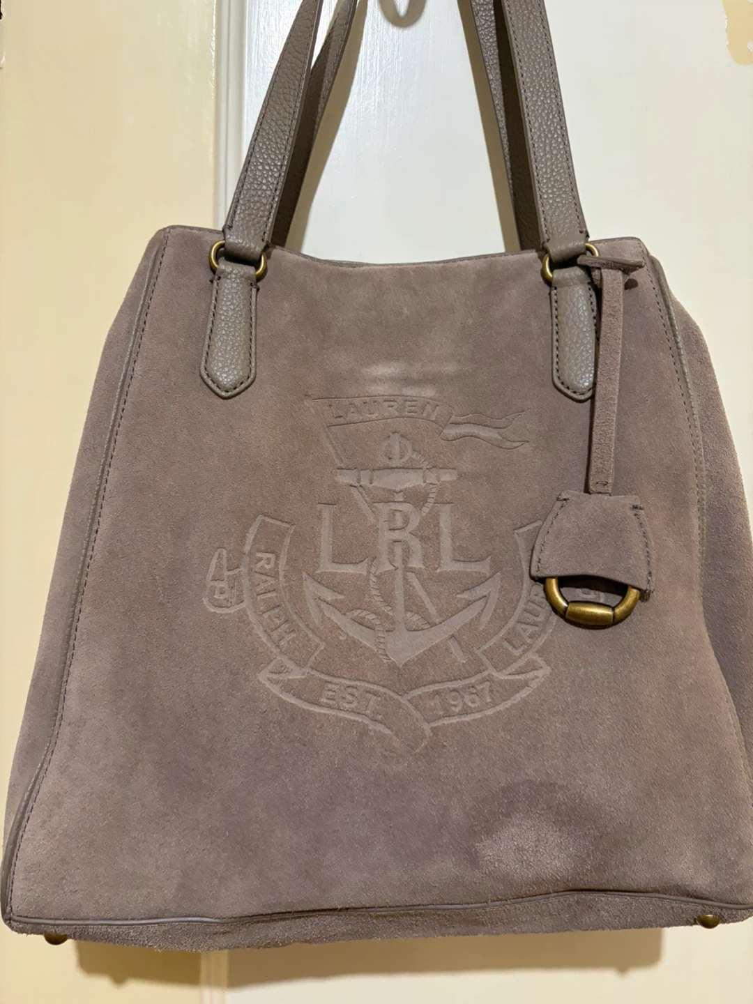 Lauren Ralph Lauren tote bag. Suede material. Embossed logo detail. Very clean inside , straps in excellent condition . I made that stain in the front trying to clean it . Magnet snap closure .