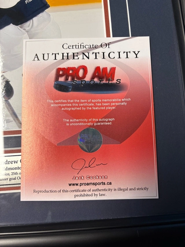 Offering an autographed and framed photo of former Edmonton Oiler Andrew Cogliano, ready to be showcased in your home or office. This piece of sports memorabilia captures a moment in hockey history and comes with a certificate of authenticity from Pro Am Sports. The autograph is unconditionally guaranteed!