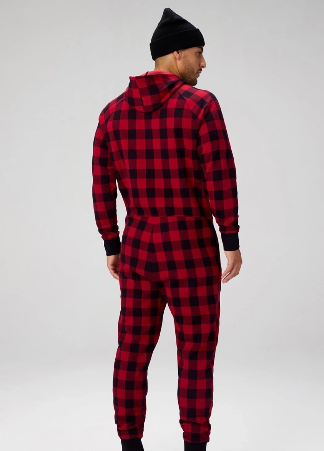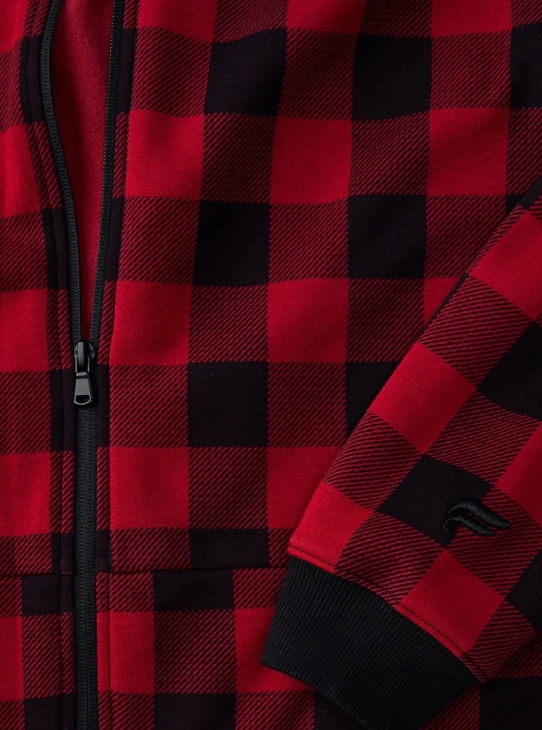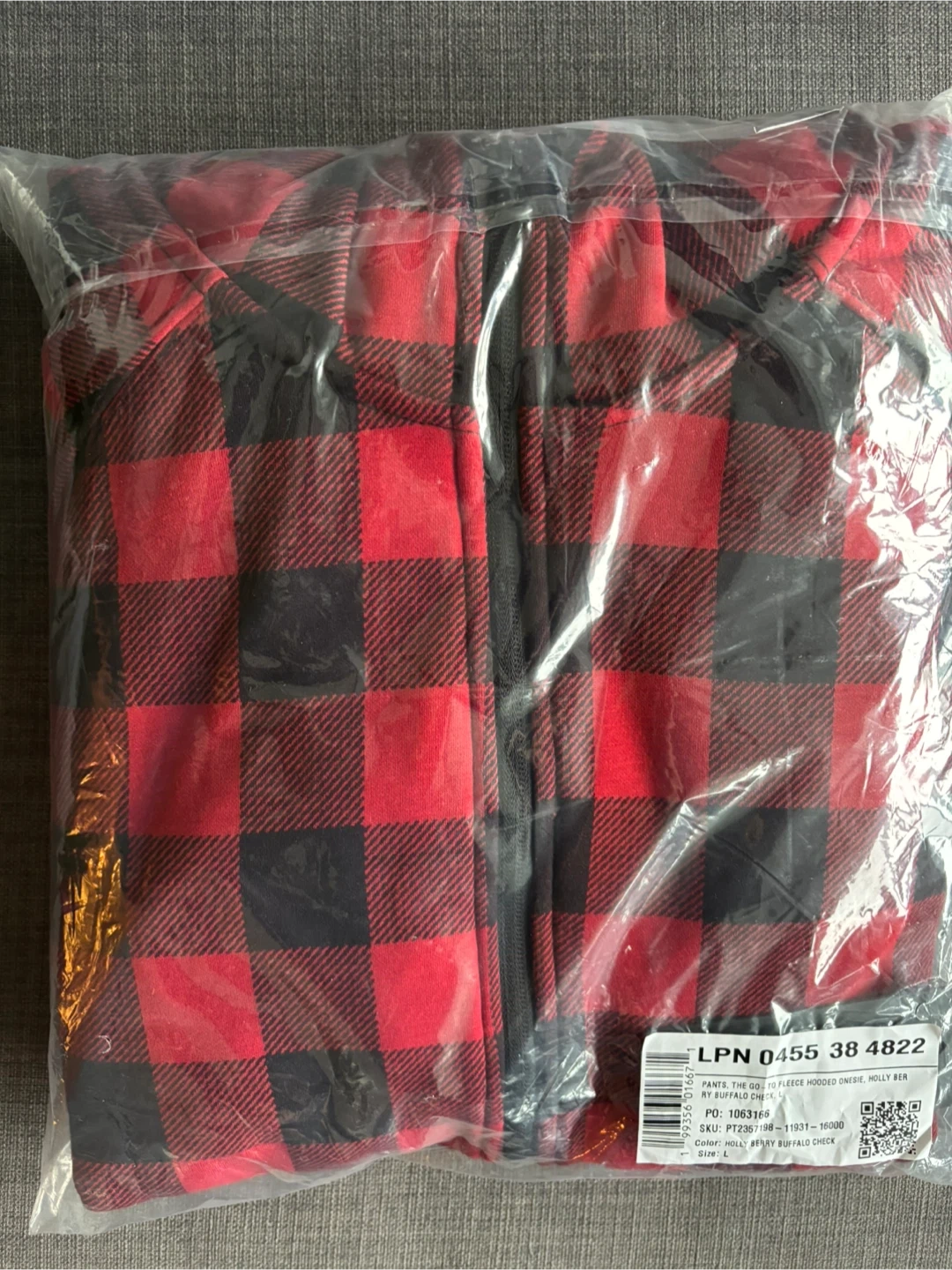 Cozy up in this Fabletics onesie! It's a red and black buffalo check pattern. This fleece hooded onesie is brand new and comes in its original packaging