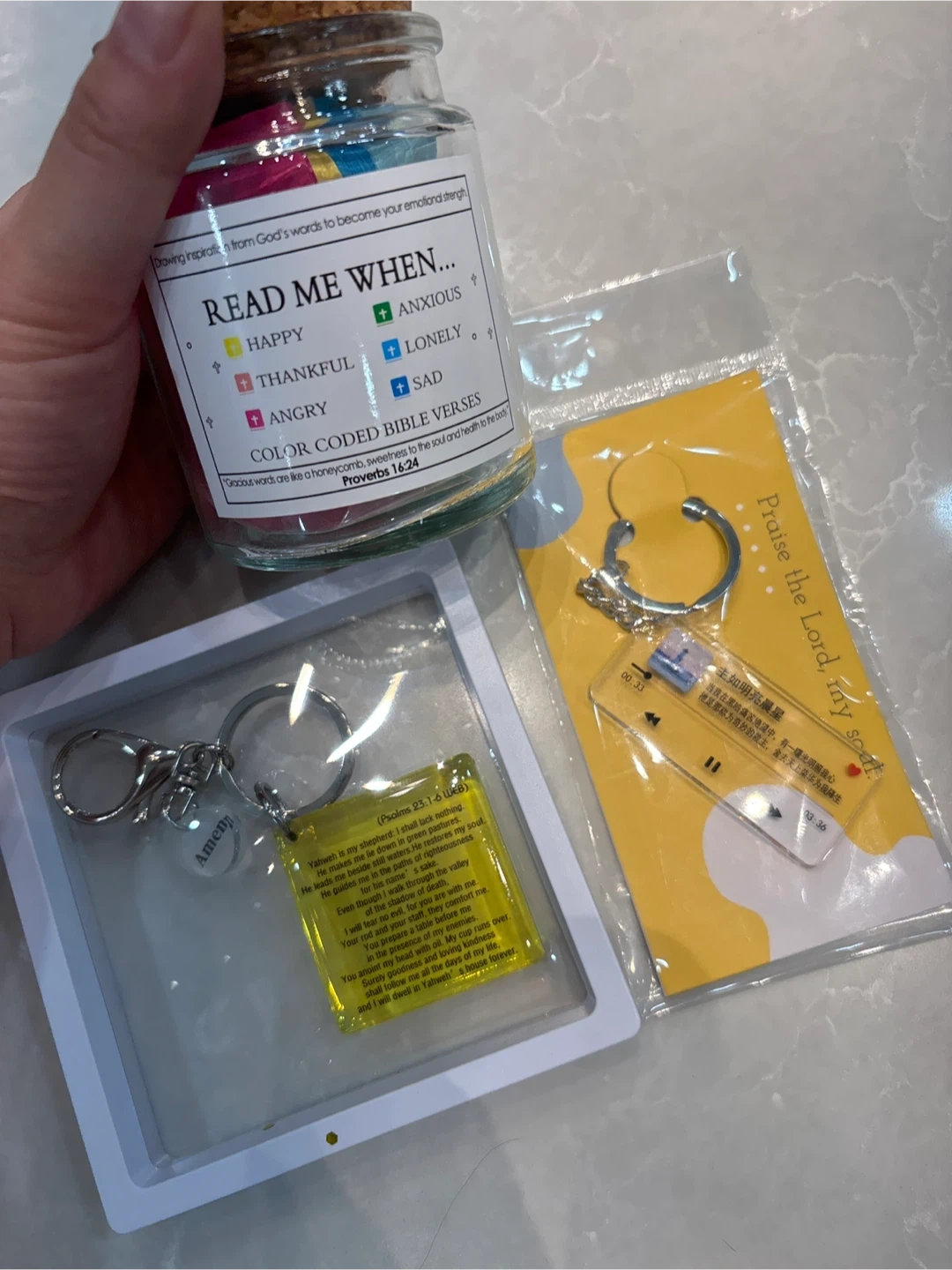 This set includes a "Read Me When" jar filled with color-coded Bible verses for emotional strength. Also included are two keychains, one featuring Psalms 23:1-6 and another with a musical theme in Chinese. These are great for personal reflection or as thoughtful gifts.