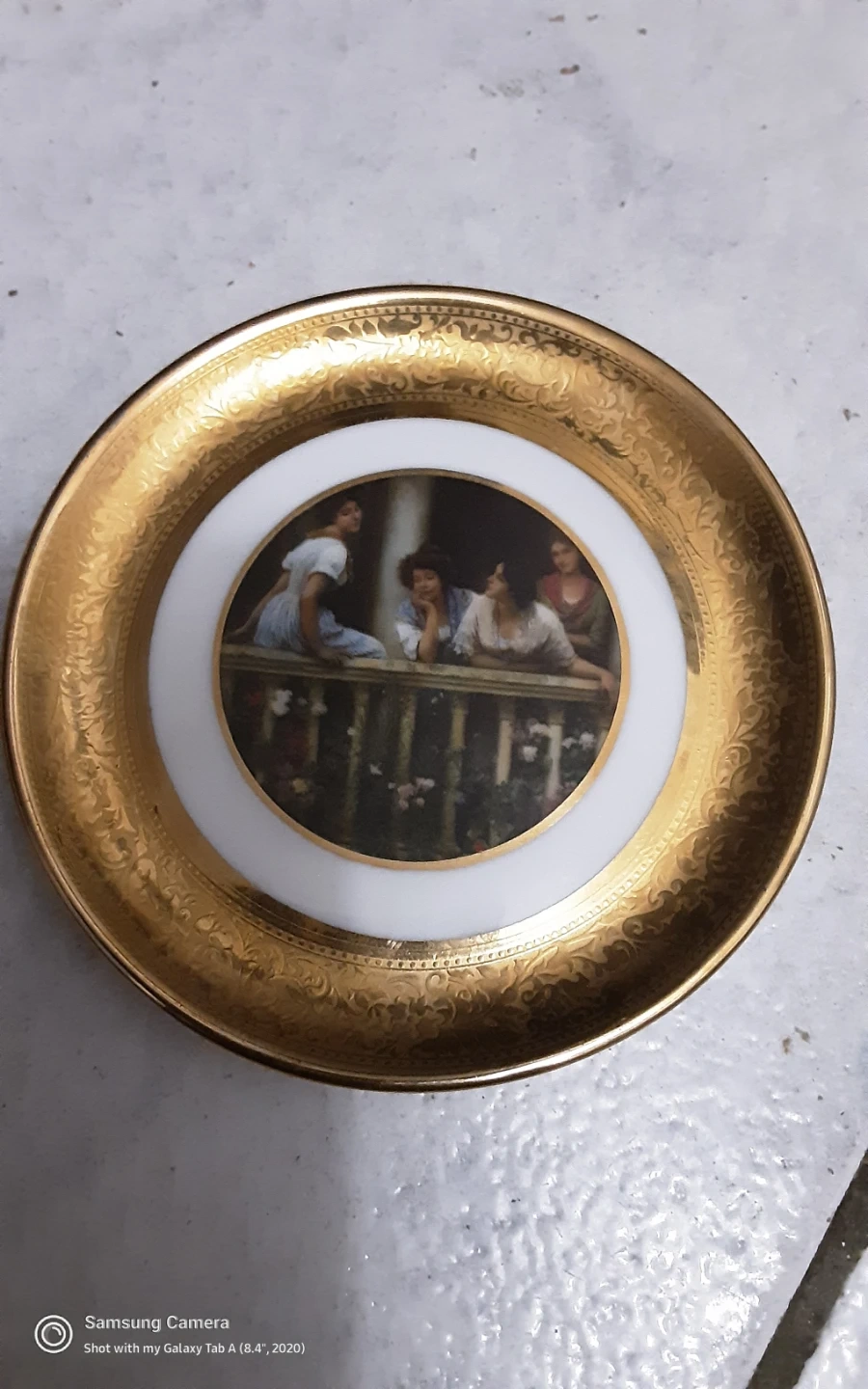 Decorative plate featuring a scene of people. Ceramic material. Gold trim accent. Made in Italy. $ 6 for 2 plants!