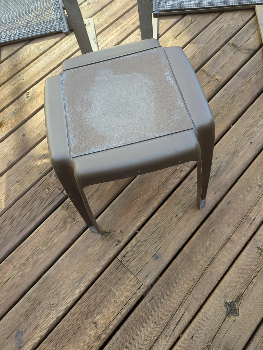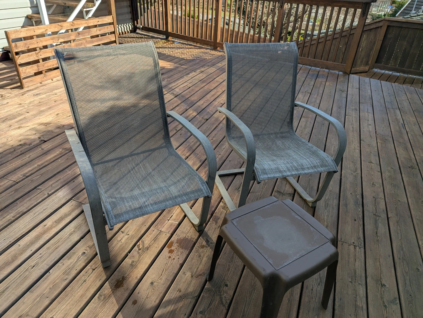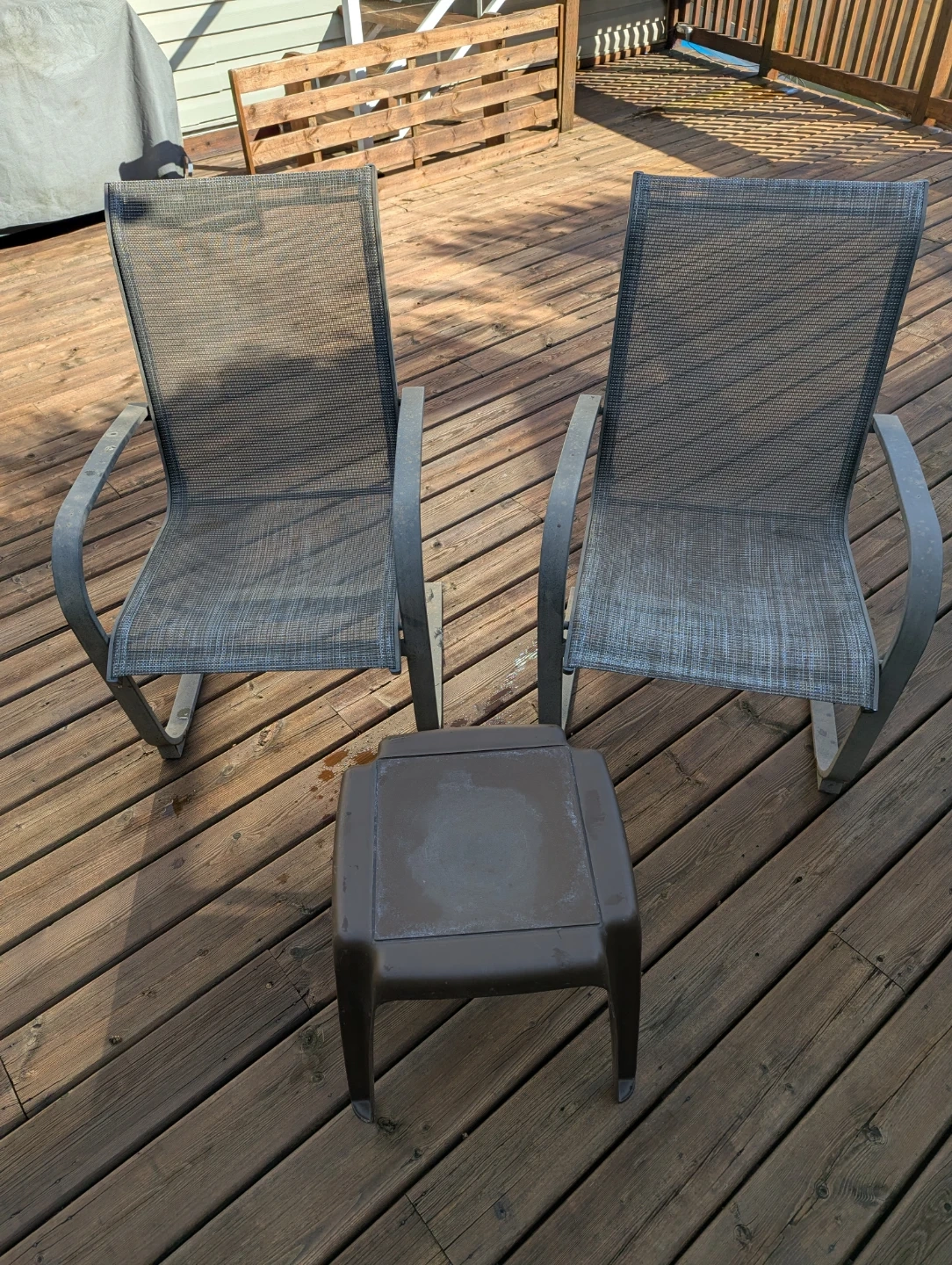 Two grey sling patio chairs with a metal frame and a matching durable plastic side table. Use it on a deck or patio for convenience! It's made for outdoor use. The chair's frame has curved arms for comfort. It's suitable for relaxing on your deck or patio.