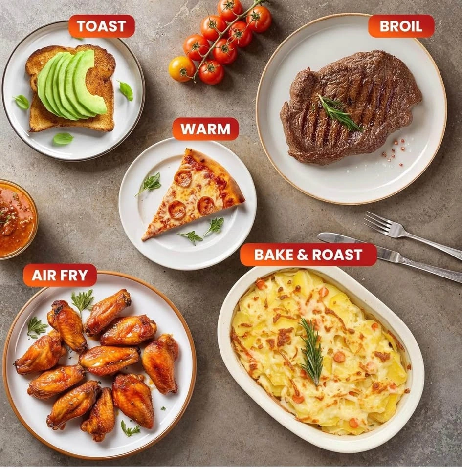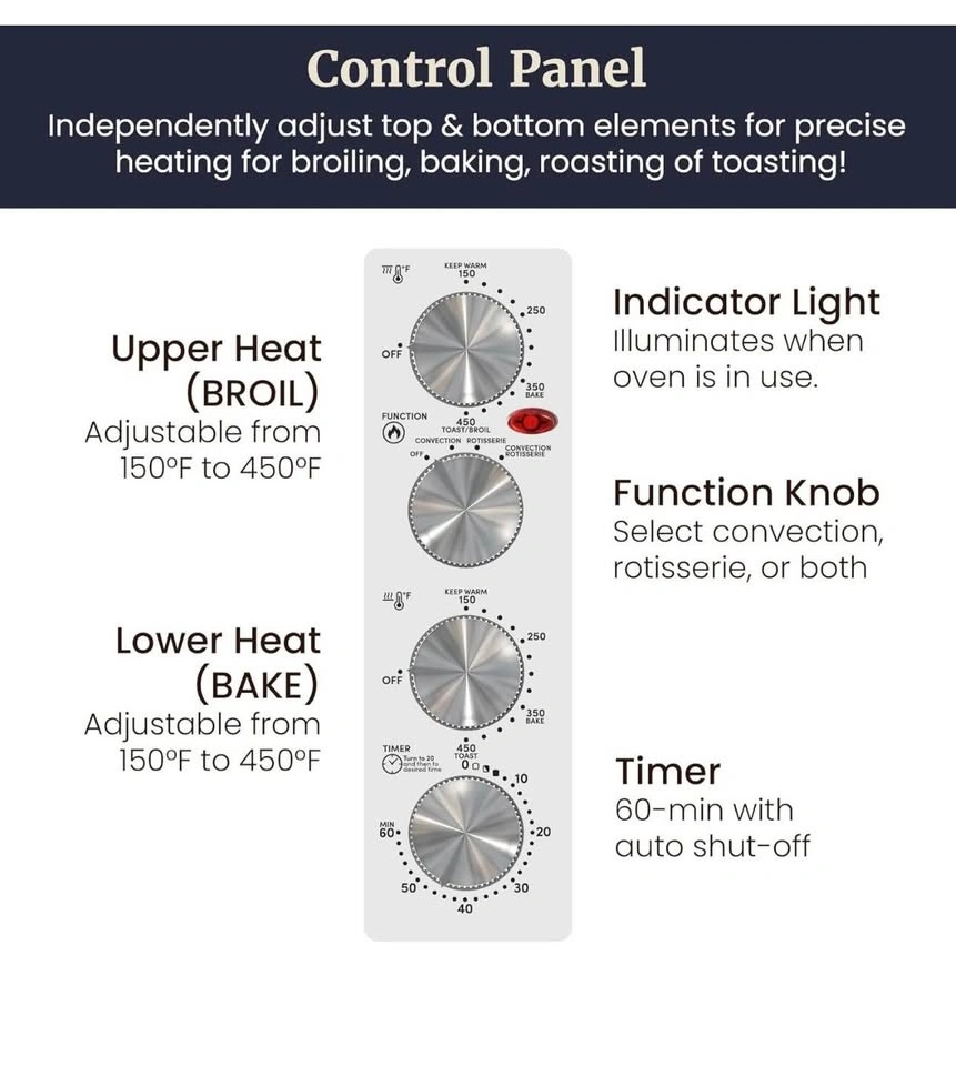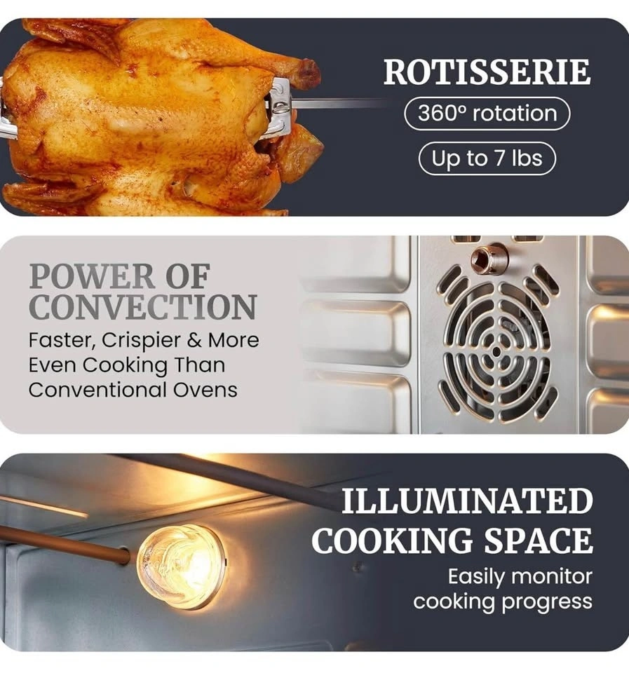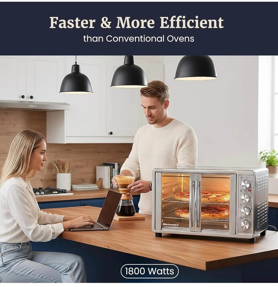 Spacious Elite Gourmet countertop convection oven in good condition. Perfect for roasting, baking, toasting, broiling, and cooking family-size meals. The large interior fits a whole chicken, pizza, casseroles, and multiple dishes at once. Back corner dented and one tire missing.