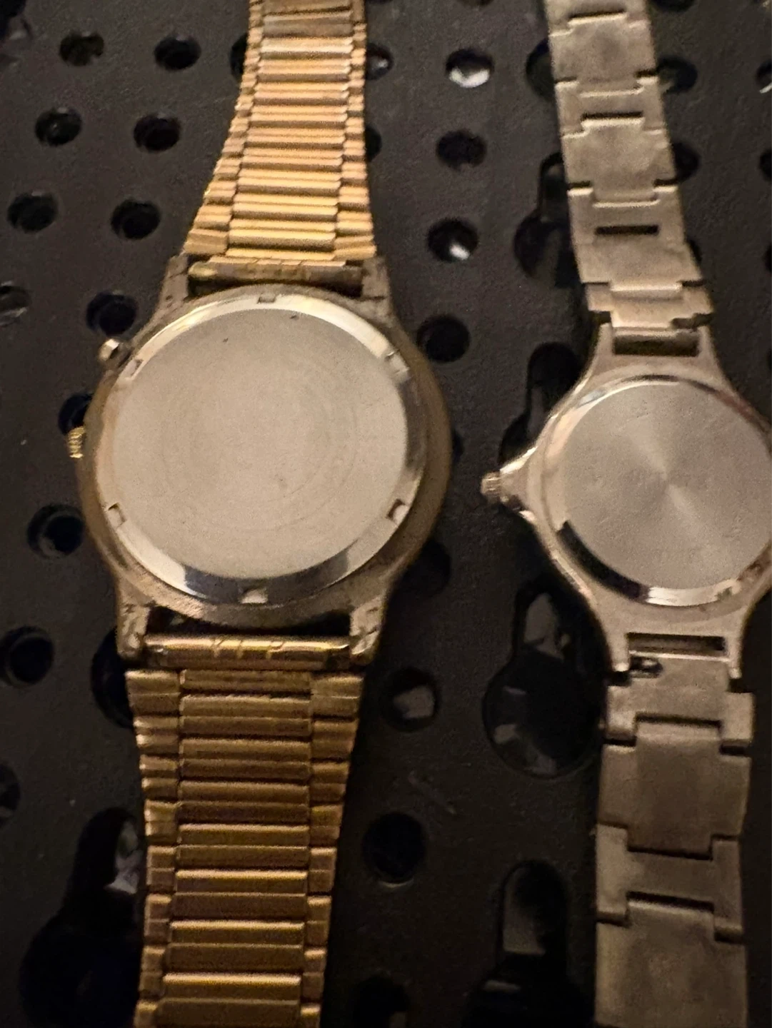 vintage ladies' watches. One is a gold-tone Wittnauer with a rectangular face and patterned band. The other is a silver-tone Fred Belsey with a decorative bezel and metal band. Both are quartz movements and labelled "Japan Movt".