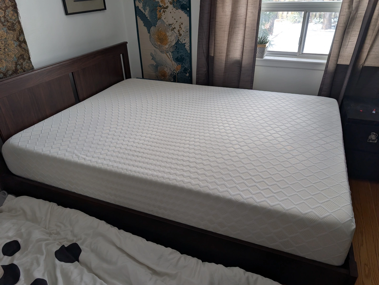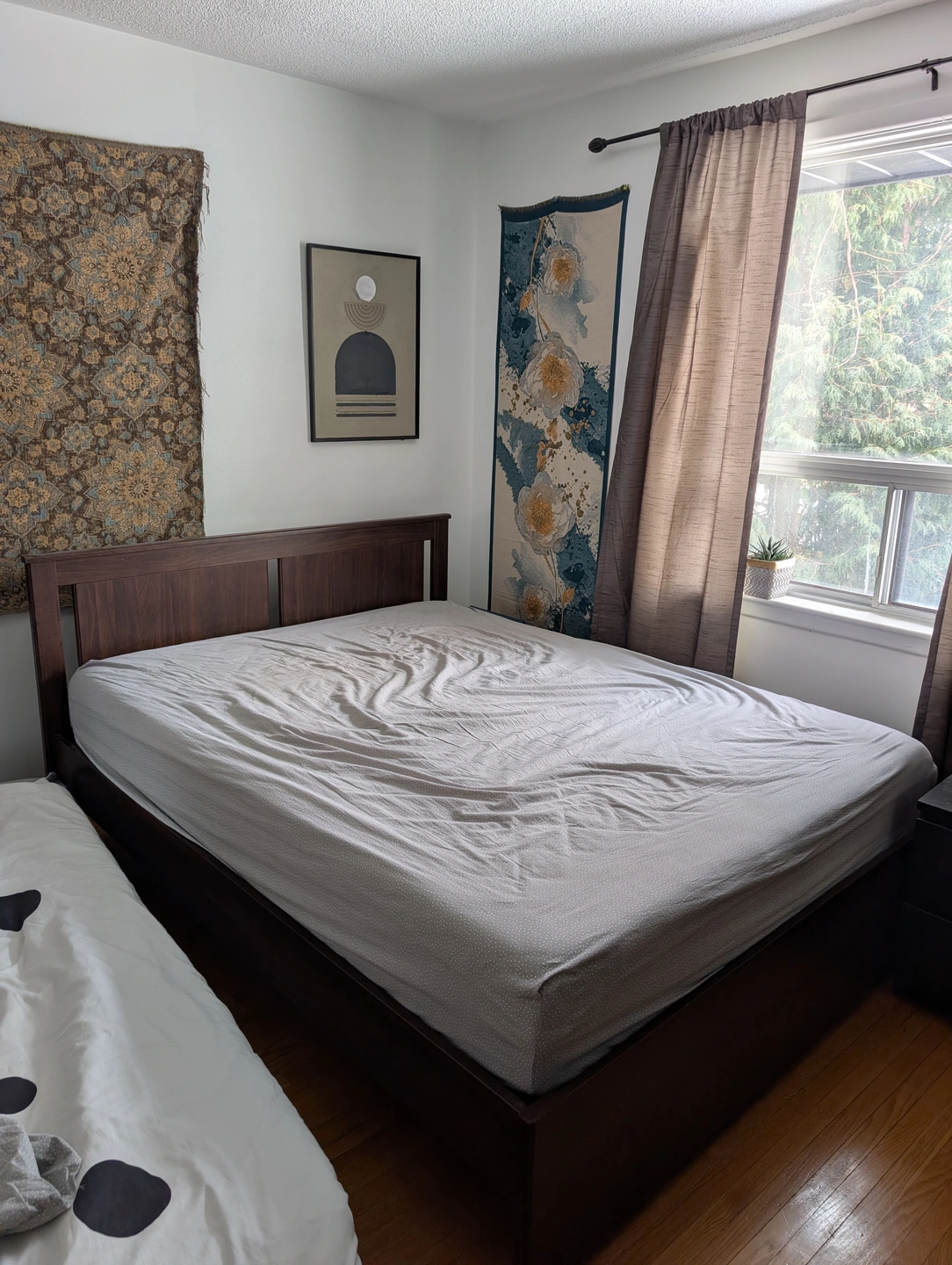 Ikea Songesand Queen sized frame in brown, Luroy slats, and a good condition 10" firm Ashley Signature Design memory foam mattress.