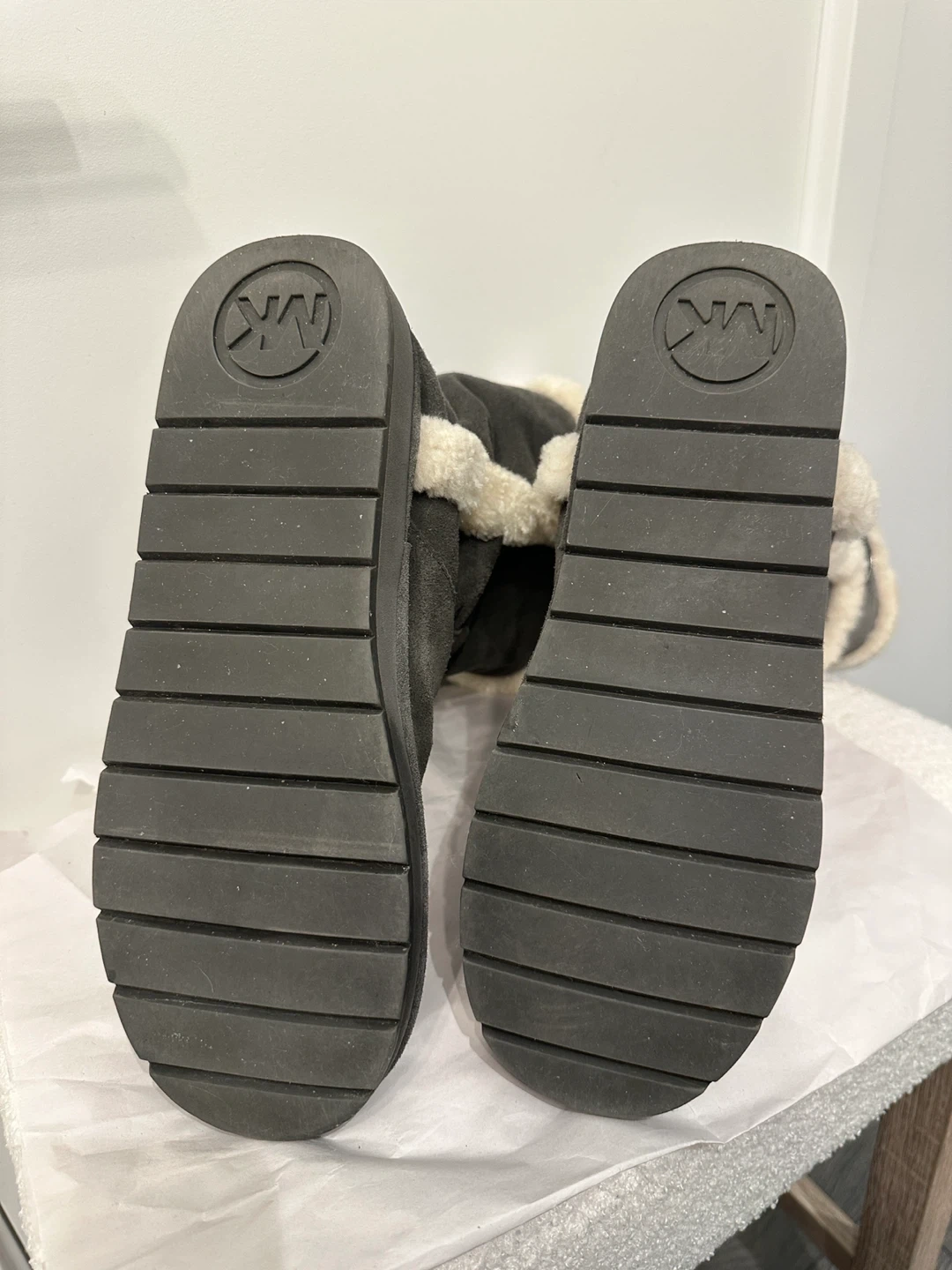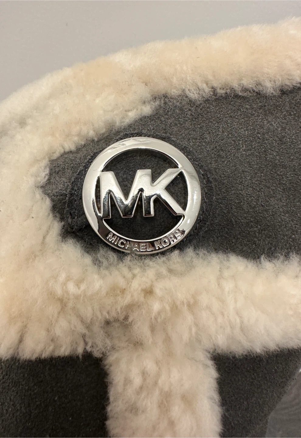 Stylish Michael Kors boots crafted from grey suede with cozy shearling trim. These mid-calf boots are perfect for keeping warm and looking fashionable during cooler months.