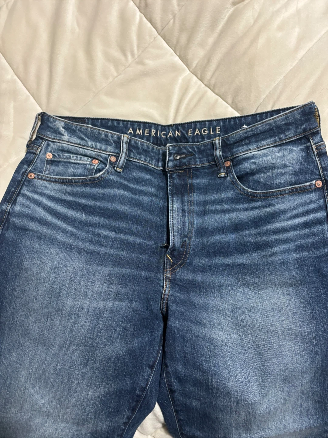 American Eagle men's jeans in a classic blue wash. They're made with 79% cotton, 19% polyester, and 2% elastane for a comfortable stretch. Size 33x32. These jeans are ready for everyday wear!